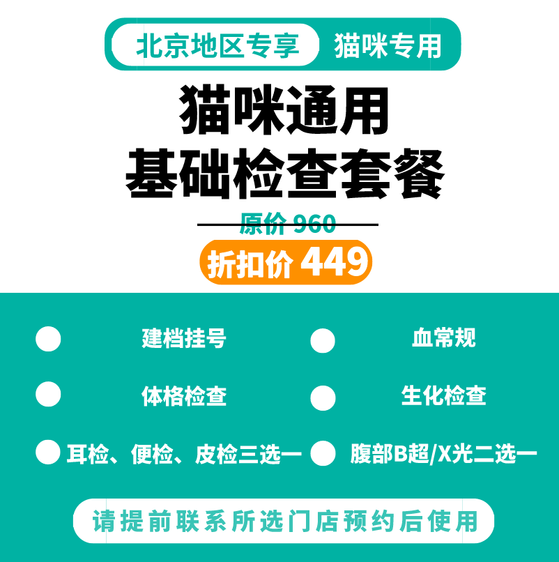 【北京地区可用】 猫咪基础检查套餐 体格基础查体+血常规+全腹B超/X光二选一+生化检查+显微镜检三选一