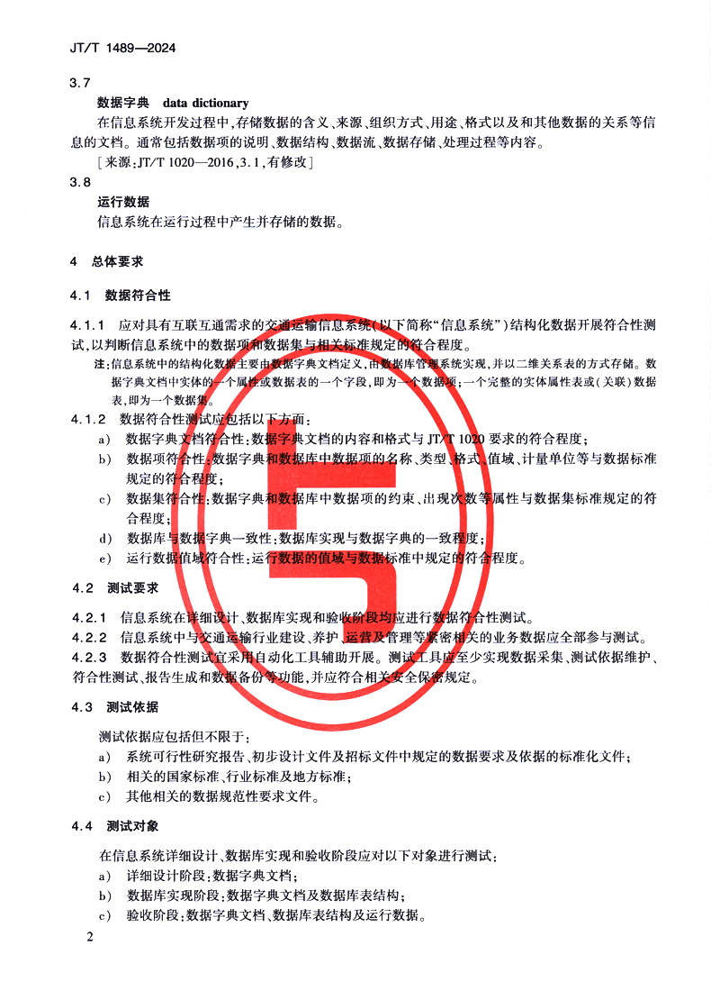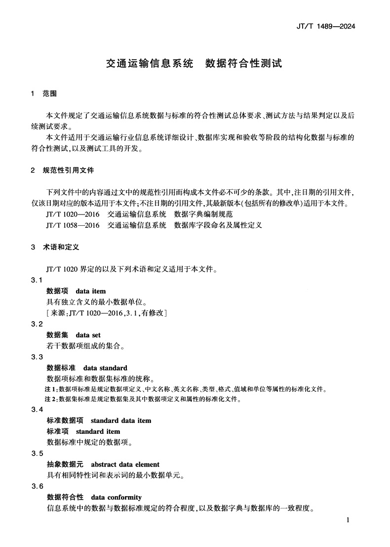 交通运输信息系统 数据符合性测试(JT/T1489—2024)