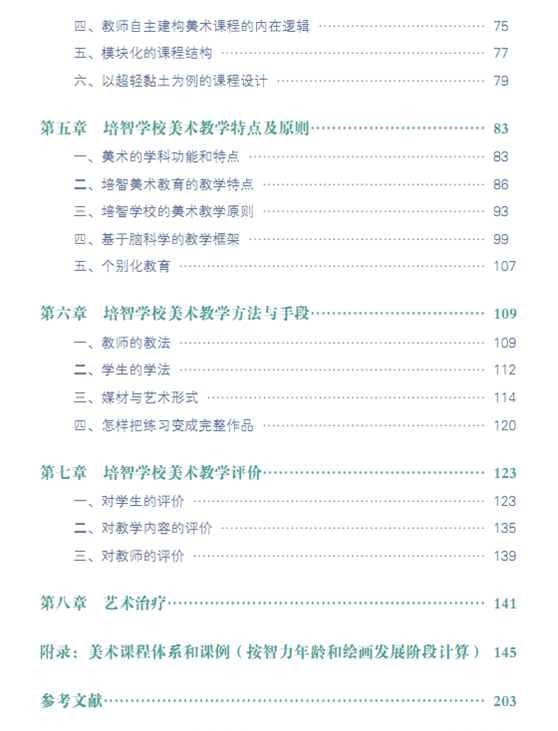 全书可以分为两个部分,篇幅较长的前面部分主要介绍“教案表”中各个单元格背后的支持,有对皮亚杰和罗恩菲尔德的解读、对国家培智学校义务教育课程标准的解读、对3-6岁儿童发展纲要的解读,当然还有对美术专业本身的解读;后一个部分展示了大量的“教案表”实例,演示在各种情境中如何使用这张表进行教学。