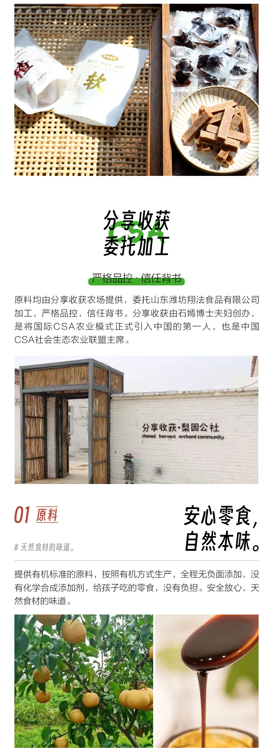 【配料】:有机麦芽糖,有机白砂糖,有机秋梨膏20%,卡拉胶(又名海藻胶,符合有机食品国标) 【产地】:河北石家庄 【产品标准号】:SB/T 10021 【食品生产许可证编号】:SC11713013300341 【被委托企业】:赵县雪香食品有限公司 【地址】:河北省石家庄市赵县北李家瞳村 【储存方式】:阴凉干燥处密封保存 【净重】:150g/罐 【生产日期】:见包装 【保质期】:12个月 【食用方法】:开袋即食 |