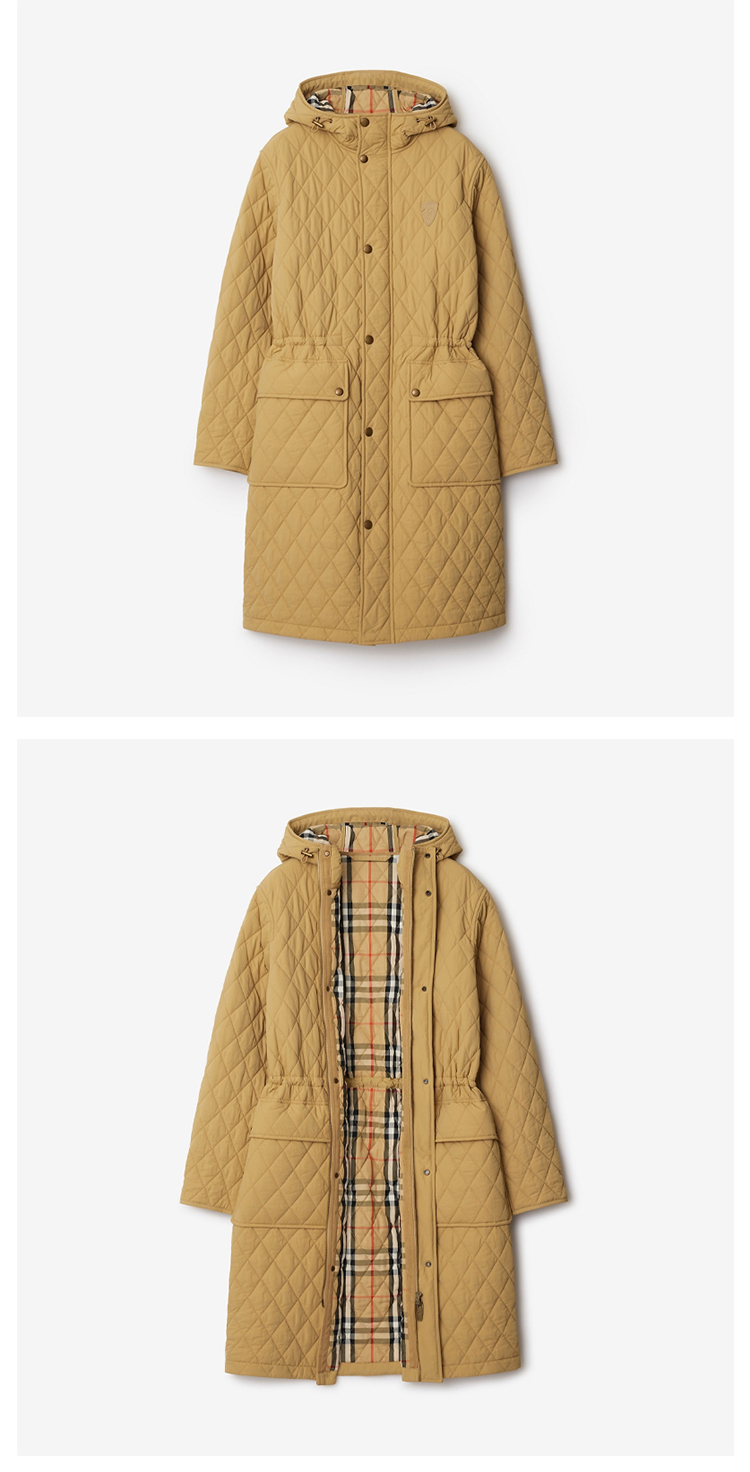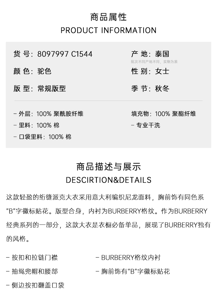【一】BURBERRY 巴宝莉 女士 B 字型盾牌贴花绗缝尼龙风雪大衣棉服 驼色 8097997 C1544
