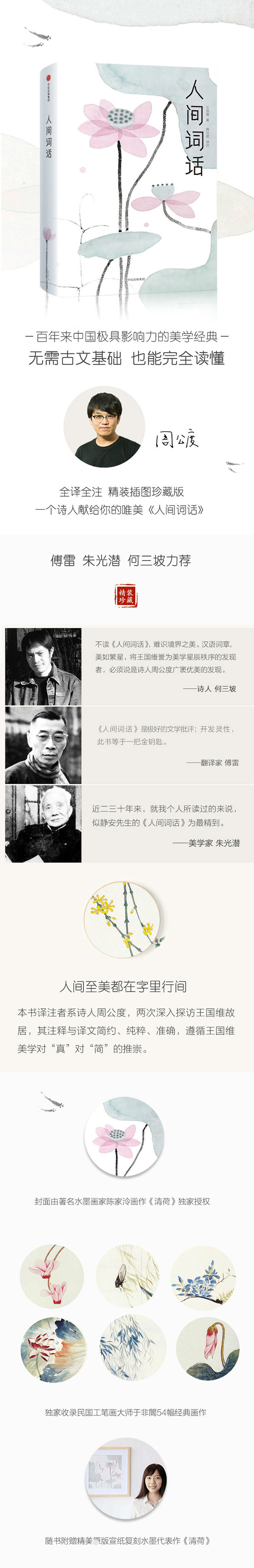 ◆ “感谢作家榜致敬经典名著小组编辑赵如冰女士。她专业而苛刻的态度,使我得以用更高的标准完善此书的校订与译注。感谢导演贾樟柯先生的宽阔,在封面画作授权时给予的帮助。感谢画家陈家泠先生的慷慨,一幅名动杭州G20峰会的《清荷》,锦上添花,有无言点睛之相契。感谢作家韩寒的妙译与授权,没有一句更好的诗比‘斯人若彩虹,遇上方知有’更适合以三句情诗概括词之美学境界的王国维了。”——周公度