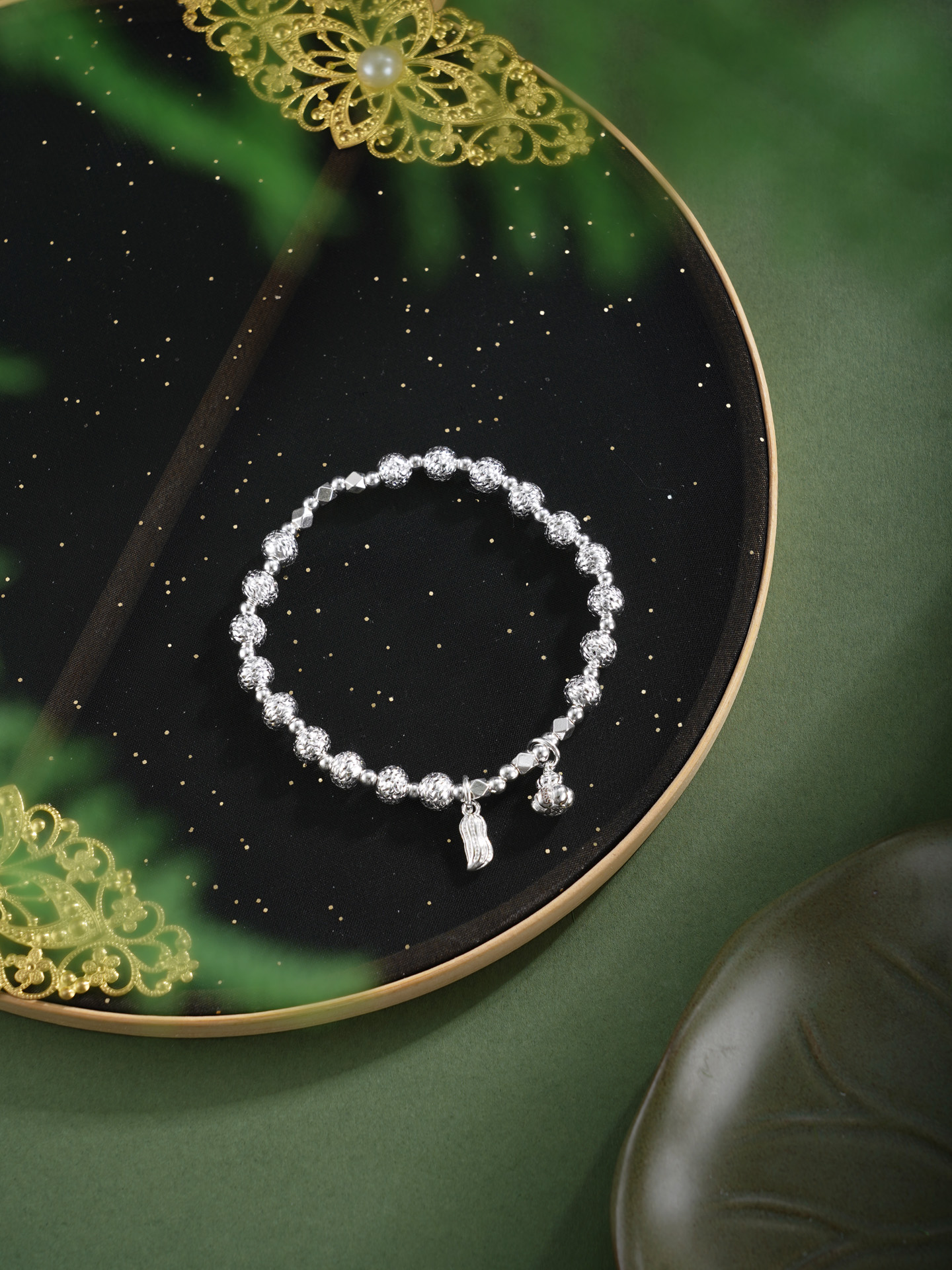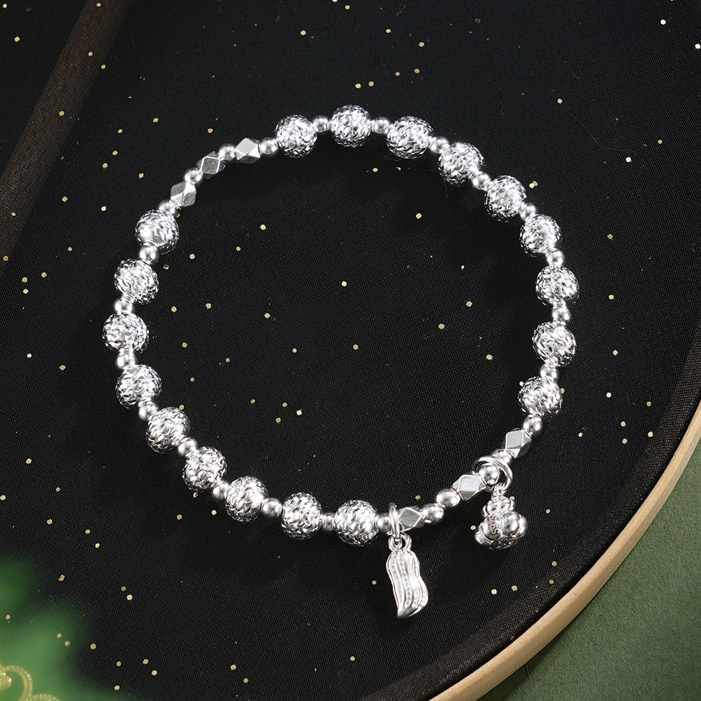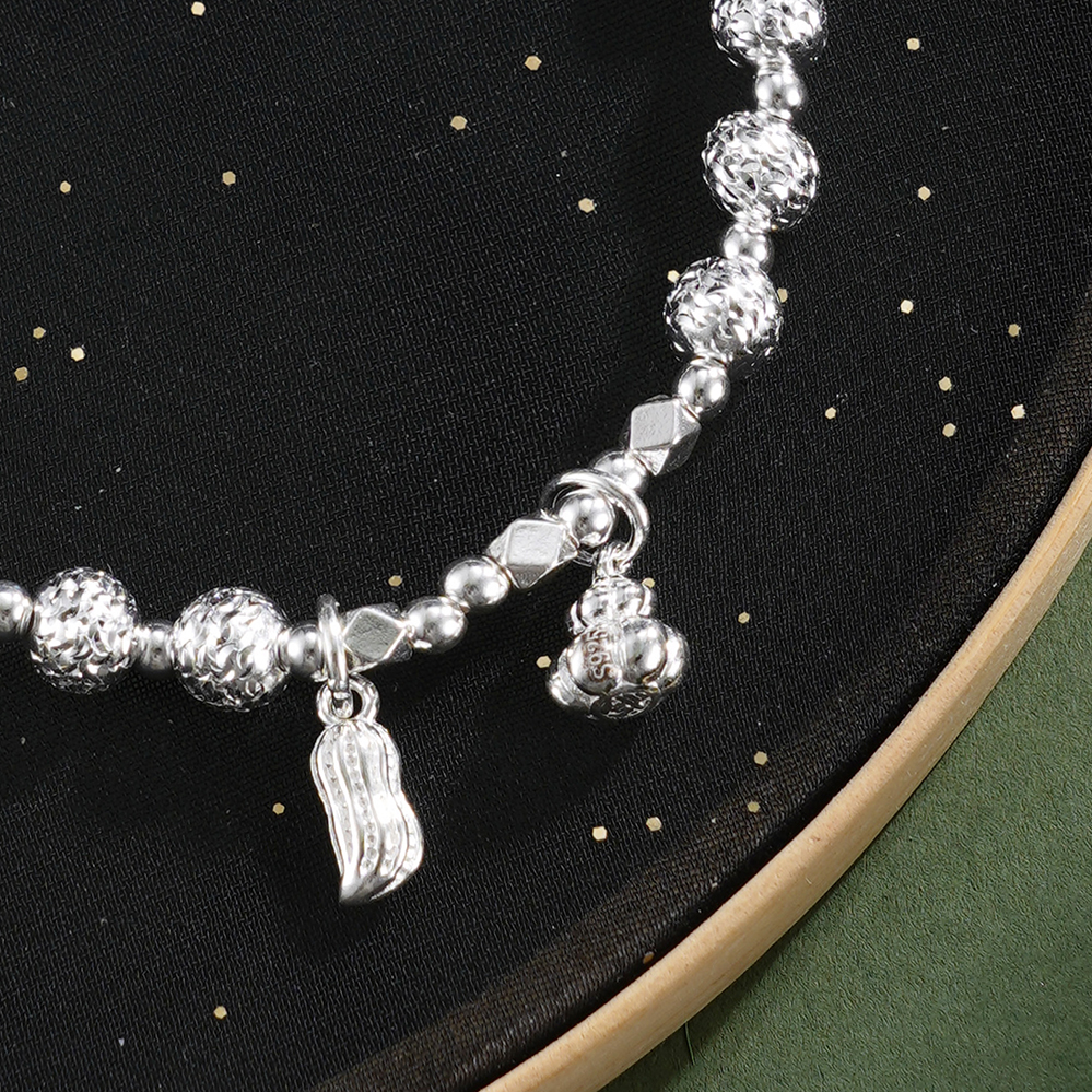 【寓意】:纯银手链点缀葫芦与花生坠饰,取“福禄花生”之吉谶。葫芦寓“福禄双全”,花生谐音“好事发生”,二者相合,寓意福泽绵长,喜事连连。