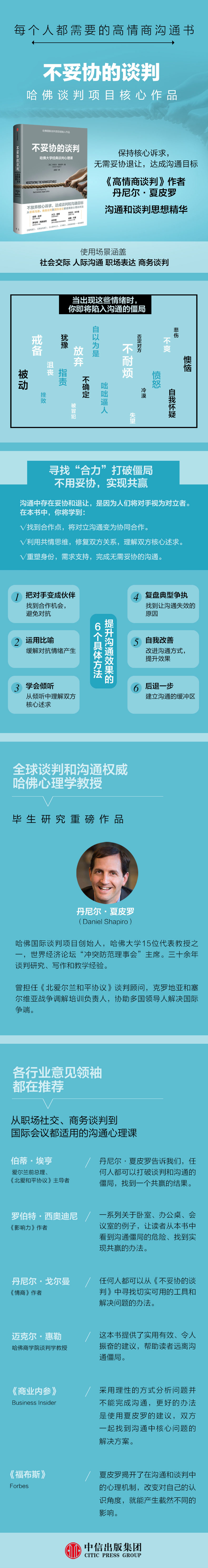 夏皮罗的这本书对避免谈判陷入僵局提供了实用、令人振奋的建议,可以帮助读者在生活和工作中达成“不妥协的谈判”。他的理论新颖且令人信服,极大推动了我们对谈判的认识和处理方法。