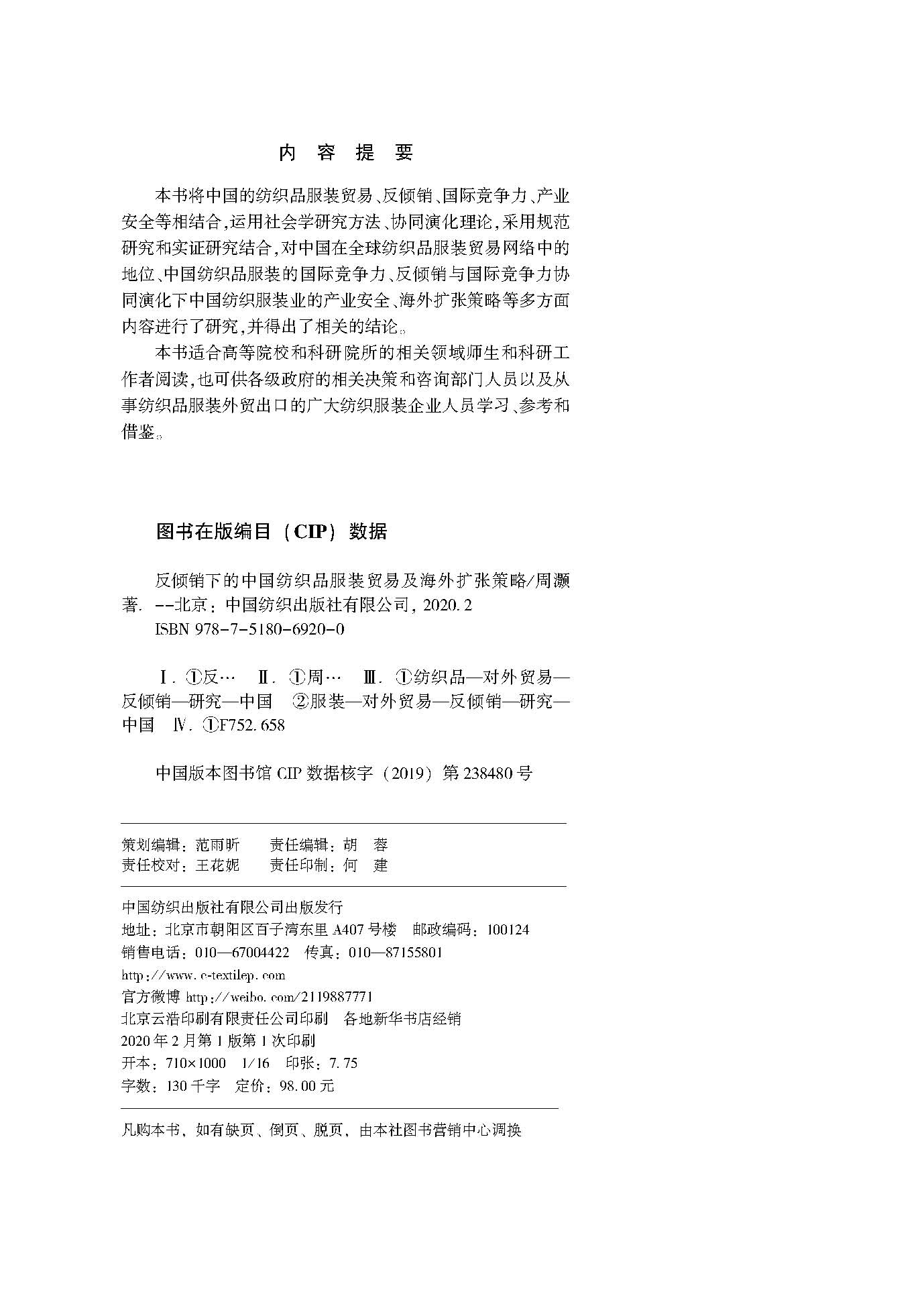 反倾销下的中国纺织品服装贸易及海外扩张策略 周灏 中国纺织品服装的国际竞争力 中国纺织服装业的产业安全 海外扩张策略研究书籍