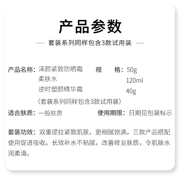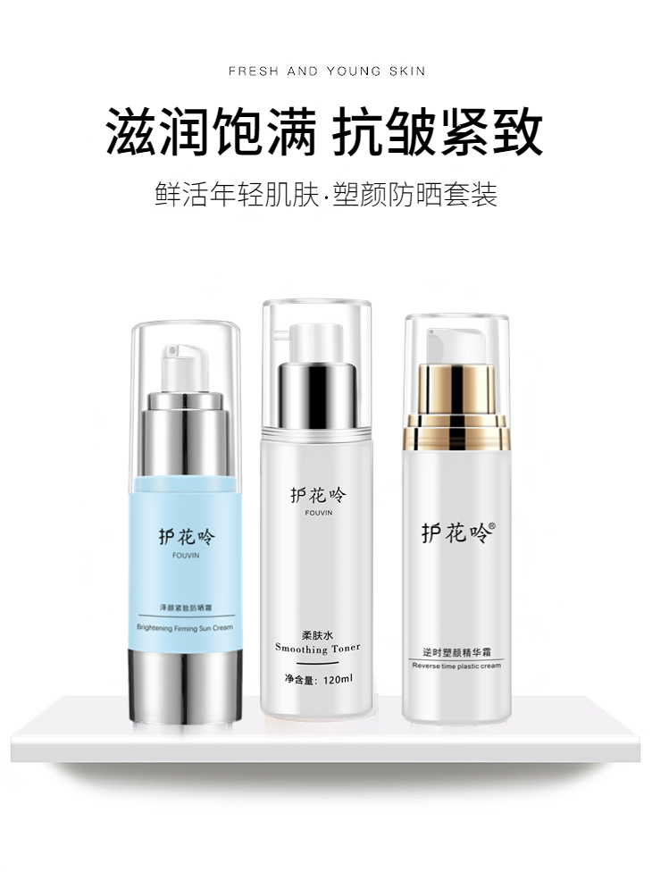 护花呤塑颜三件套(逆时塑颜精华霜+柔肤水+泽颜防晒霜)饱满紧致(原逆时塑颜套装)