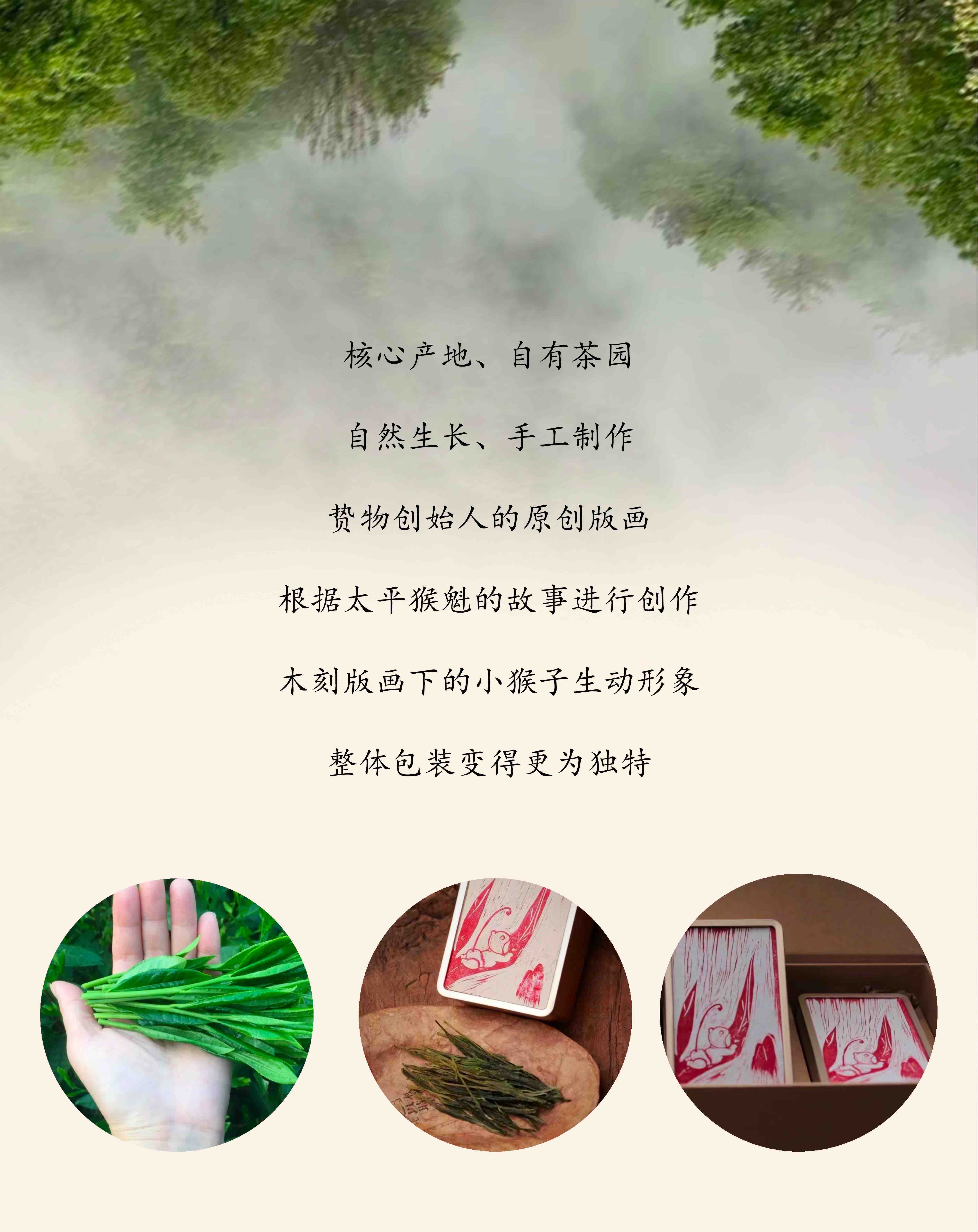 🐒传说太平猴魁为黄山神猴为报山民之恩所赐,品质超群,堪称魁首。贽物深耕黄山,得太平猴魁之妙,遂致力于将纯天然无添加的茶叶分享到现代都市,采摘、拣尖、杀青、理形、压制、烘干每一步的标准都严格考究,希望可以为每一位向往自然野趣的城市人带来一缕来自山野的芬香。