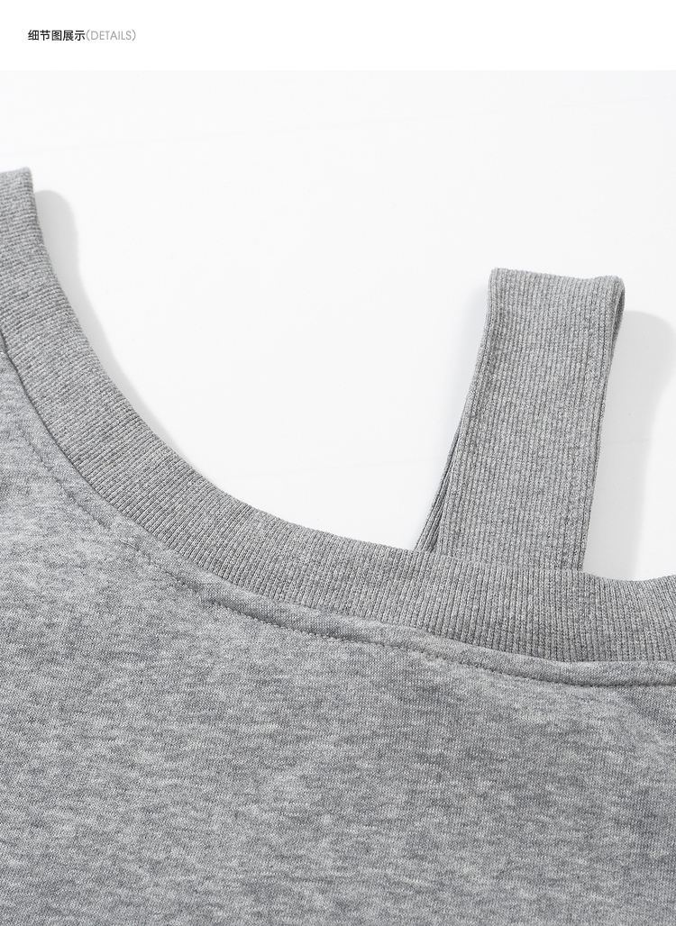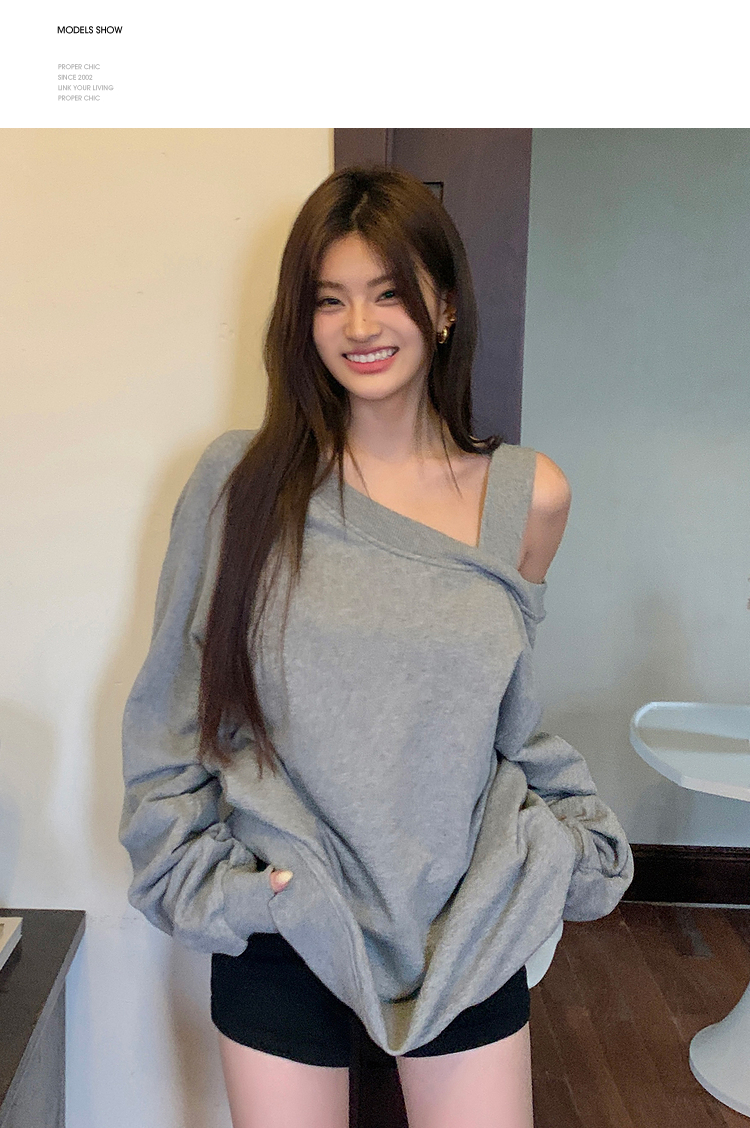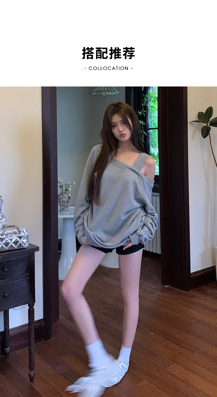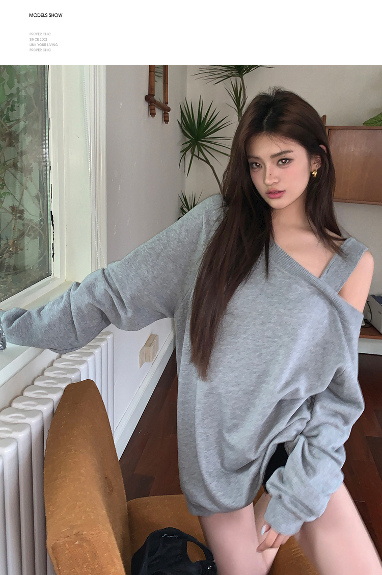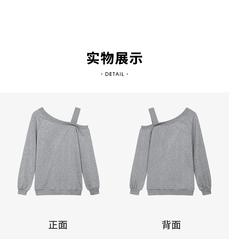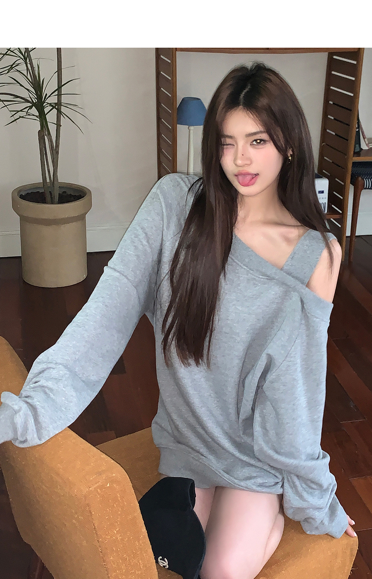 西遇斜肩灰色卫衣女秋季新款宽松套头小众长袖露肩慵懒上衣SS141054