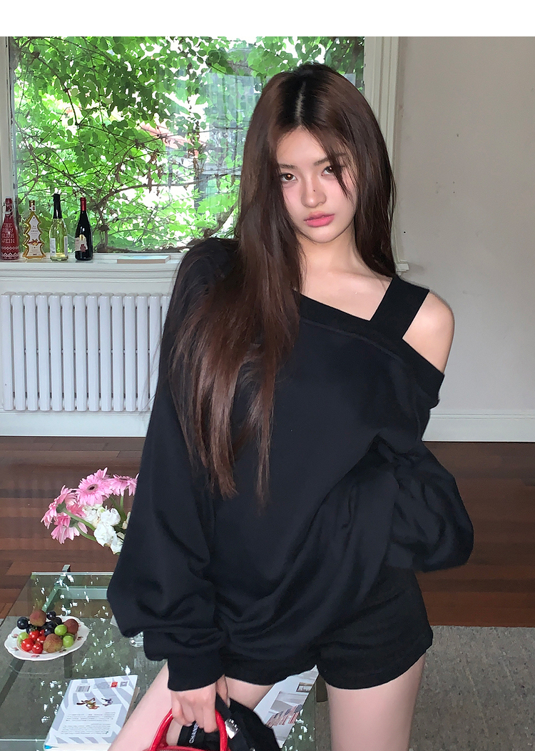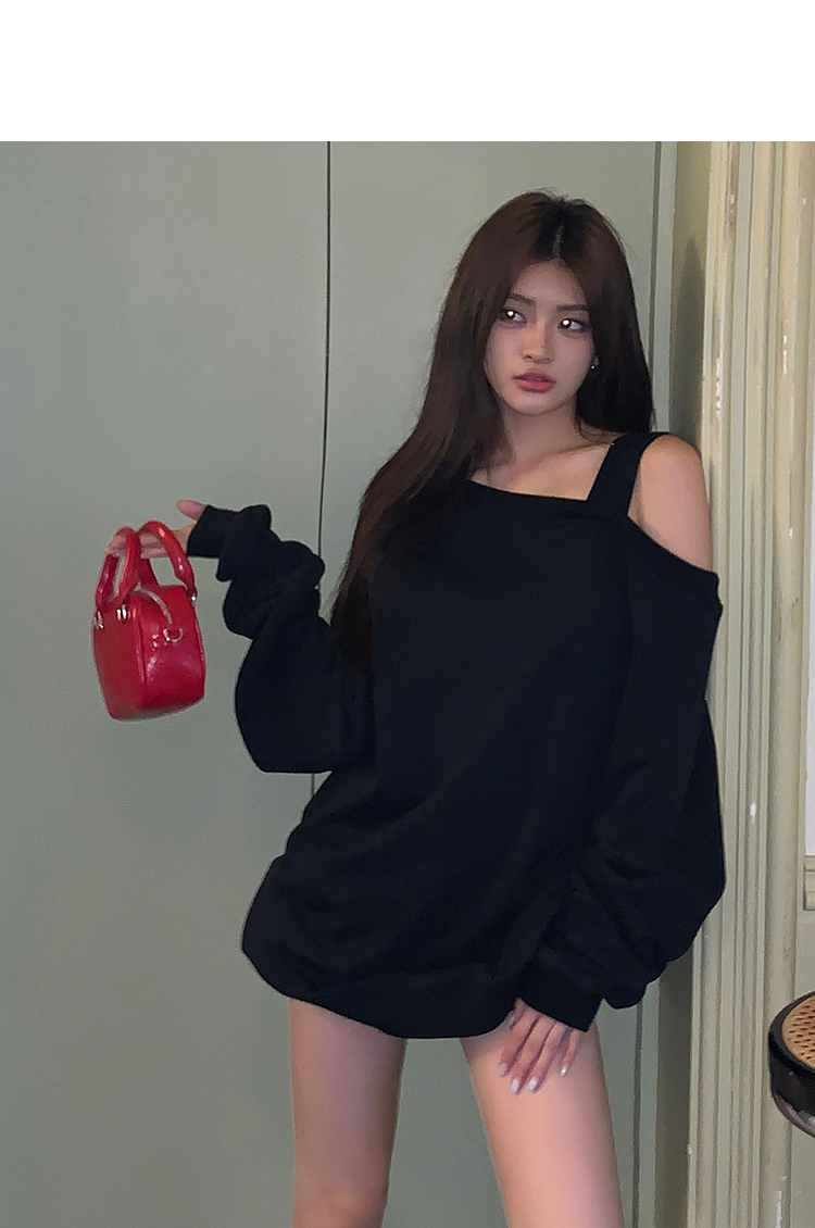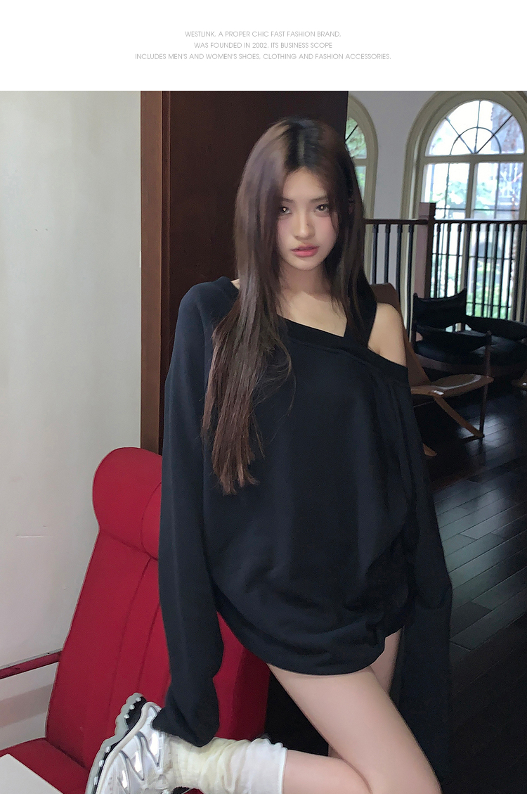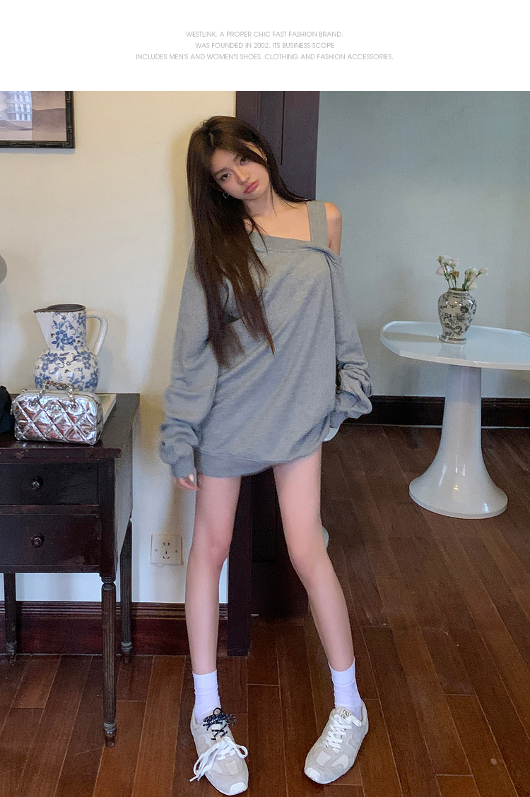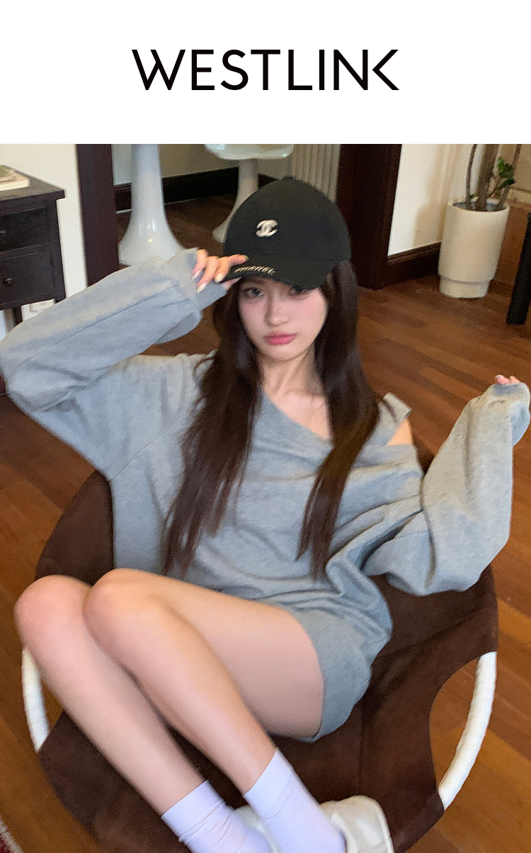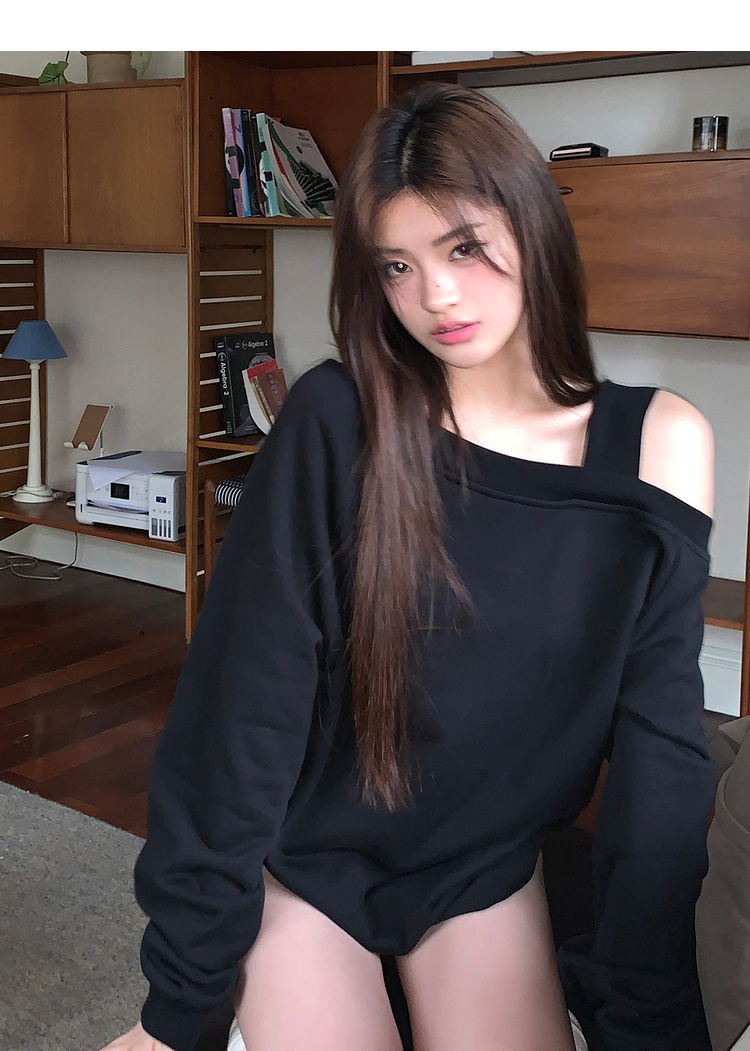 西遇斜肩灰色卫衣女秋季新款宽松套头小众长袖露肩慵懒上衣SS141054