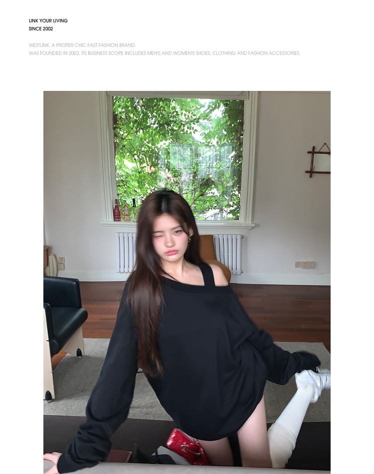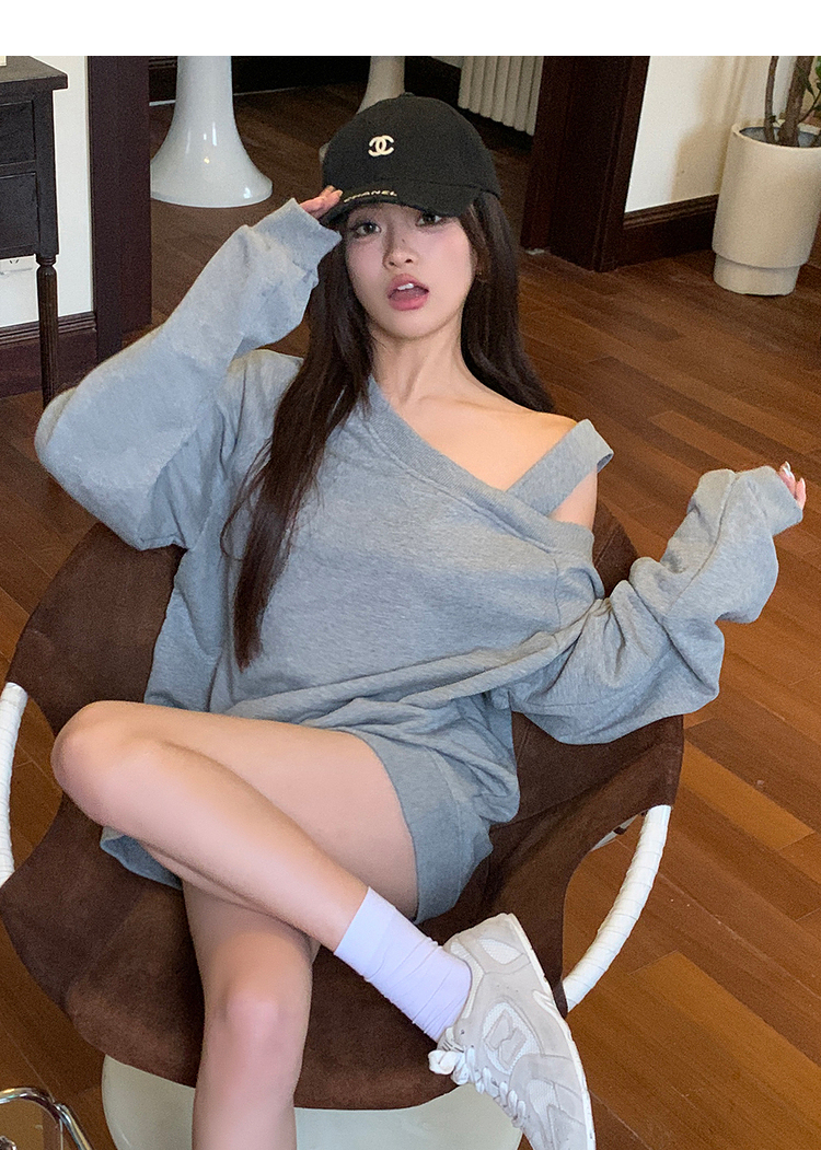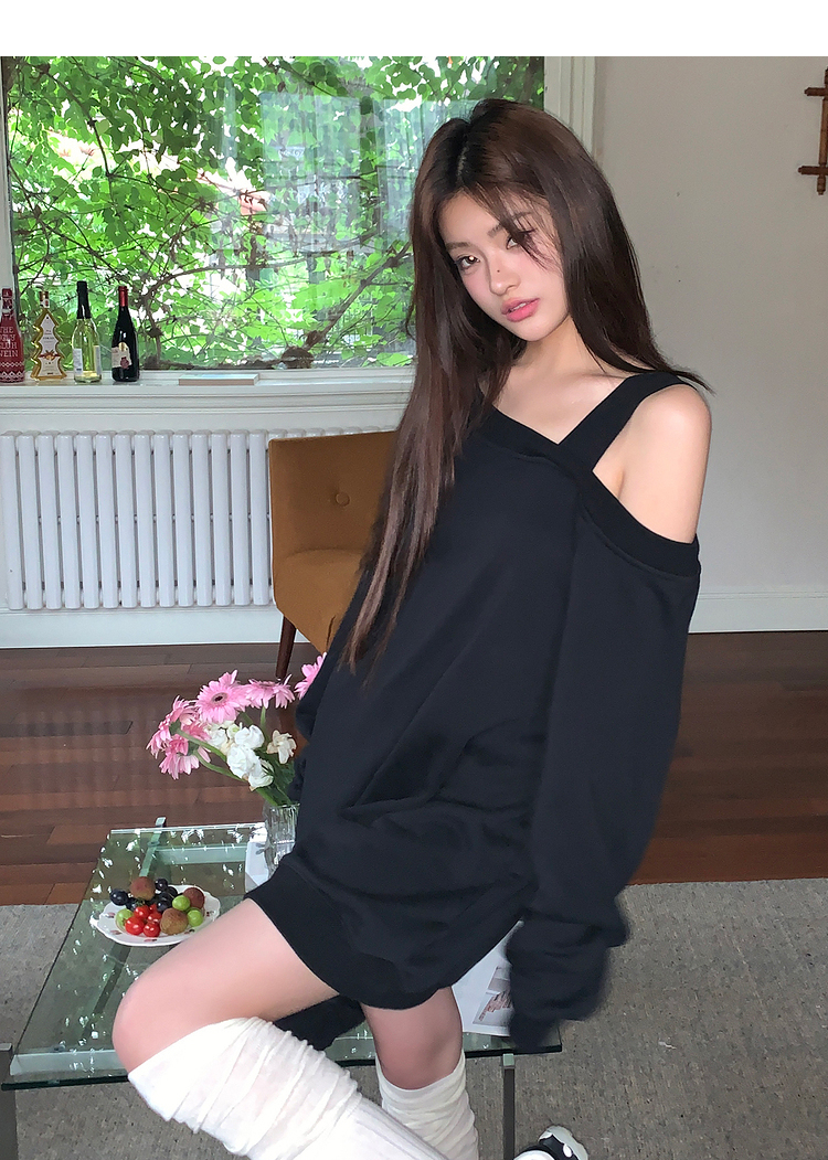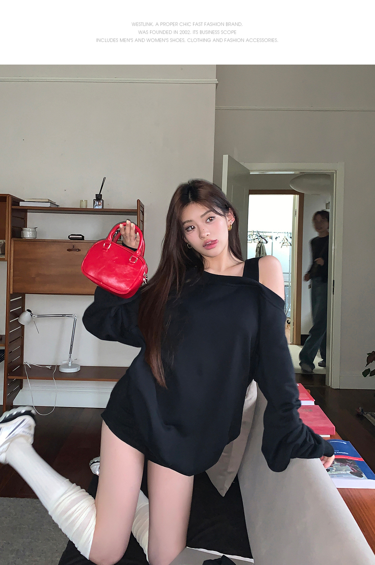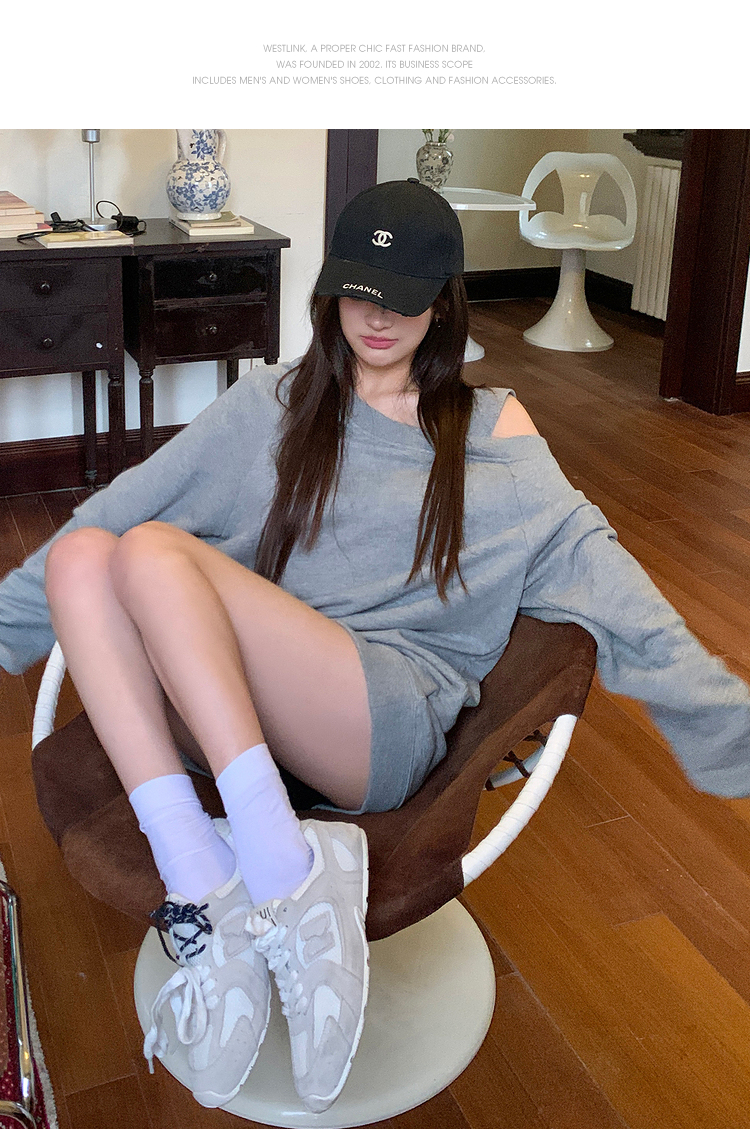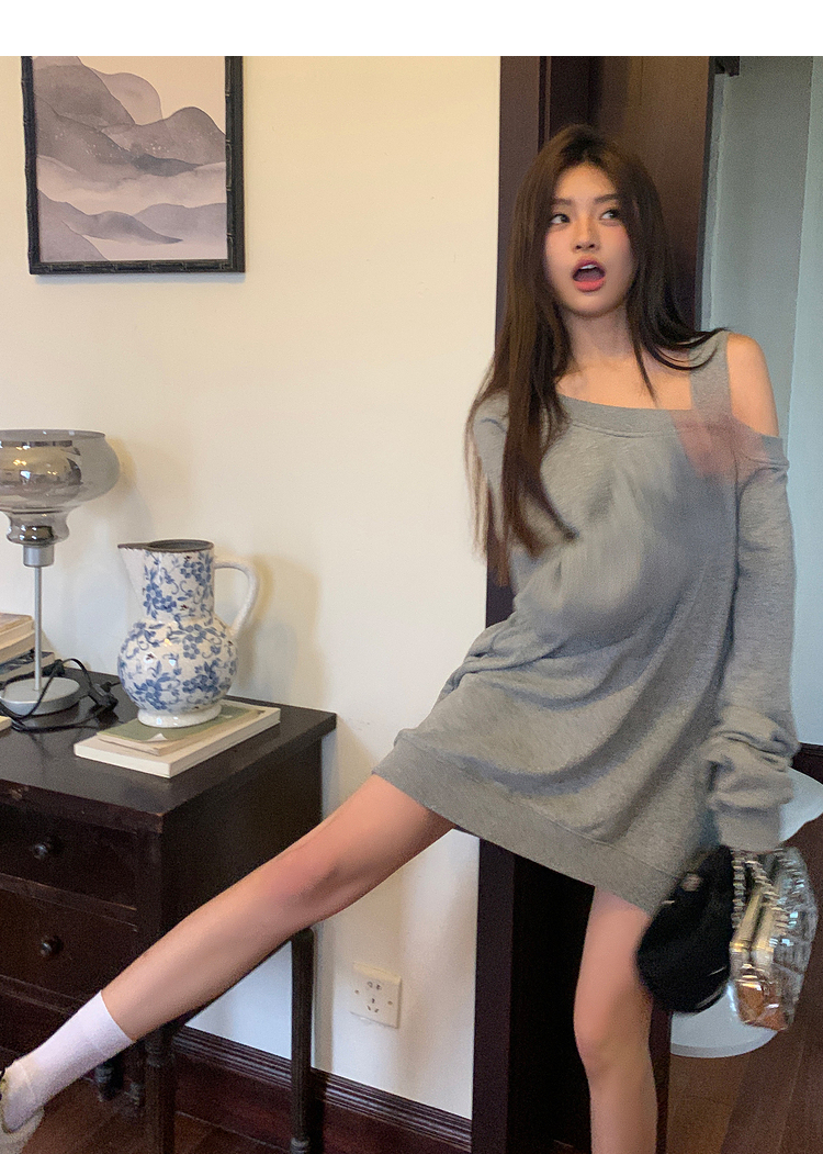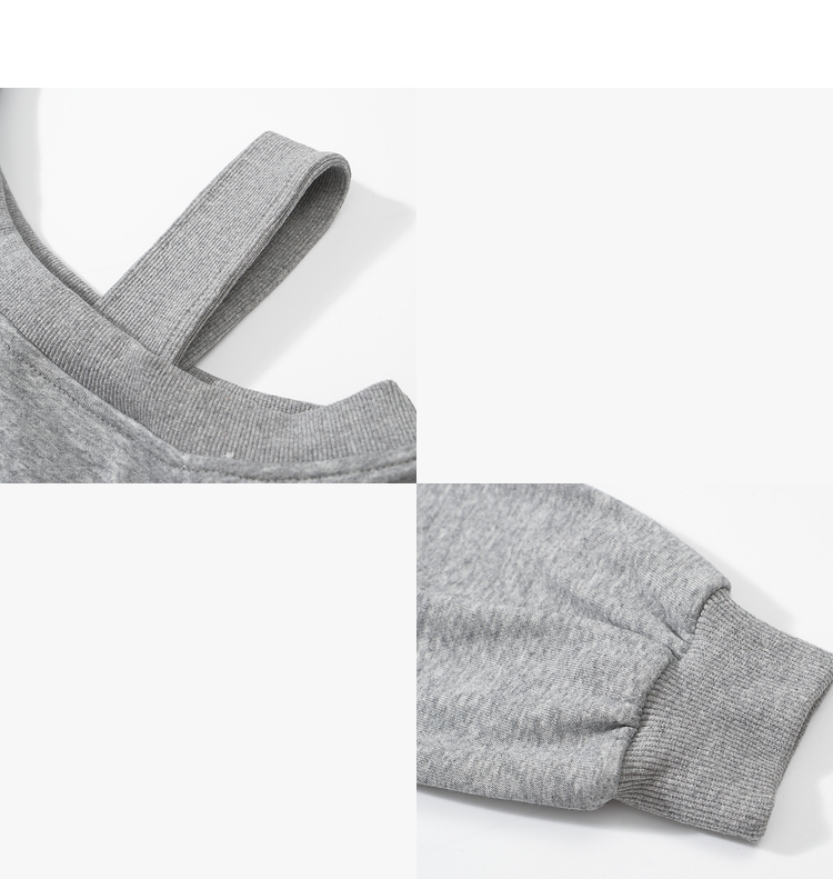 西遇斜肩灰色卫衣女秋季新款宽松套头小众长袖露肩慵懒上衣SS141054