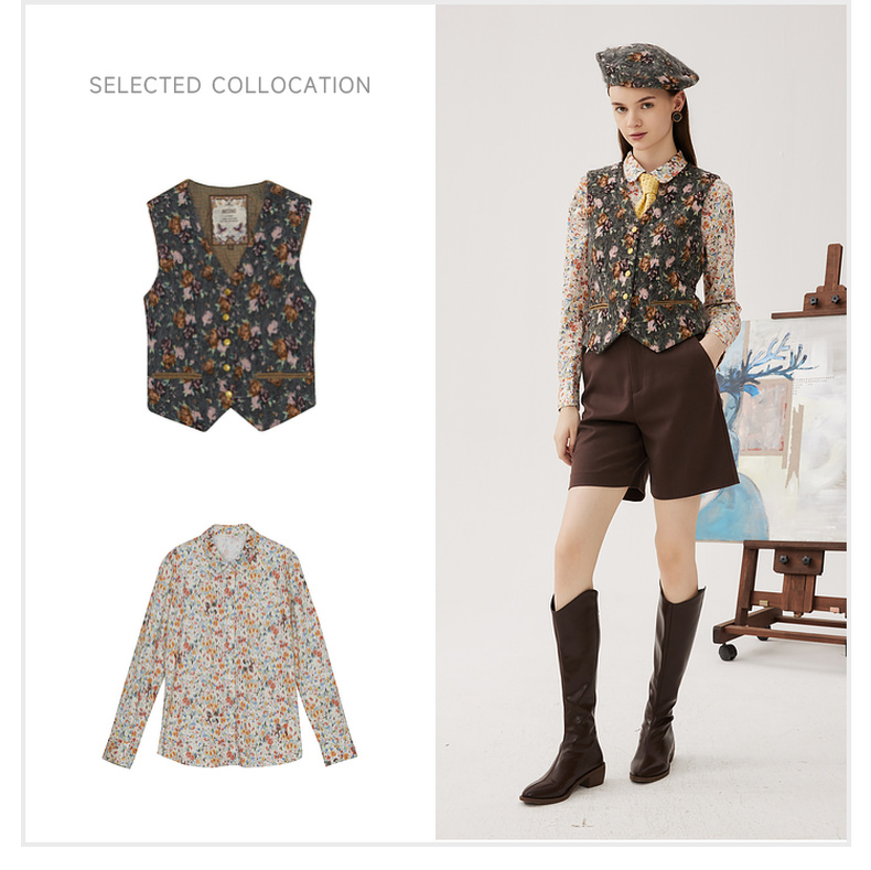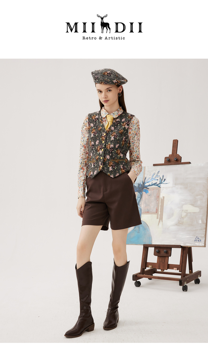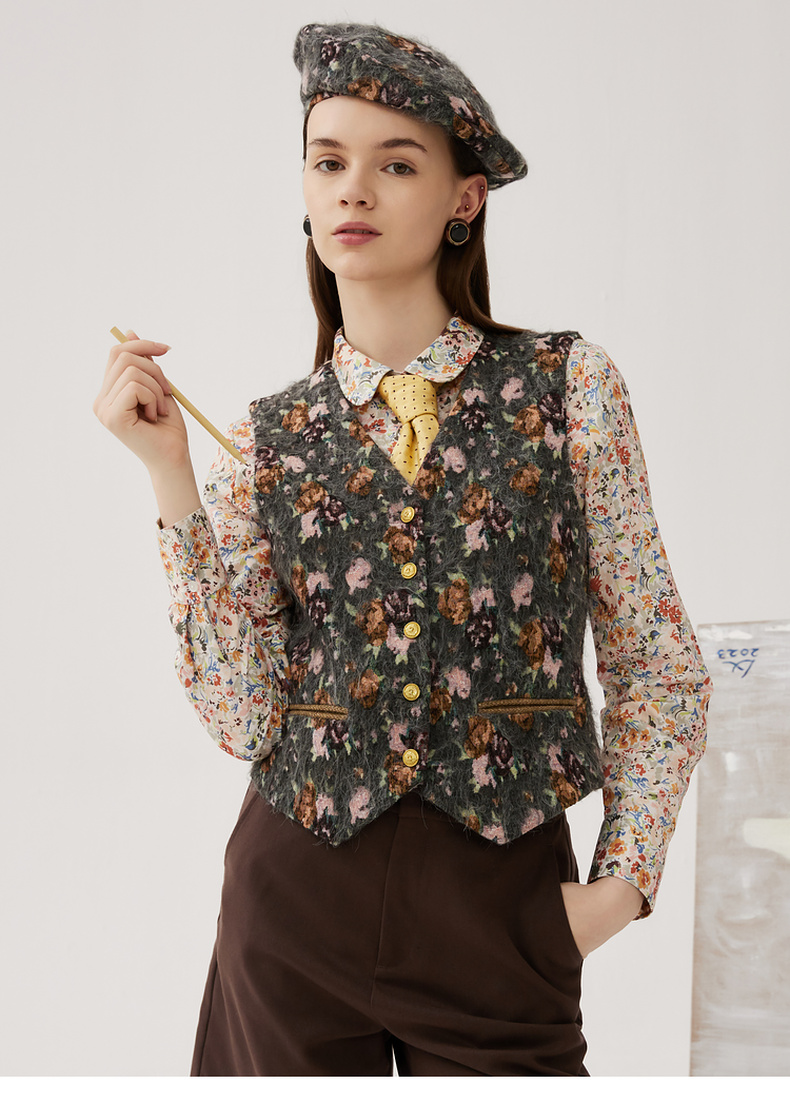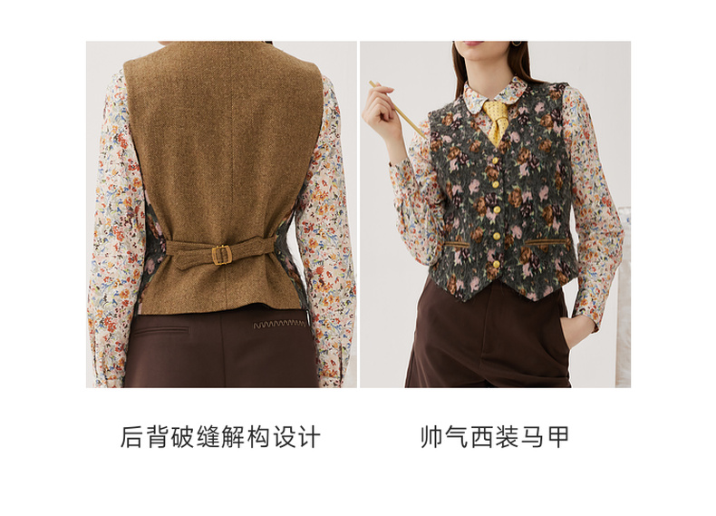 谜底花色马夹女2024秋新品复古风提花短款修身西装马甲243MM1085