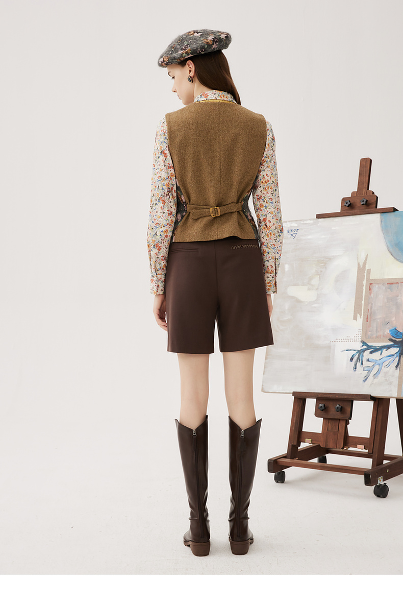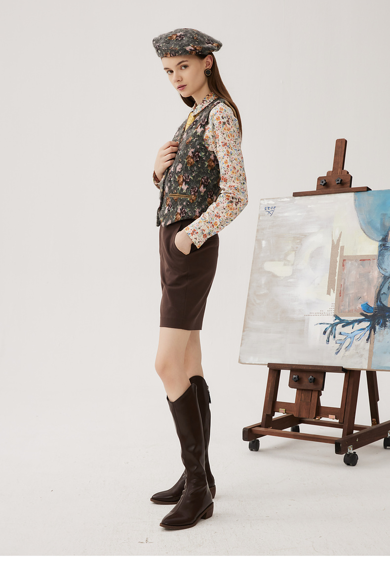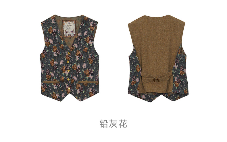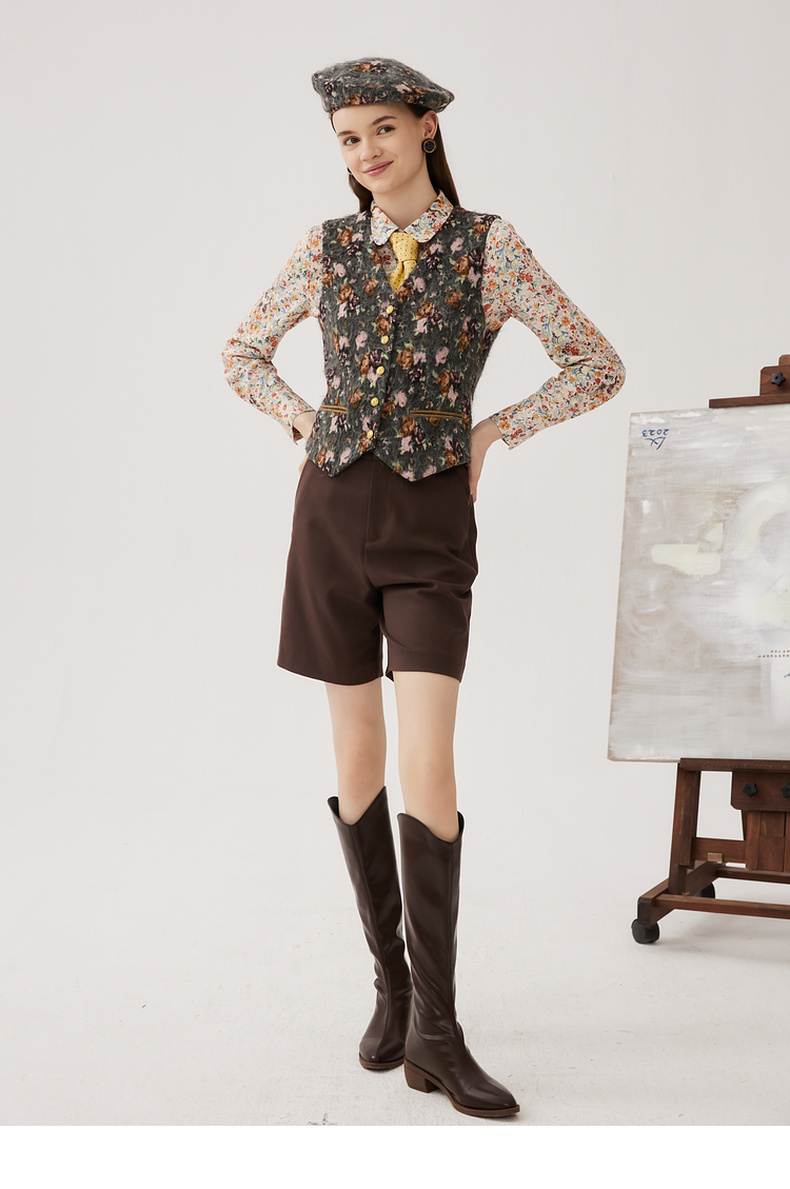 谜底花色马夹女2024秋新品复古风提花短款修身西装马甲243MM1085