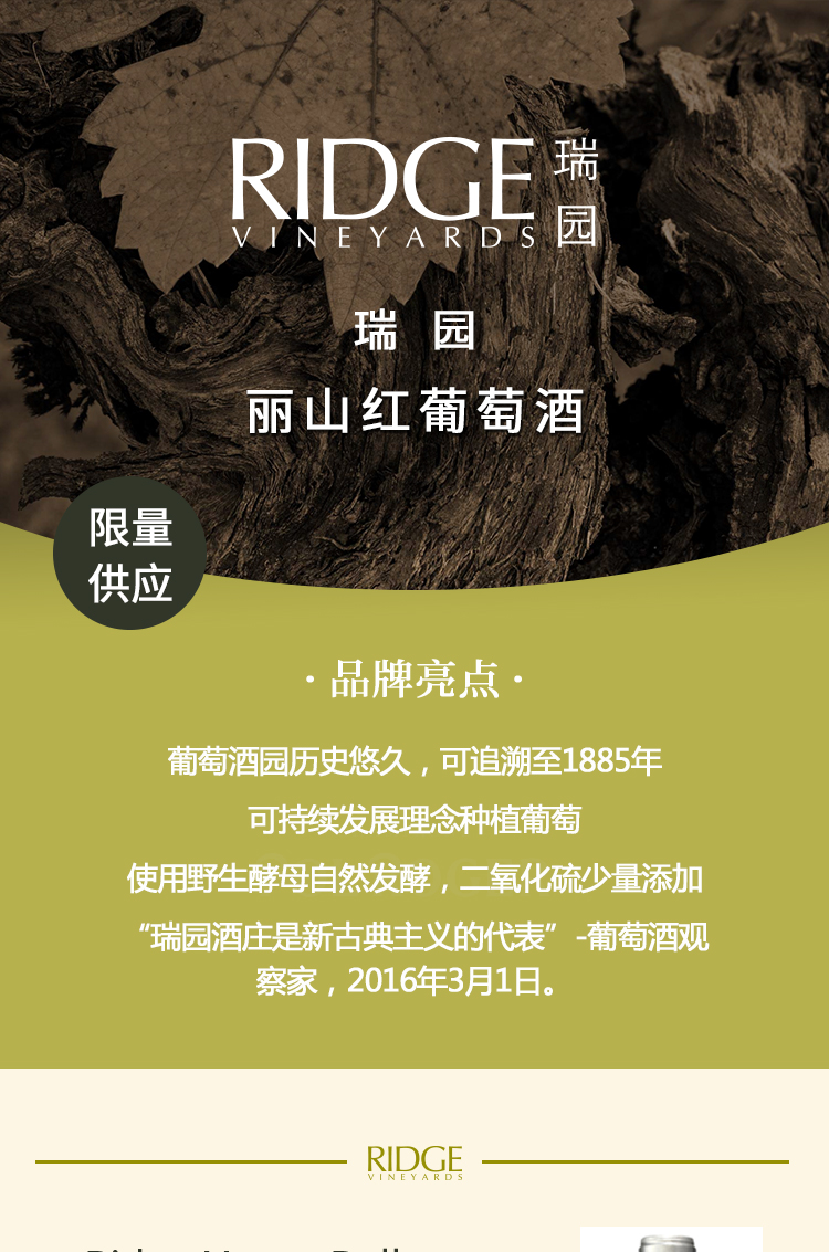 进口 美国 瑞园Ridge丽山红葡萄酒, 圣克鲁兹山 精选包邮