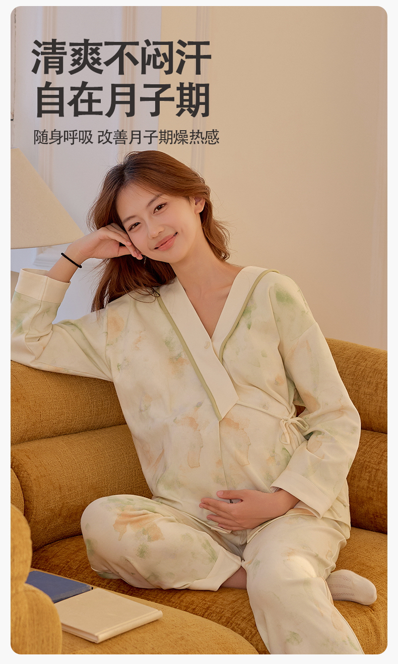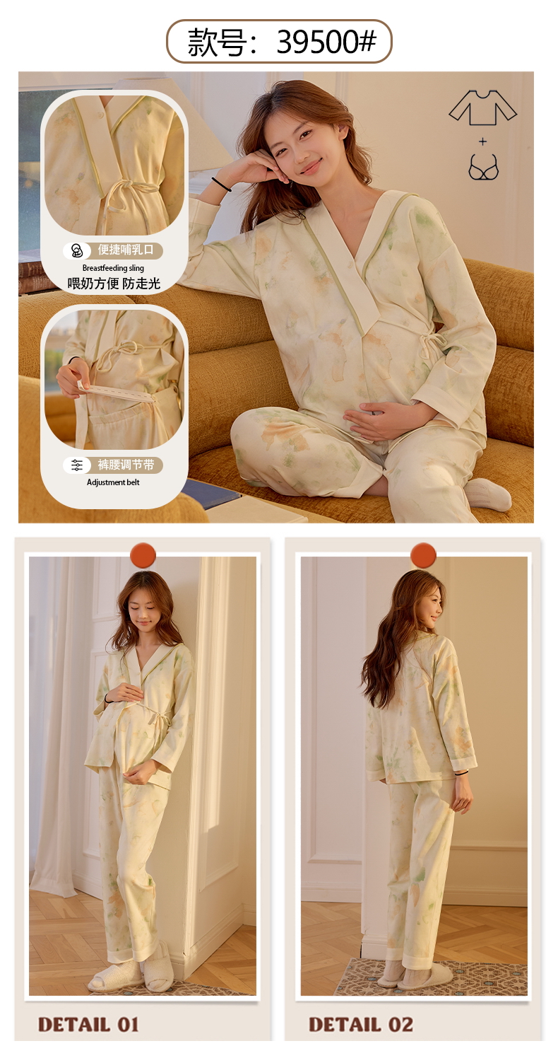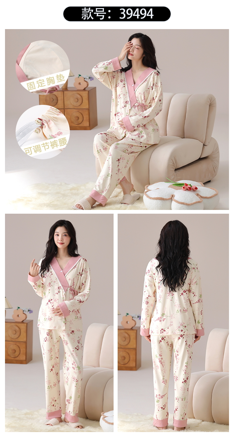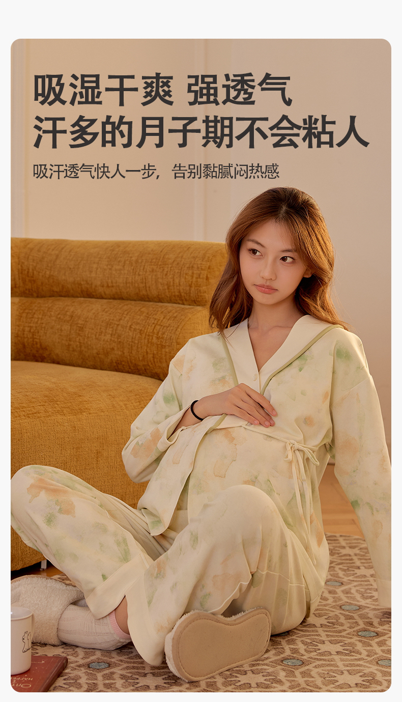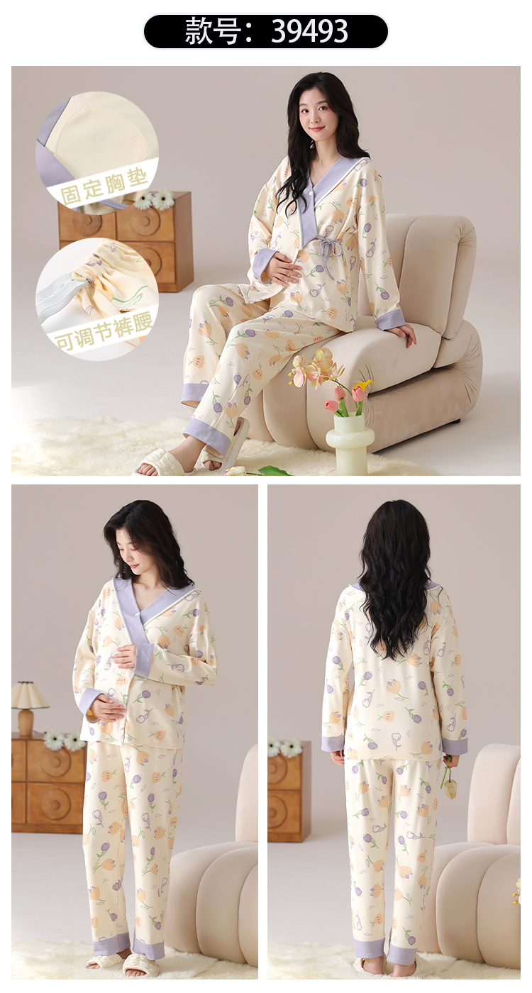 自然醒鸢尾牛奶丝系带月子服(带胸垫)秋冬产后纯棉11 10月份孕妇睡衣春秋季产妇待产哺乳QH