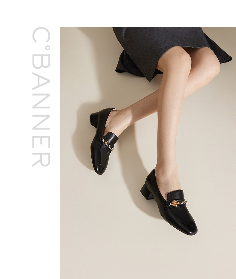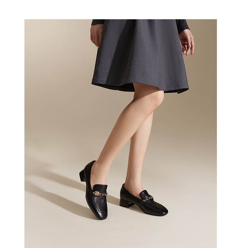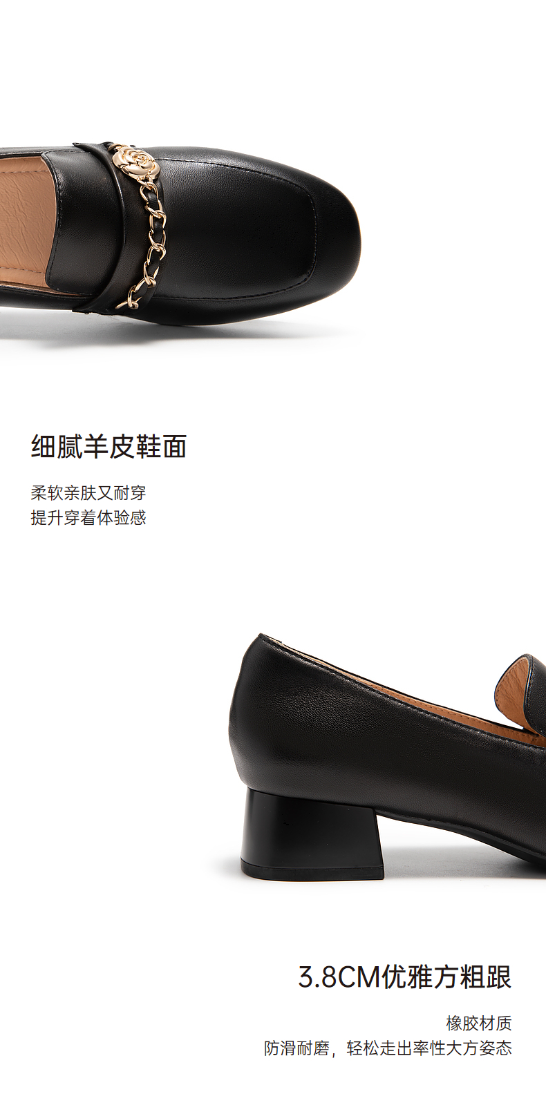 千百度经典羊皮乐福鞋女中跟通勤正装方头深口单鞋A25466106