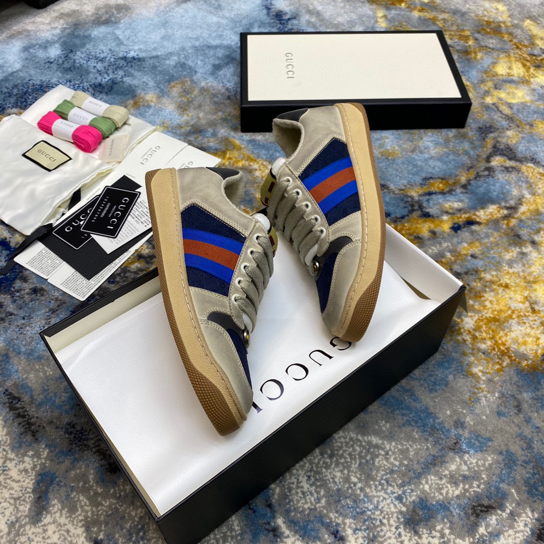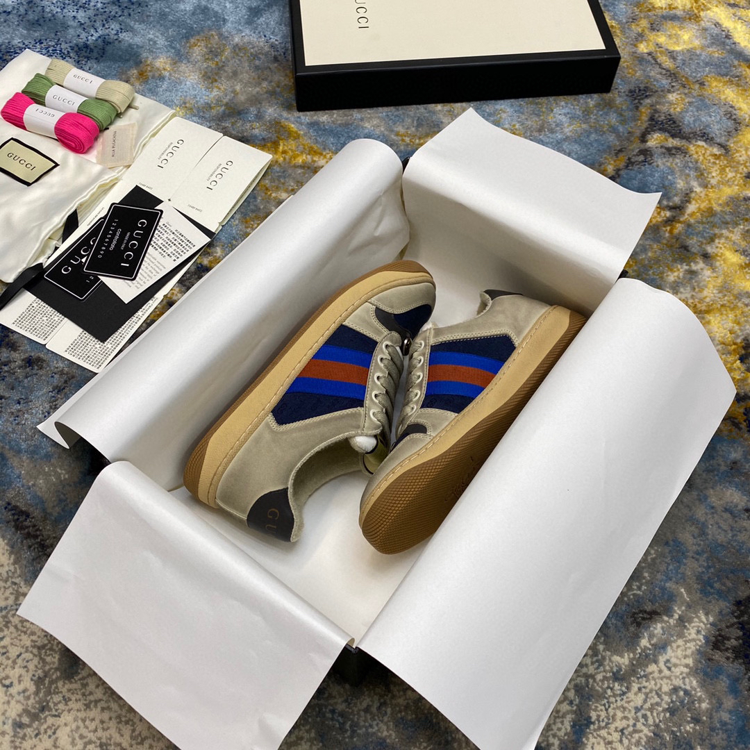 鞋面擦色牛皮拼接经典双G布面料,皮面切口全油边封口工艺,原版毛巾布里细腻柔软更舒适透气,垫脚乳胶注塑一体,私模钢印双色原版TPU大底(下层宽,上层窄)