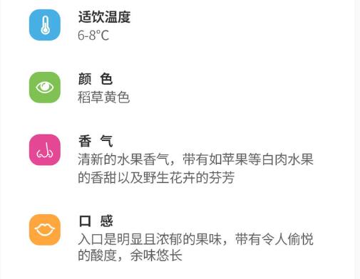 稻草黄色,清新的水果香甜和野生花卉的芬芳,令人愉悦的酸度,余味持久