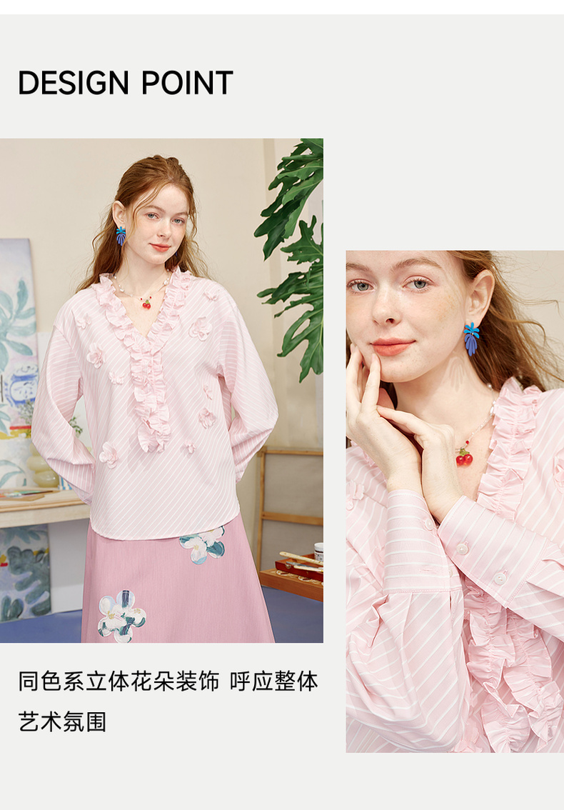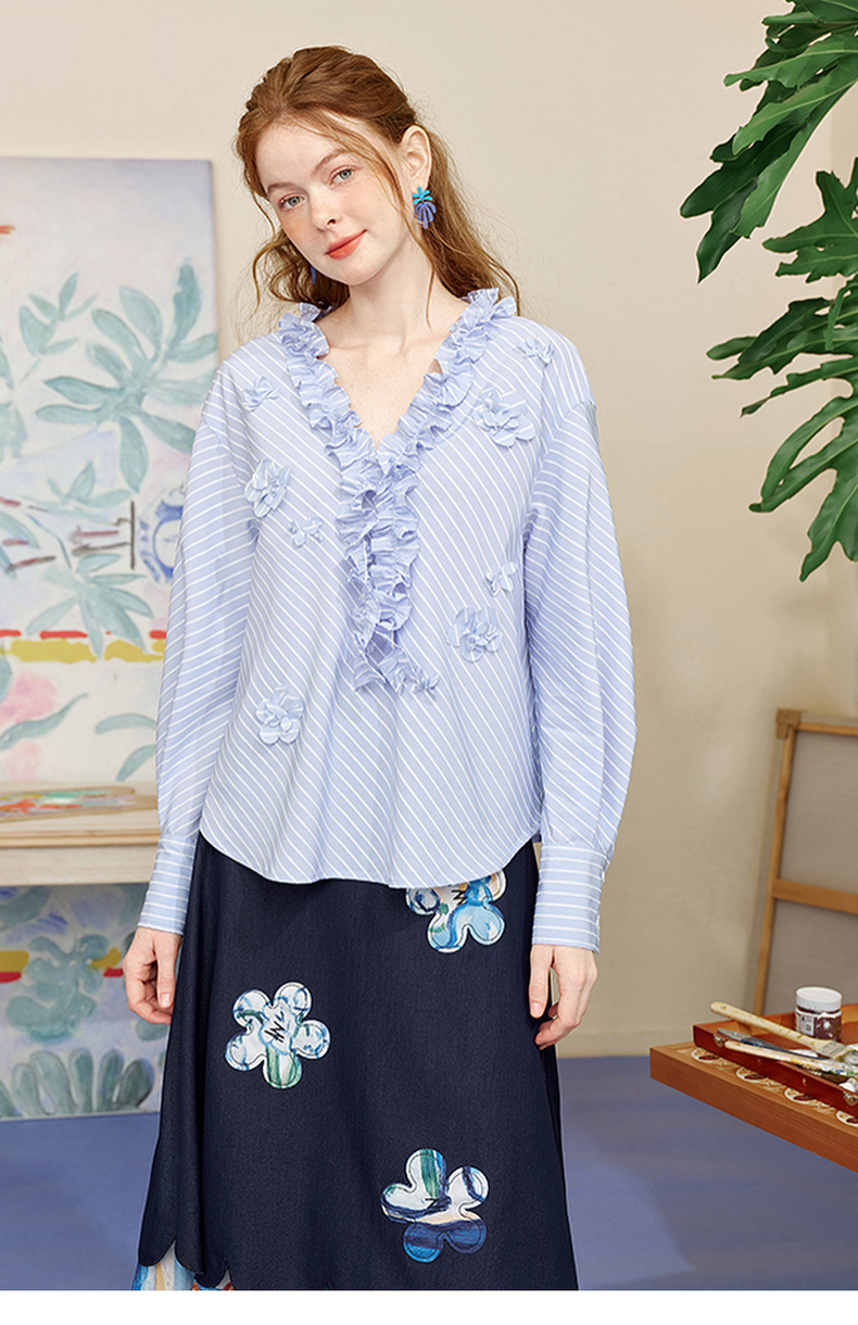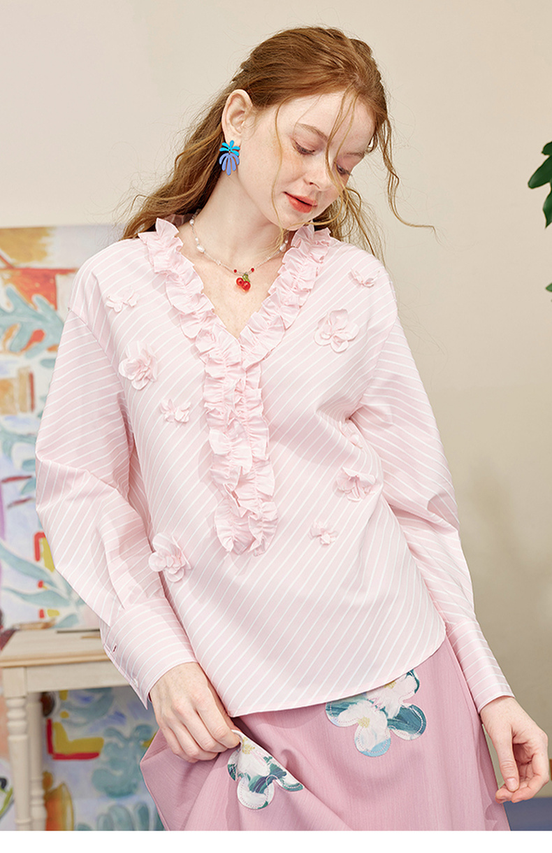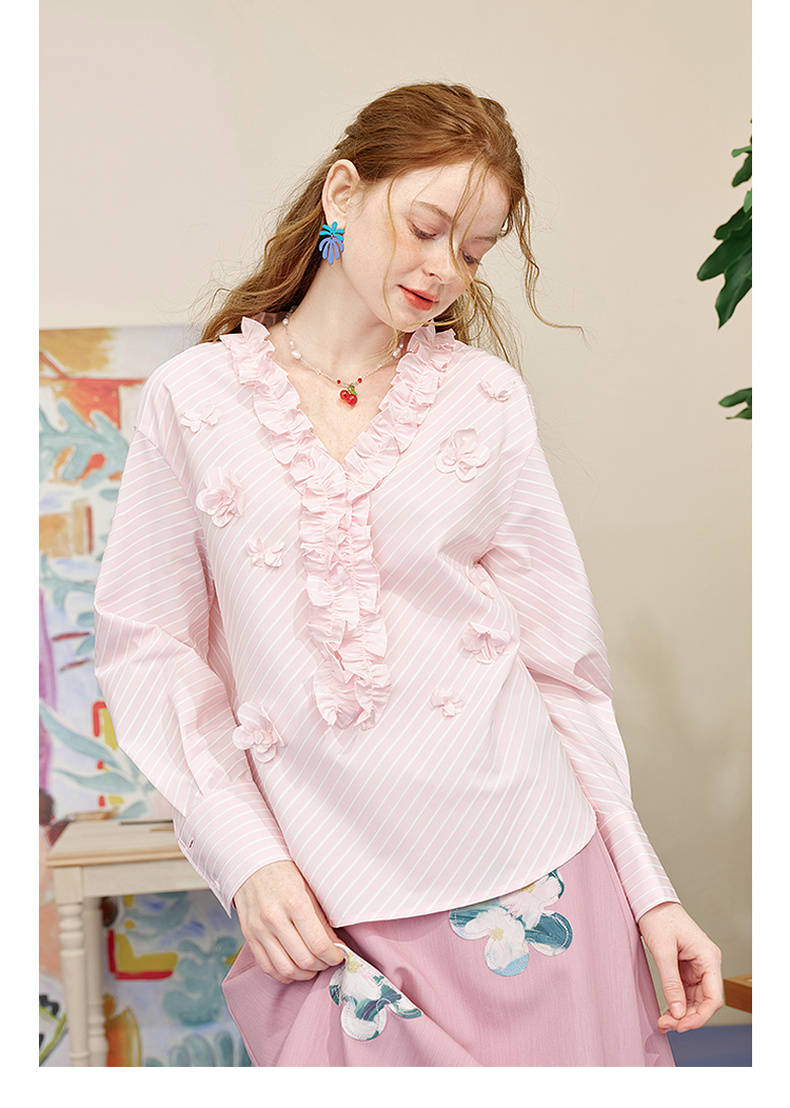两三事 如约盛开 2025夏季新款木耳边v领立体花朵条纹长袖衬衫女