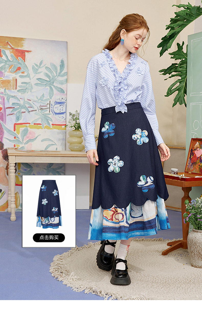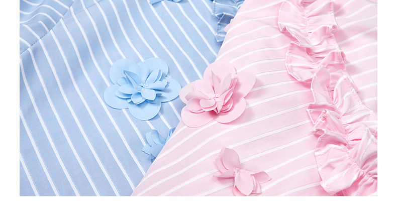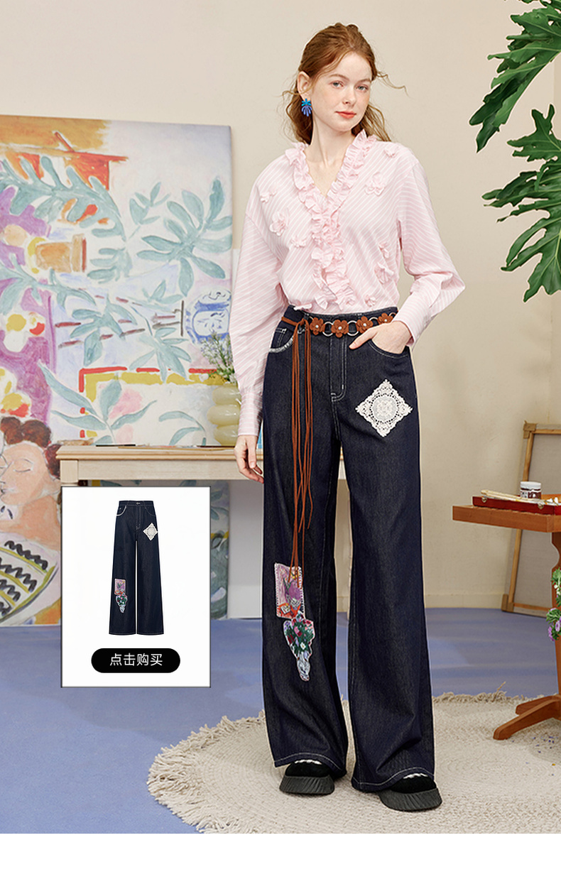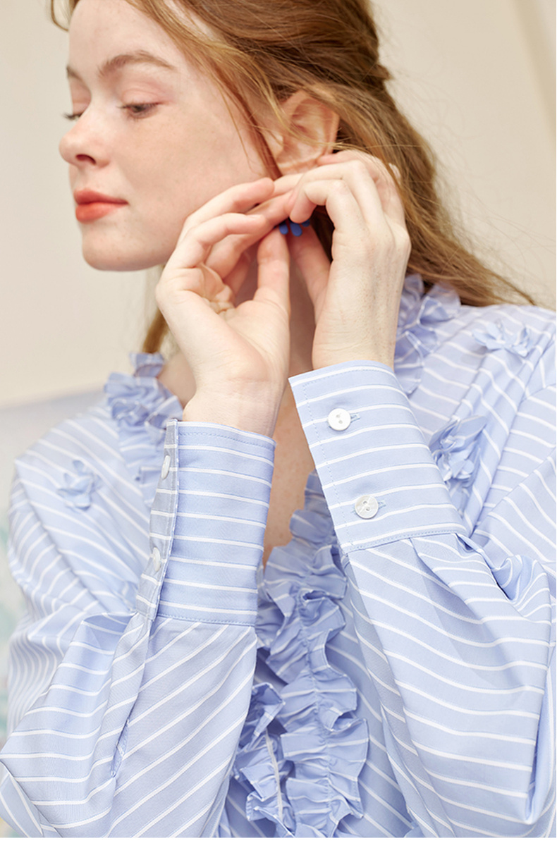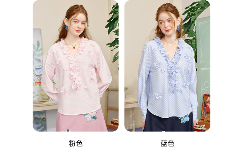 两三事 如约盛开 2025夏季新款木耳边v领立体花朵条纹长袖衬衫女