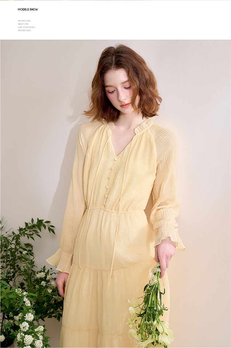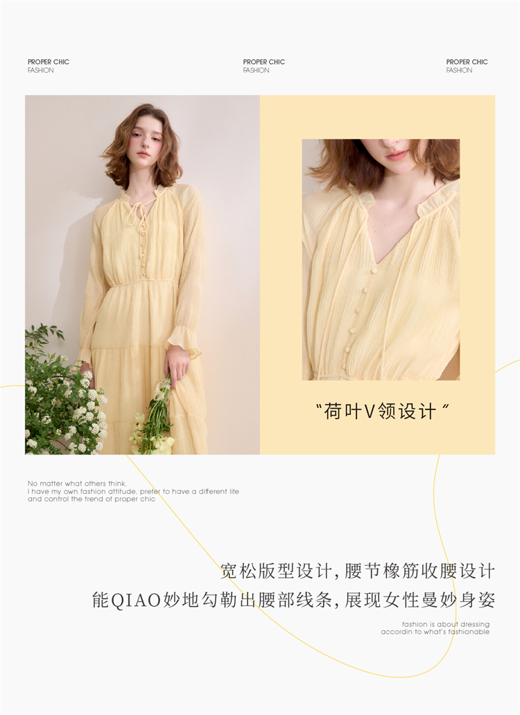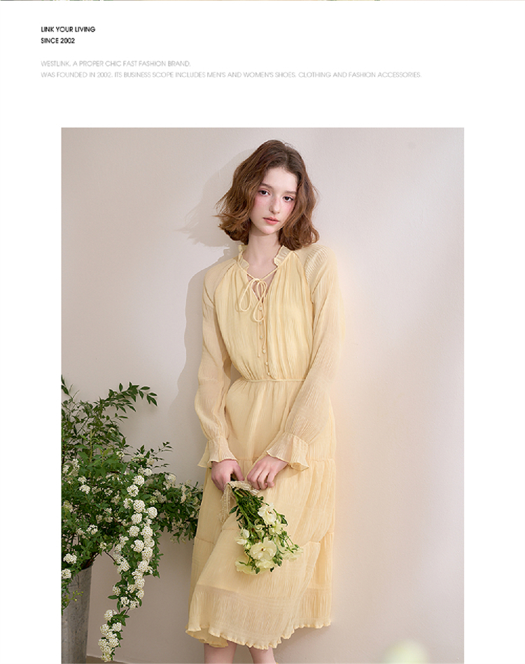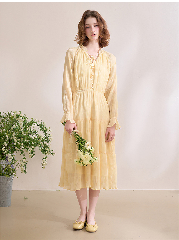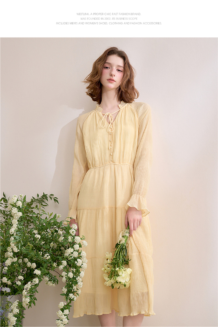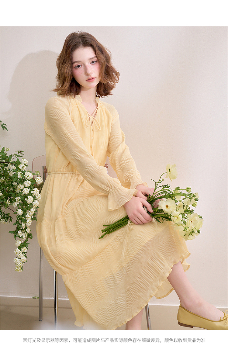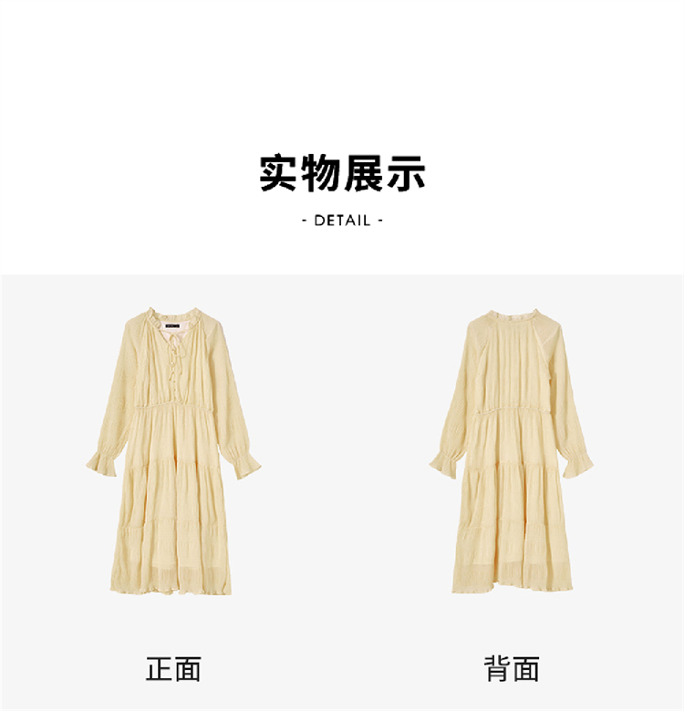 【压褶雪纺】优雅拼接荷叶边长袖连衣裙女松紧腰长裙V0550248