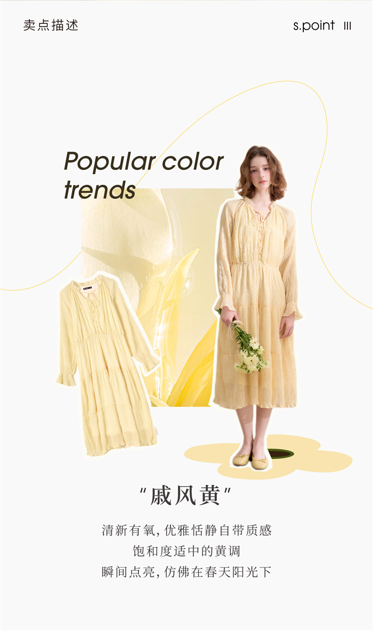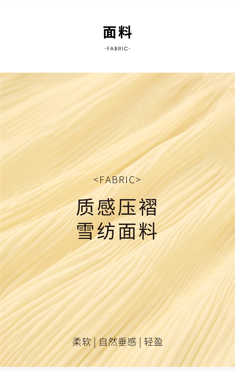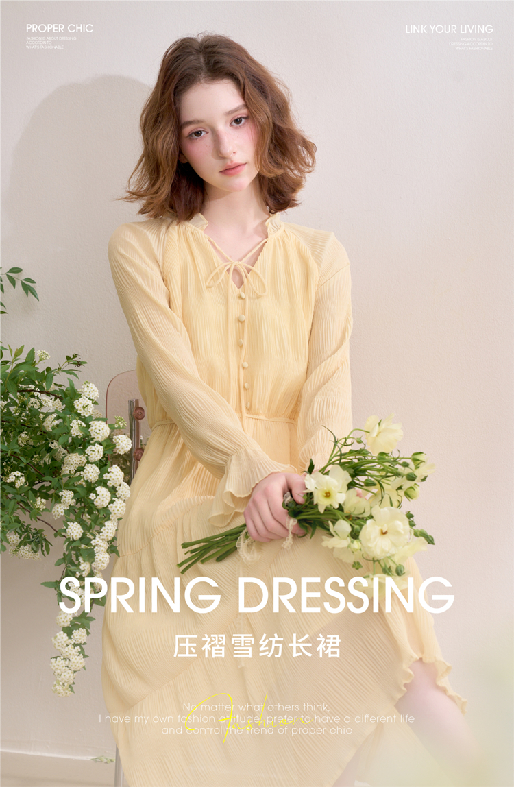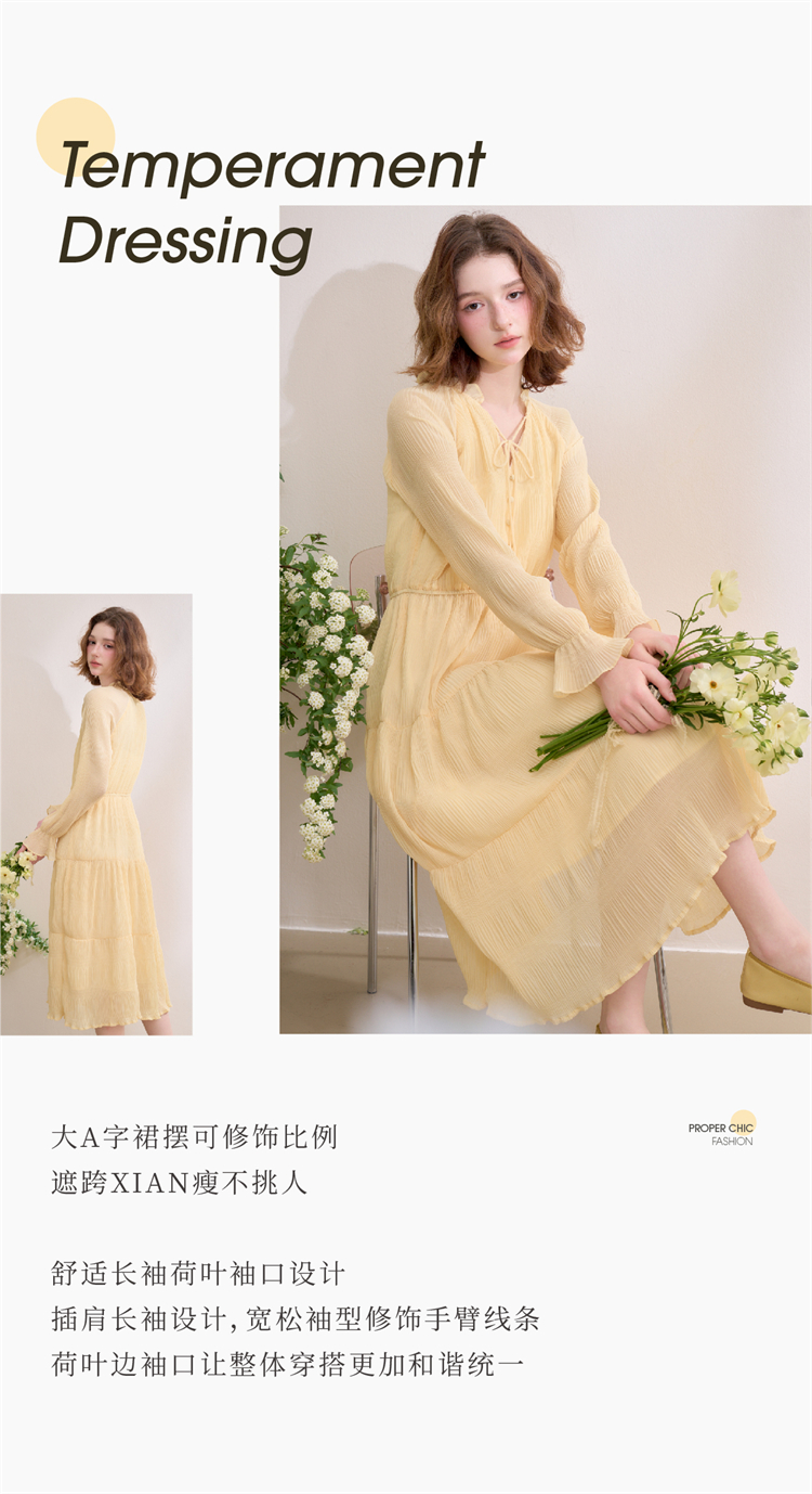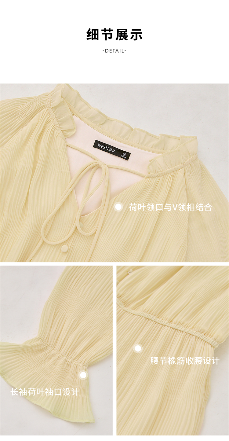 【压褶雪纺】优雅拼接荷叶边长袖连衣裙女松紧腰长裙V0550248