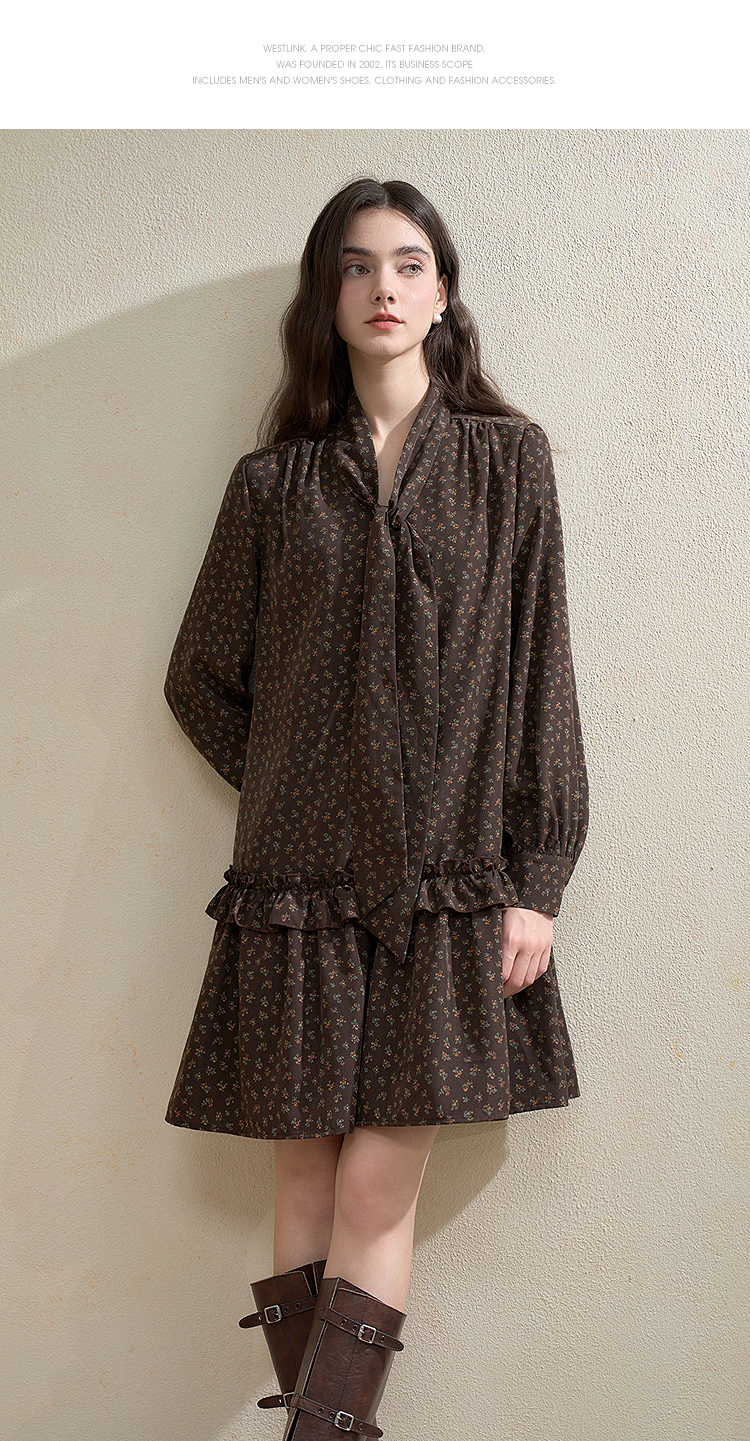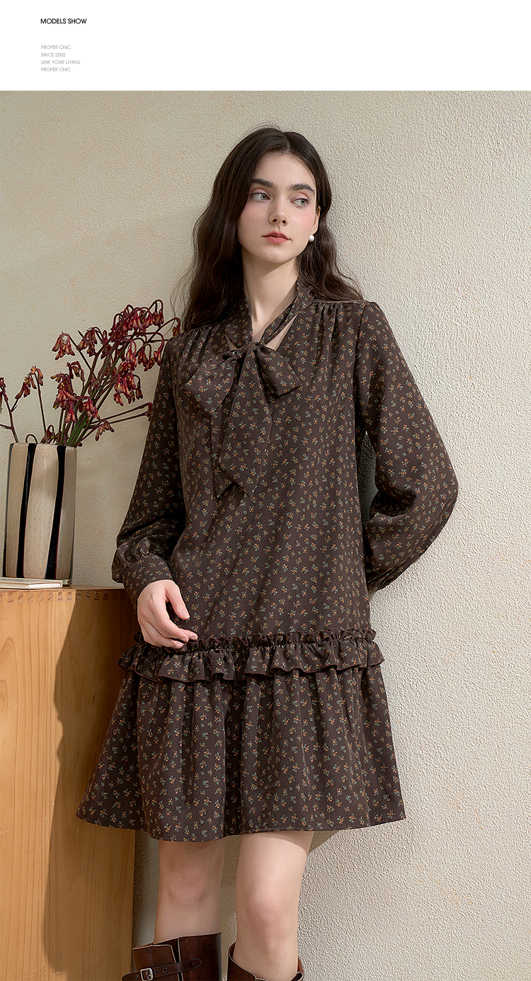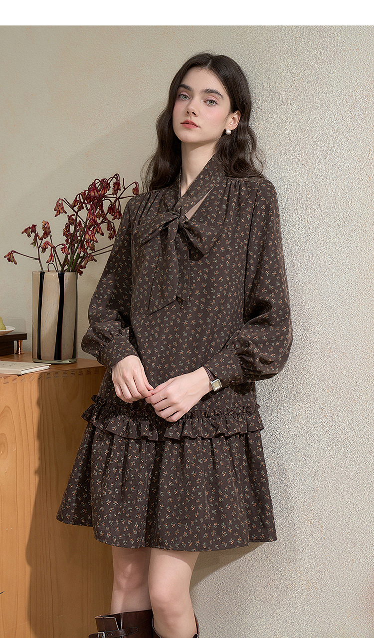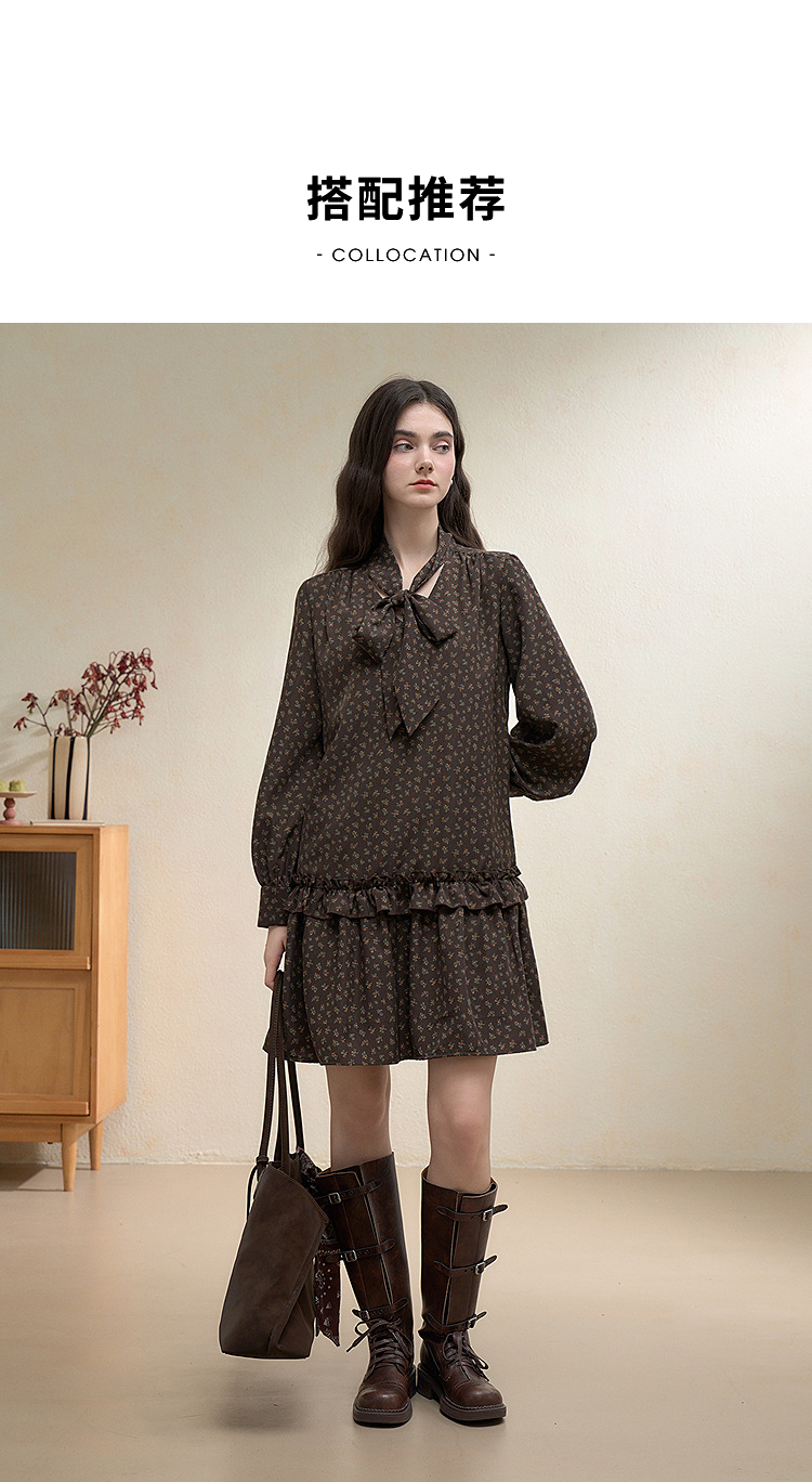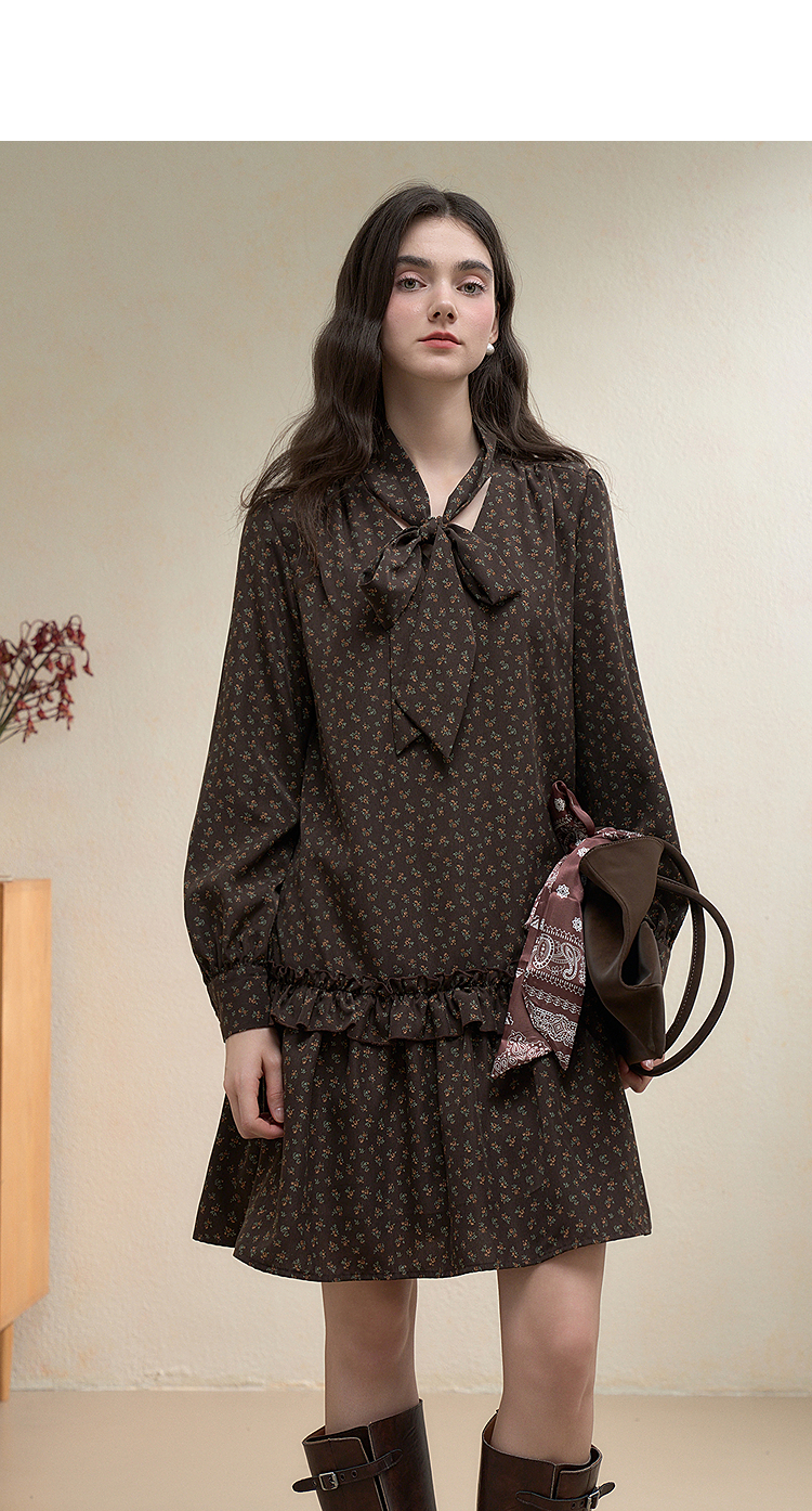 西遇美拉德法式复古碎花连衣裙女秋季蝴蝶结显瘦长袖中长裙V2851219
