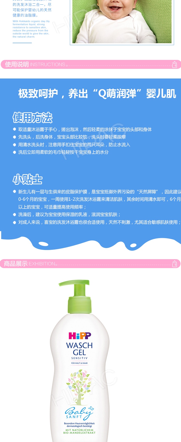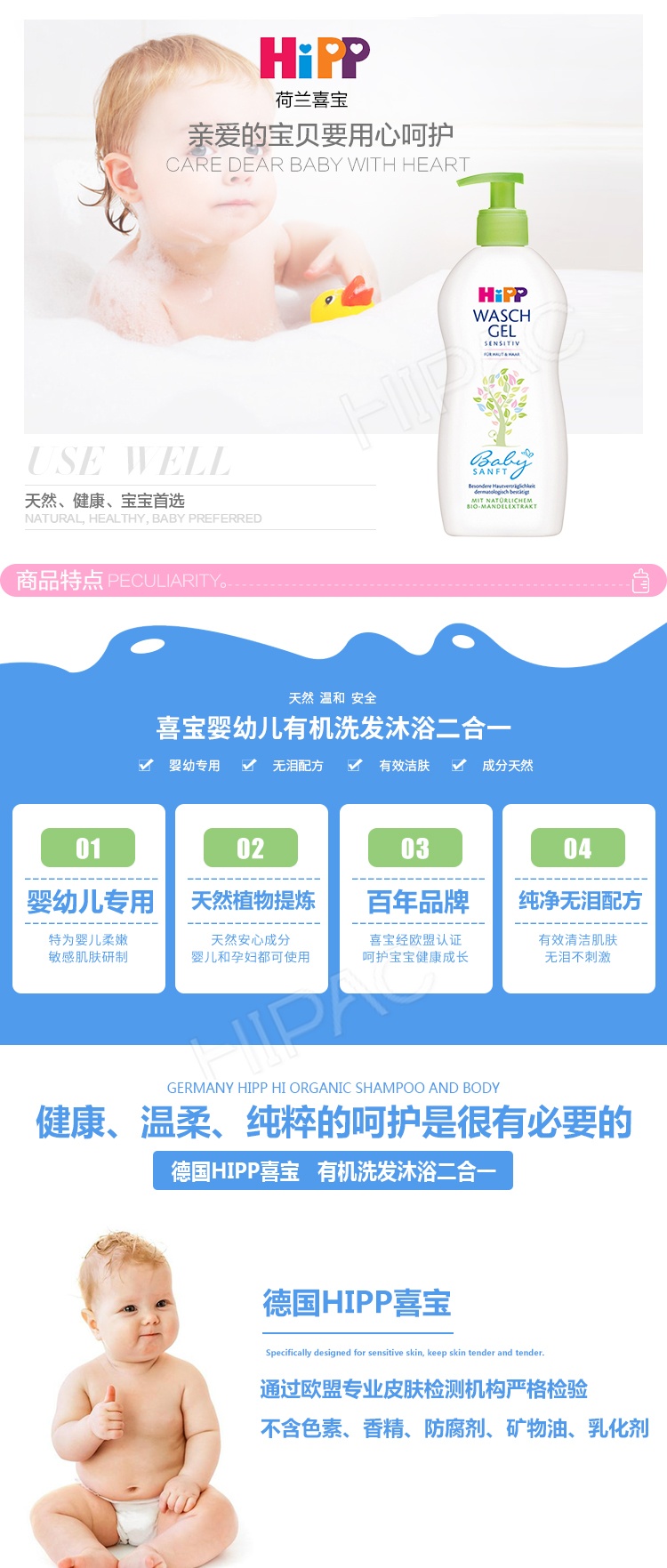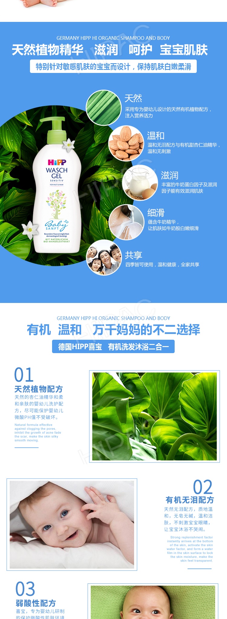 有机、温和,妈妈的不二选择。天然无泪配方,有机无泪配方,弱酸性配方。对宝宝幼嫩肌肤健康、温柔、精粹的呵护