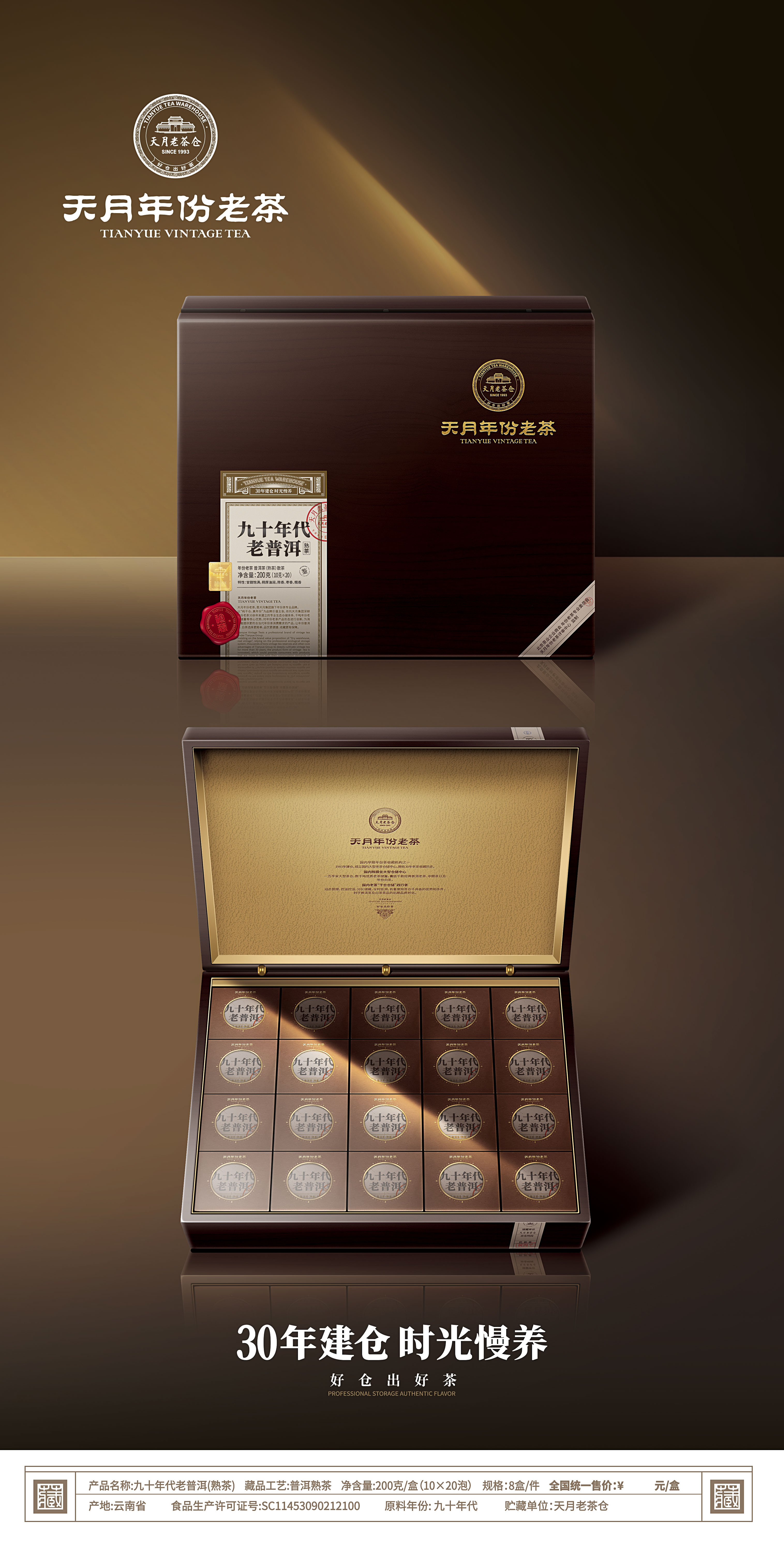 本款九十年代老熟普为天月老茶仓收藏的一款普洱老熟茶,经传统熟茶工艺精制而成。经三十余年时间转化,干茶呈棕褐色,冲泡后汤色红浓明亮,稠厚油润,香气为陈香、枣香、糯香、略带参香,茶汤甘甜饱满,老韵十足,叶底为深褐色,油润、有活性,品之微微发汗,令人身心通透。普洱老茶随时间转化口感愈佳,价值愈高,魅力愈加凸显,具有“可饮、可藏”的双重特性,为一款名副其实的藏品级普洱老茶。