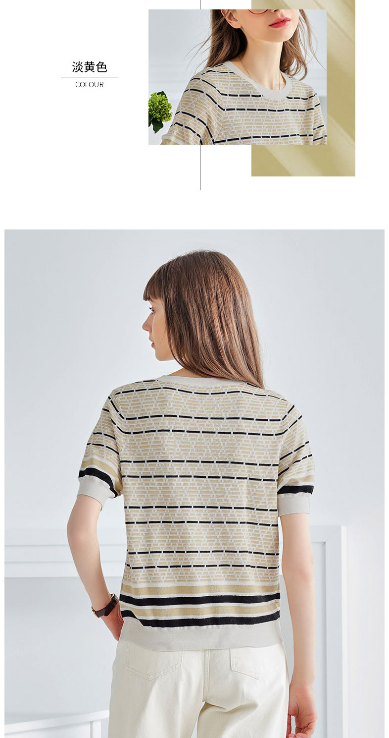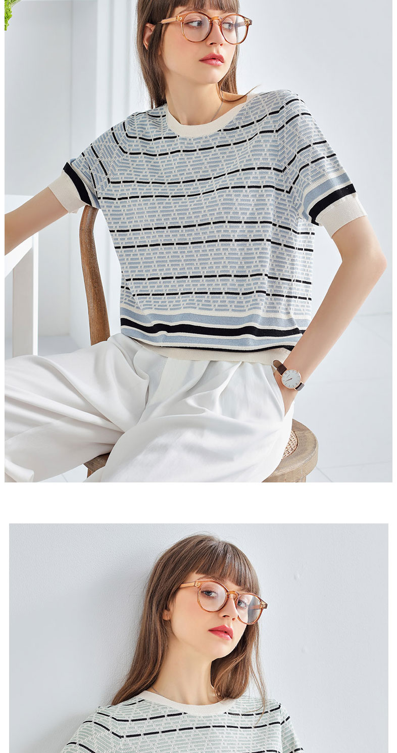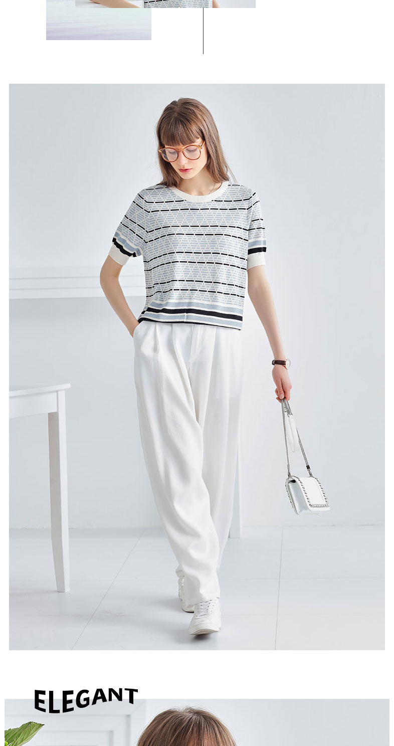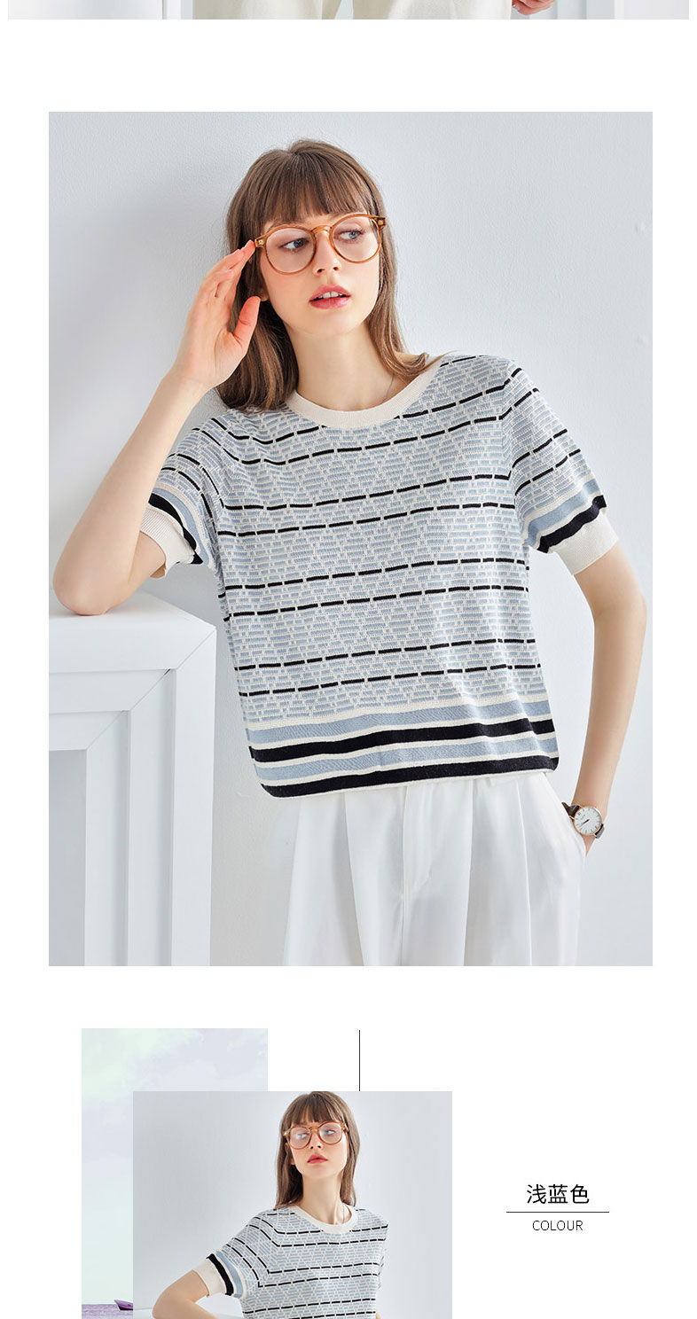 科蒙博卡夏季圆领镂空透气针织真丝上衣女 时尚条纹桑蚕丝T恤KSP1058H0122