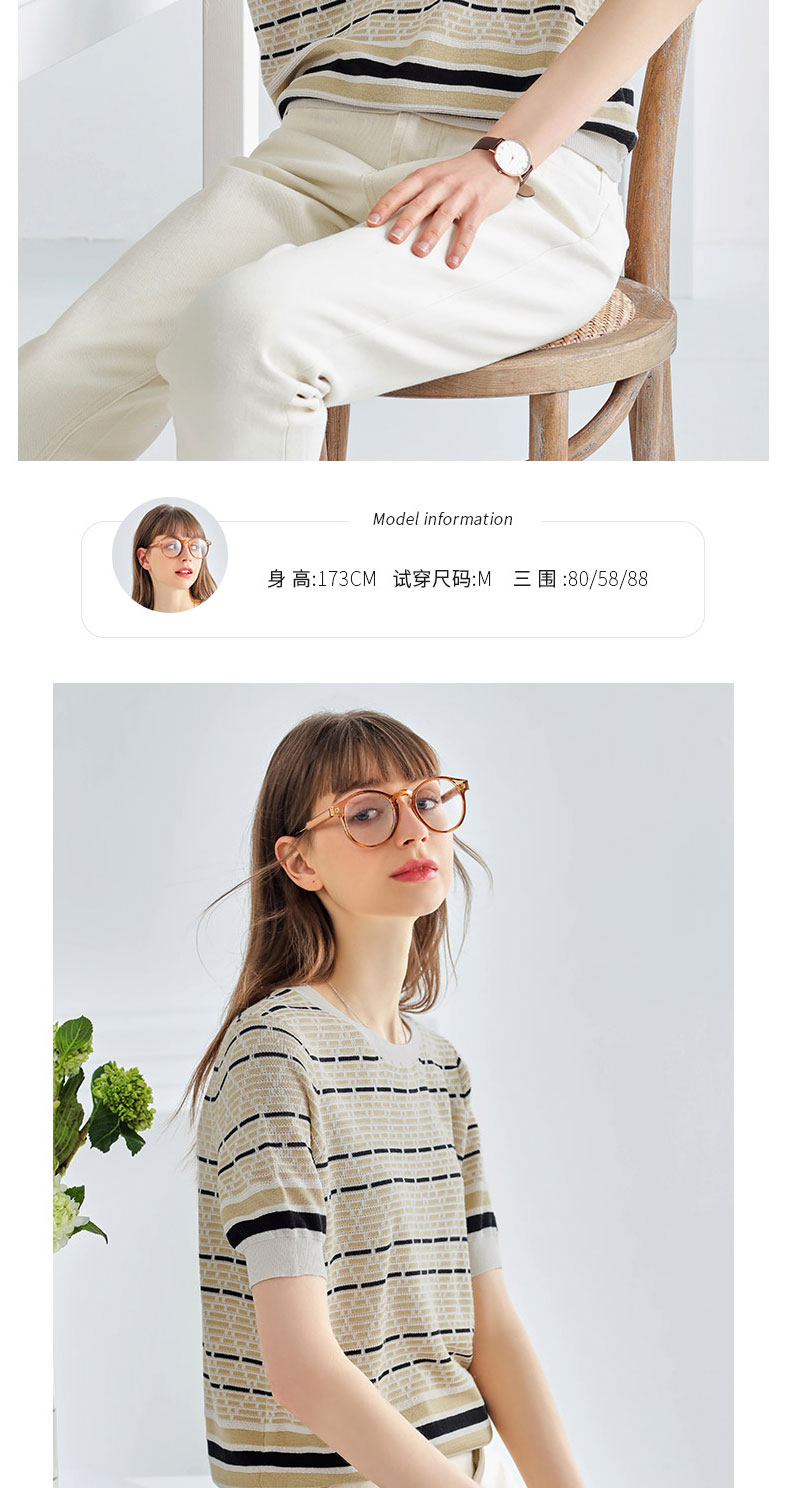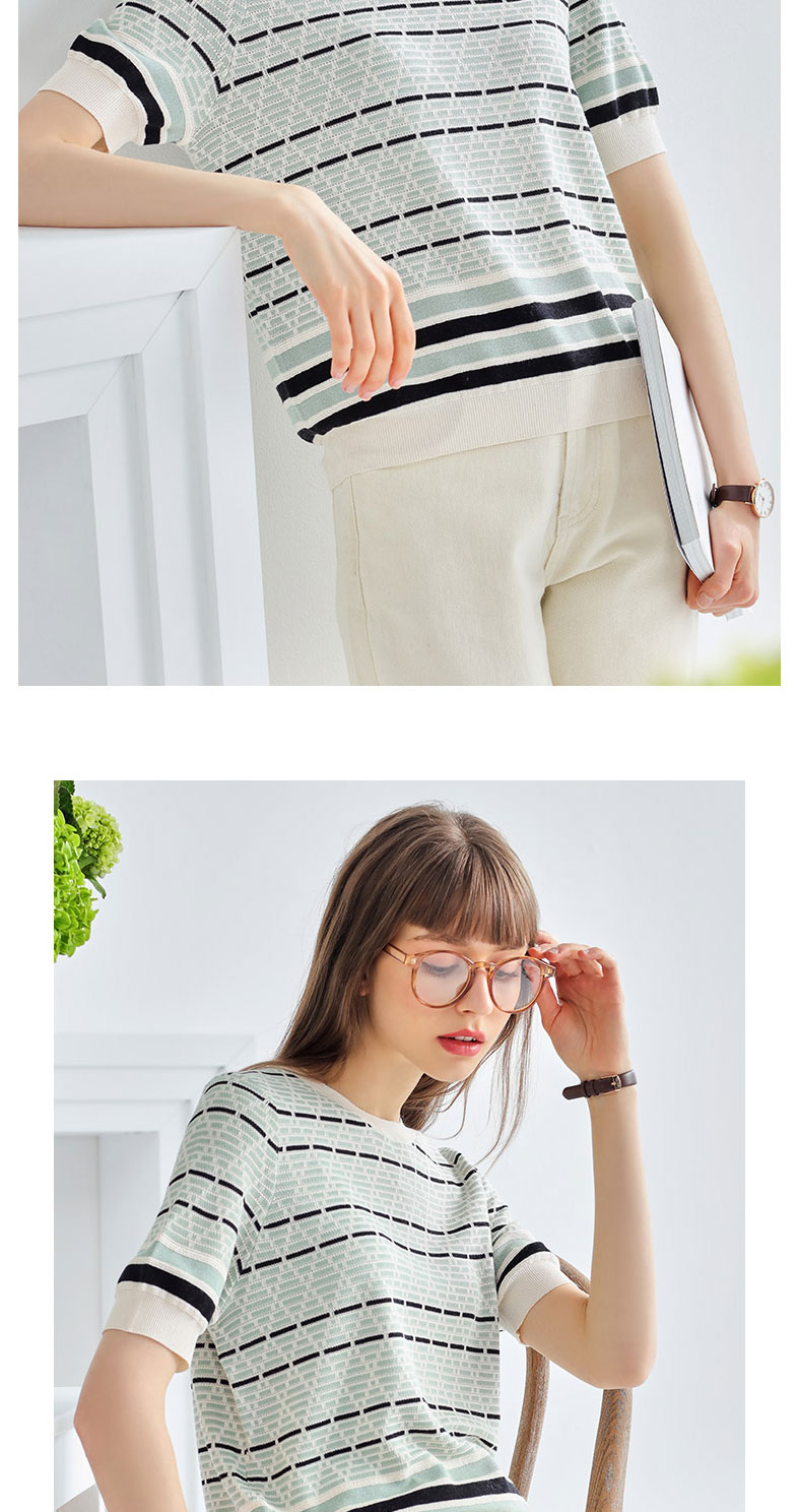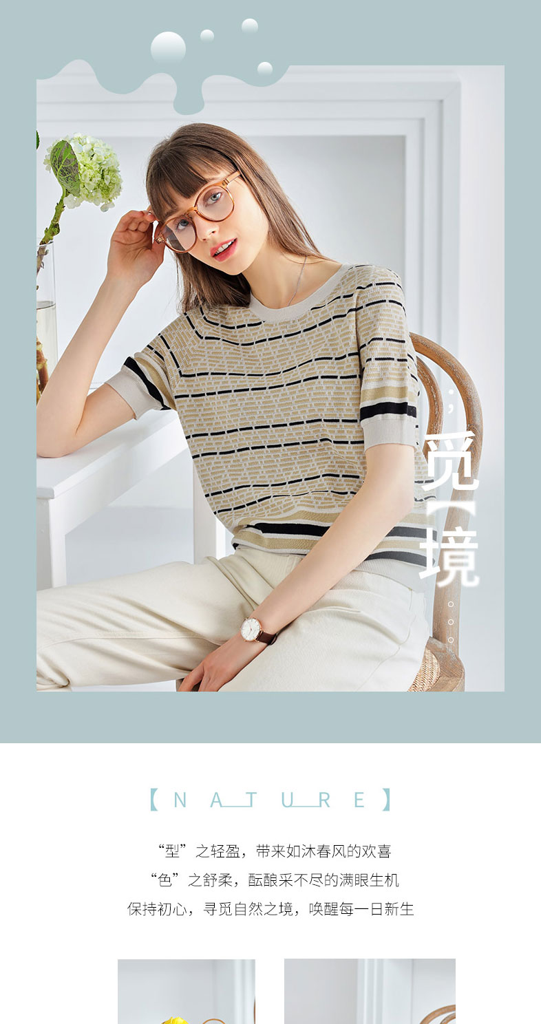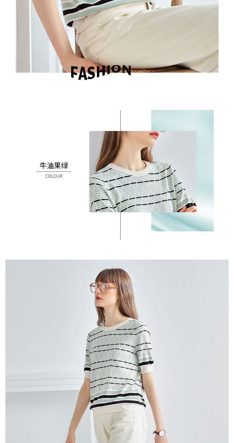科蒙博卡夏季圆领镂空透气针织真丝上衣女 时尚条纹桑蚕丝T恤KSP1058H0122