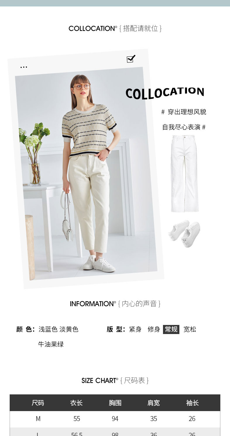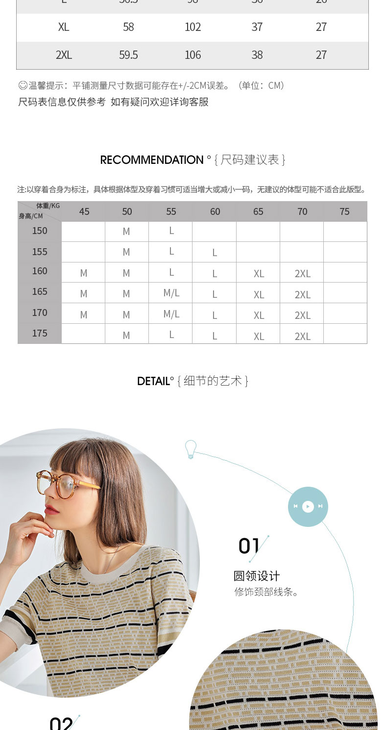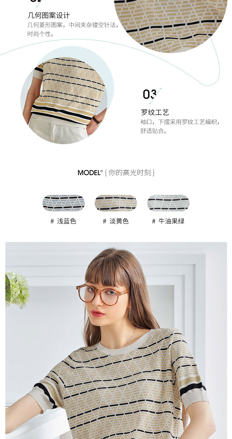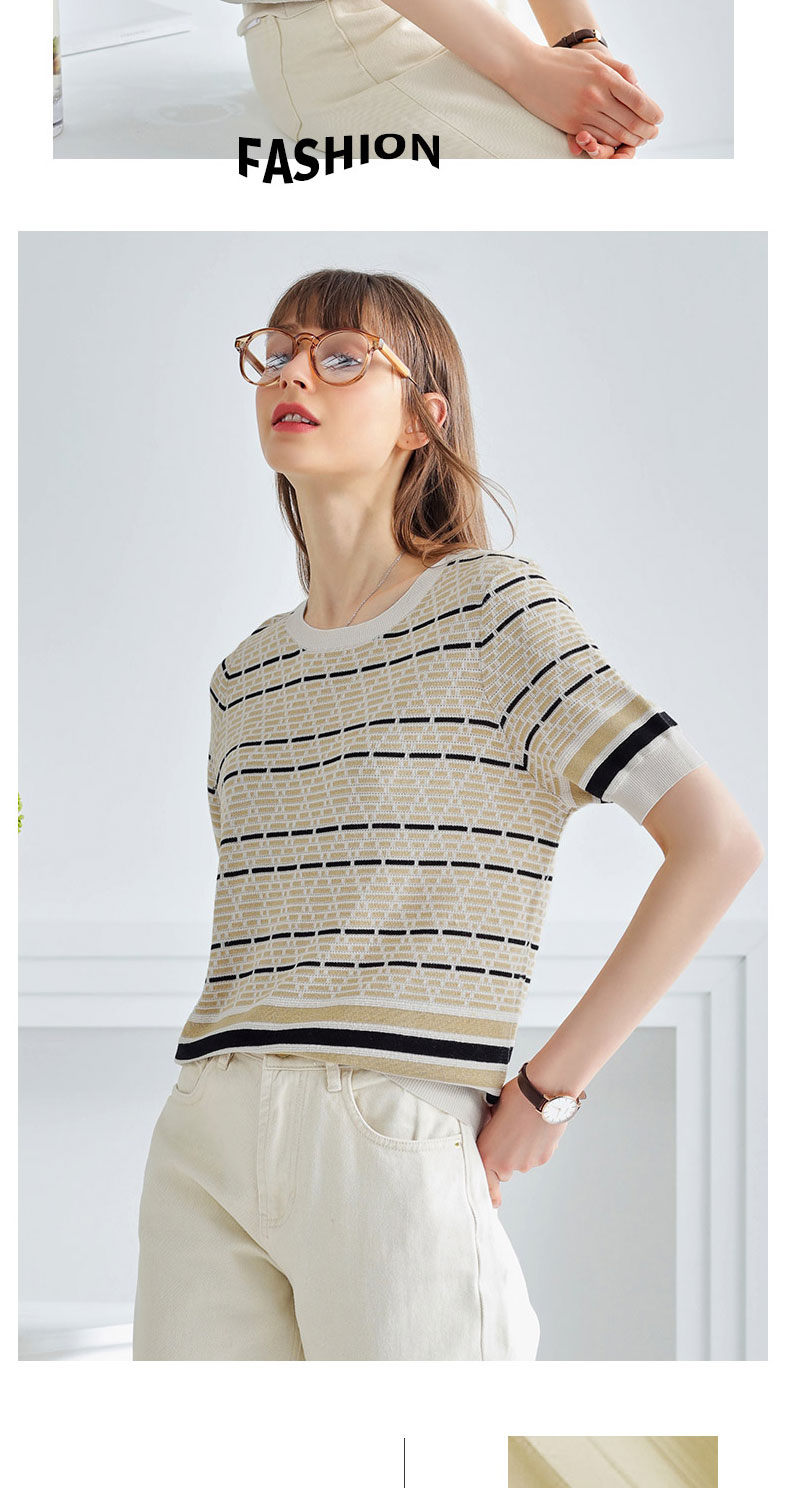 科蒙博卡夏季圆领镂空透气针织真丝上衣女 时尚条纹桑蚕丝T恤KSP1058H0122