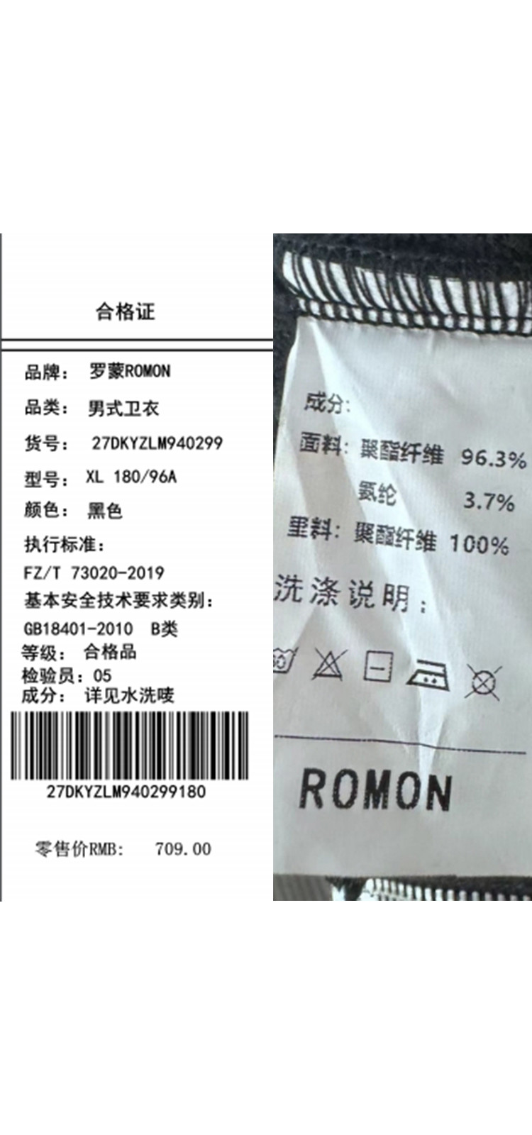 面料:96.3%聚酯纤维 3.7%氨纶
