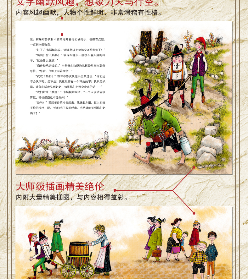 《大盗贼》的独特之处在于风趣幽默和人物特别滑稽,而且有性格。卡斯佩尔绝顶聪明,好朋友赛伯尔却有点糊涂;警察狄莫瑟尔气宇轩昂但智商有限,老是受到作弄;奶奶的烹饪手艺是第一流的,看看文字就觉得香飘四溢;而大盗贼霍琛布鲁茨虽然做了很多坏事,本性中却不乏善良。本书算得上是真正能寓教于乐的童话作品。