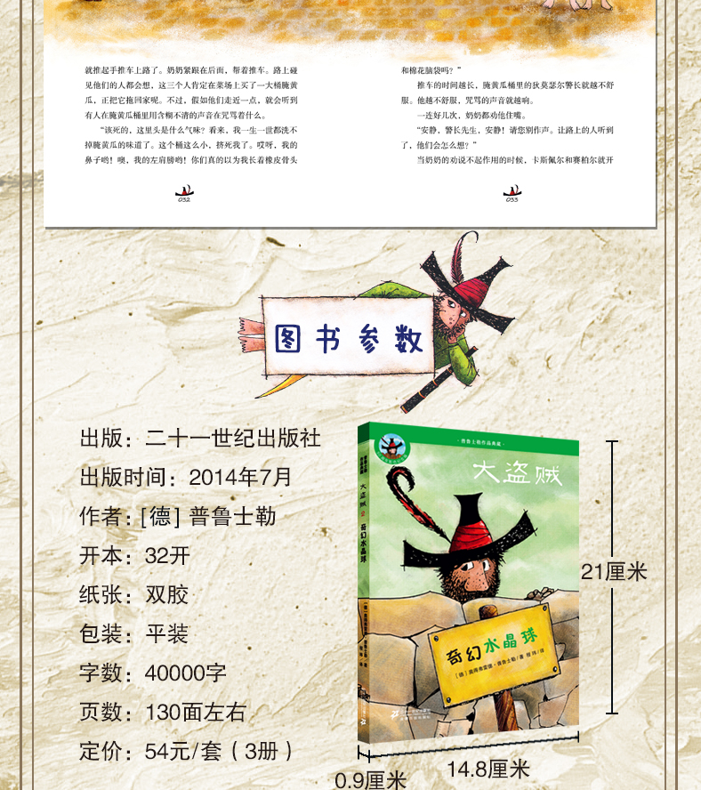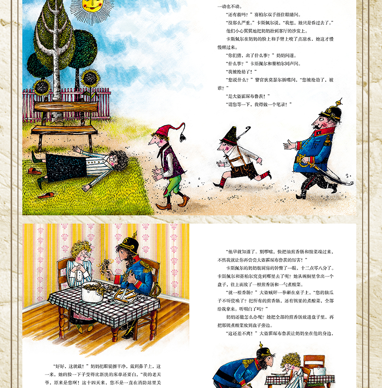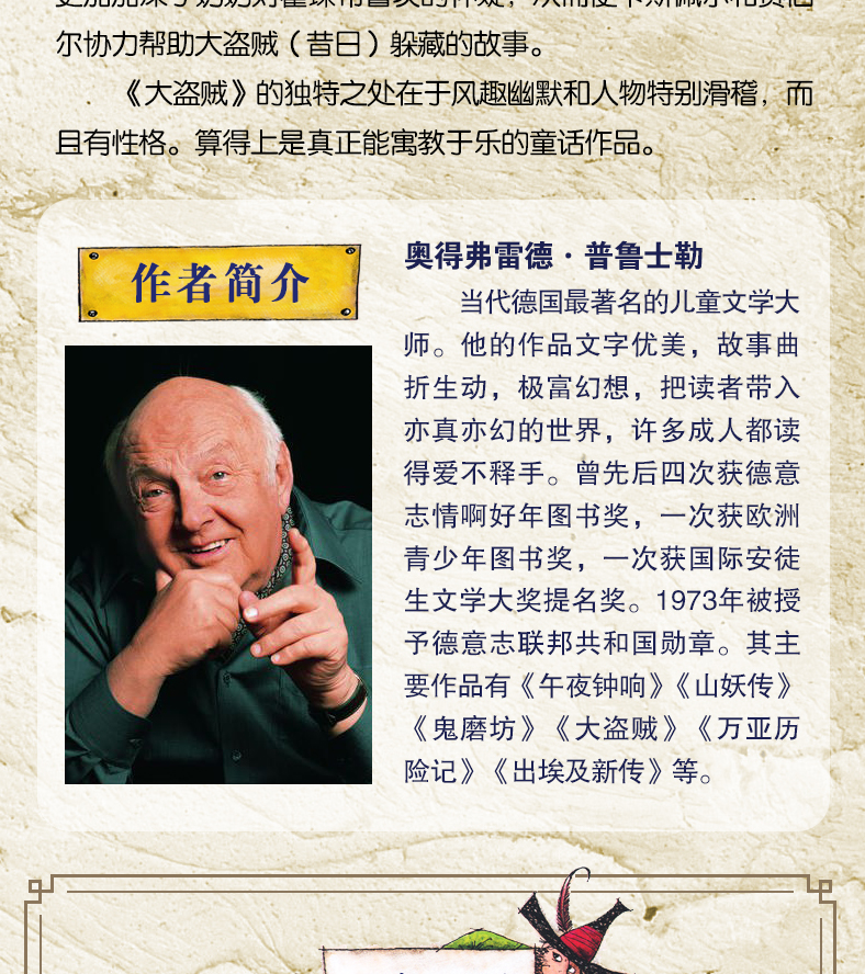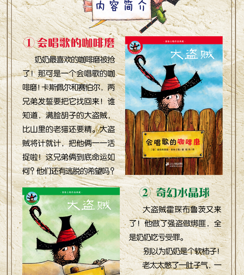 《大盗贼》讲述了两个小伙伴卡斯佩尔和赛伯尔协同警察狄莫瑟尔抓捕大盗贼霍琛布鲁茨的故事。