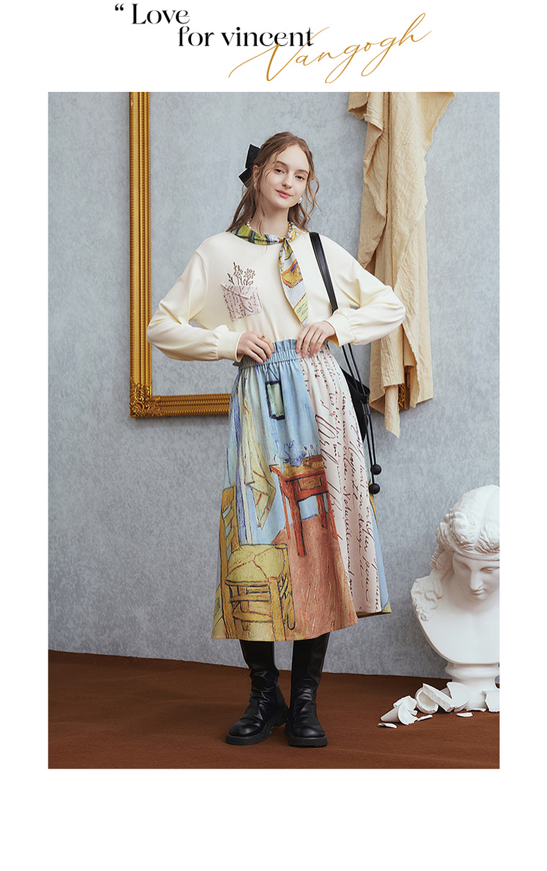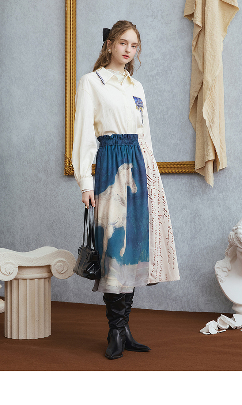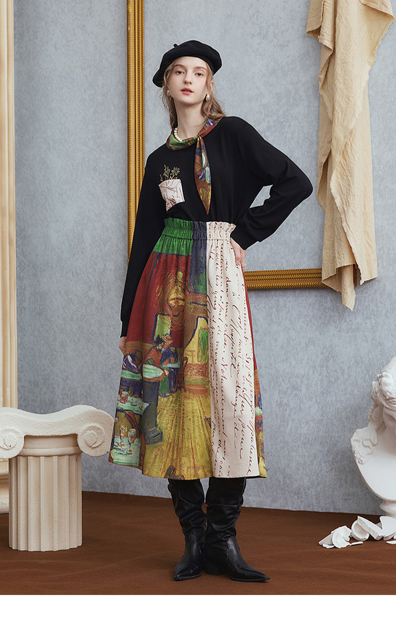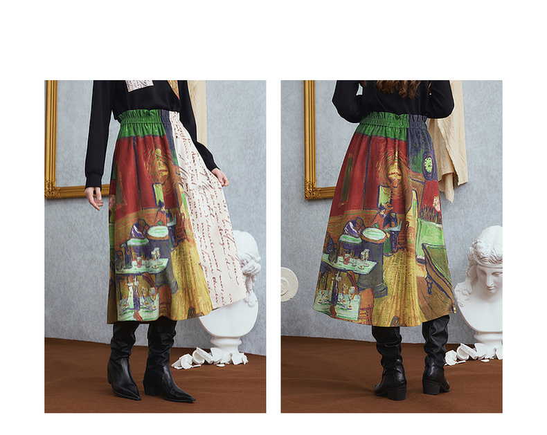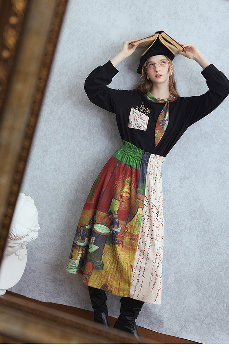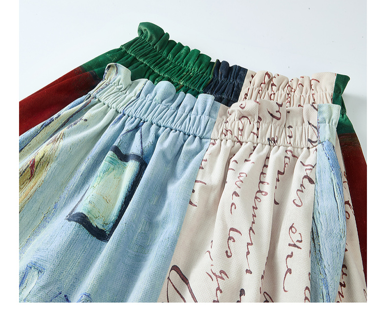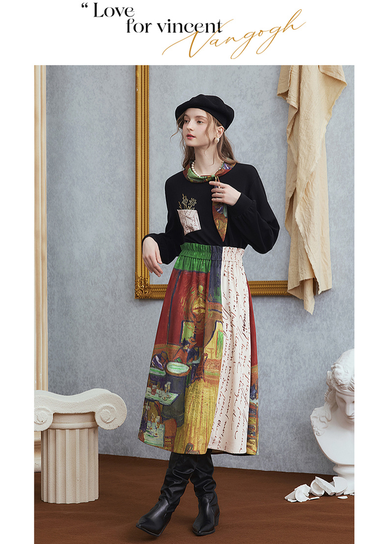 两三事梵高文艺 幻想彼岸 2025秋季新款法式印花木耳边拼接半身裙