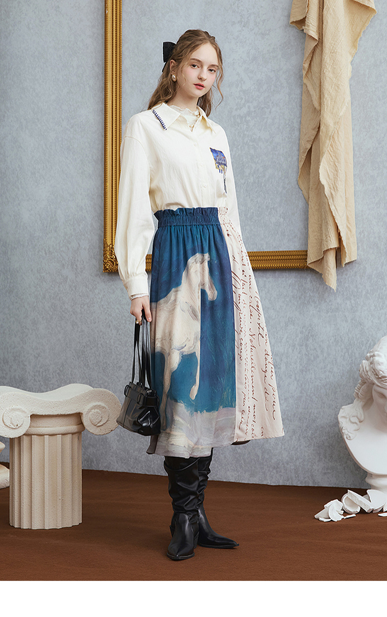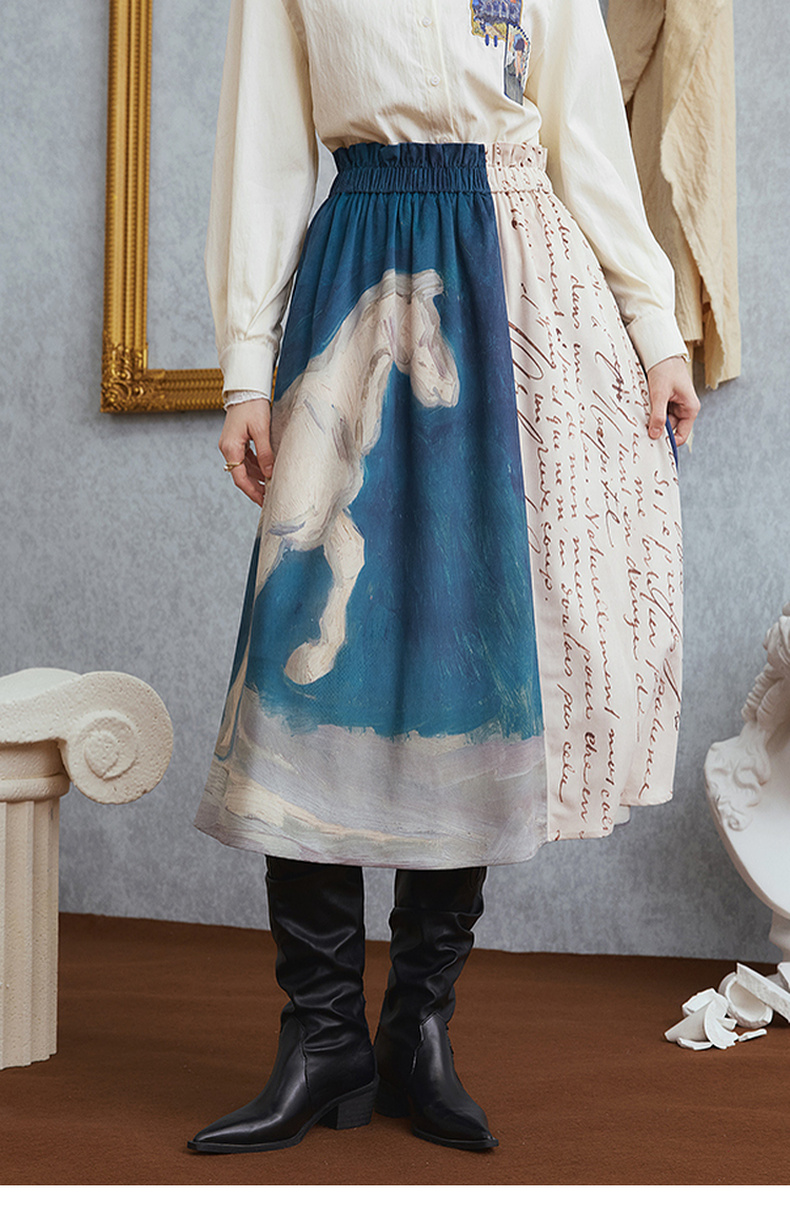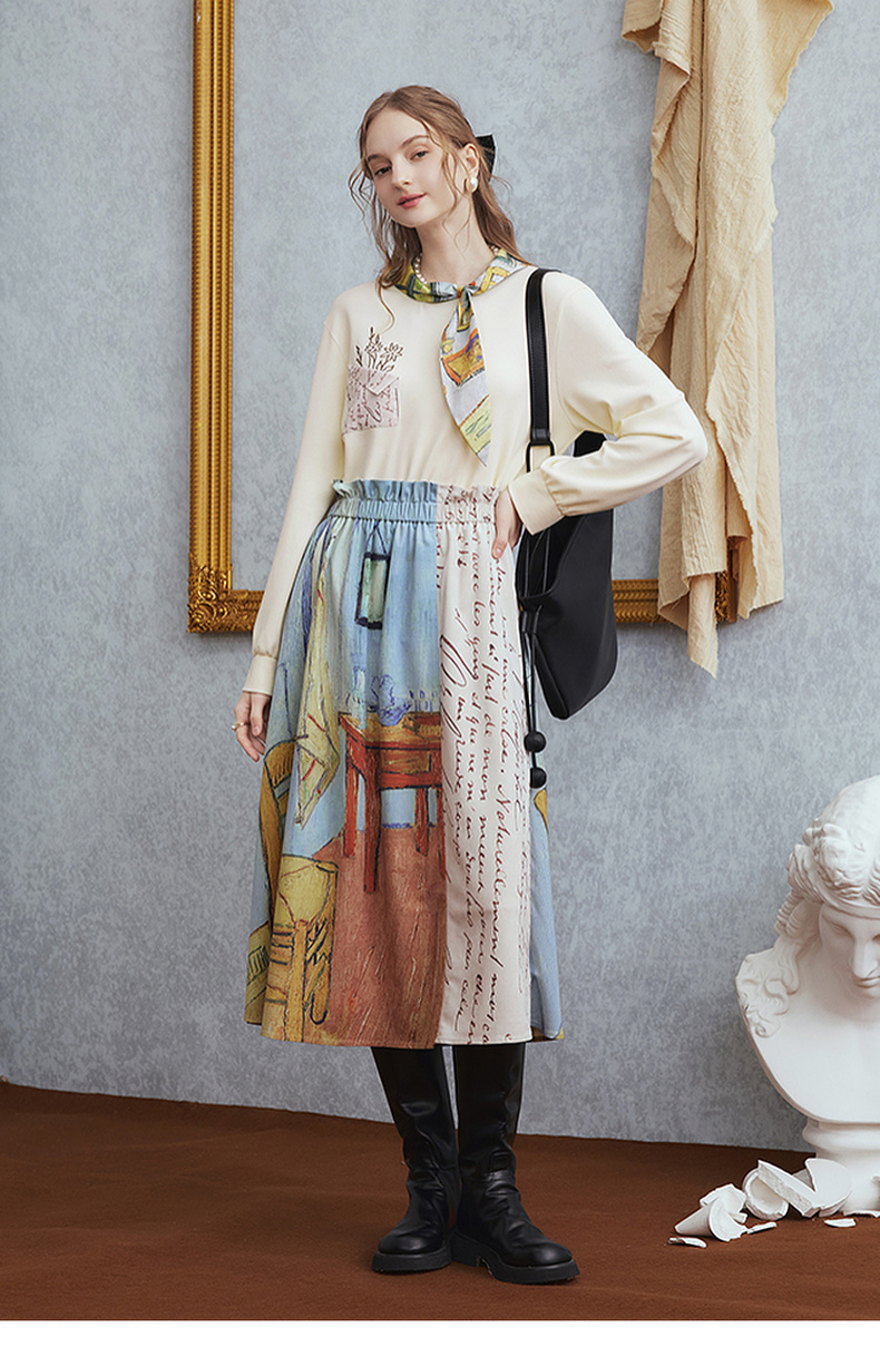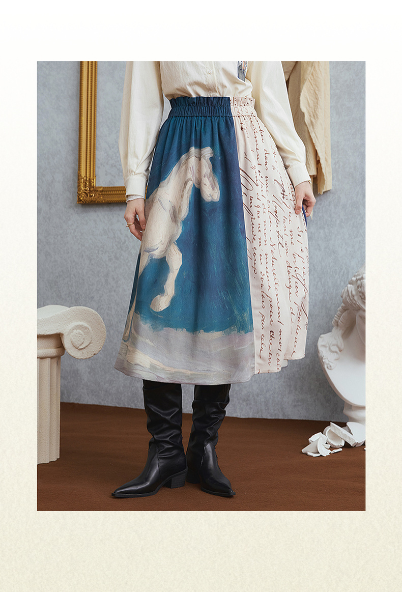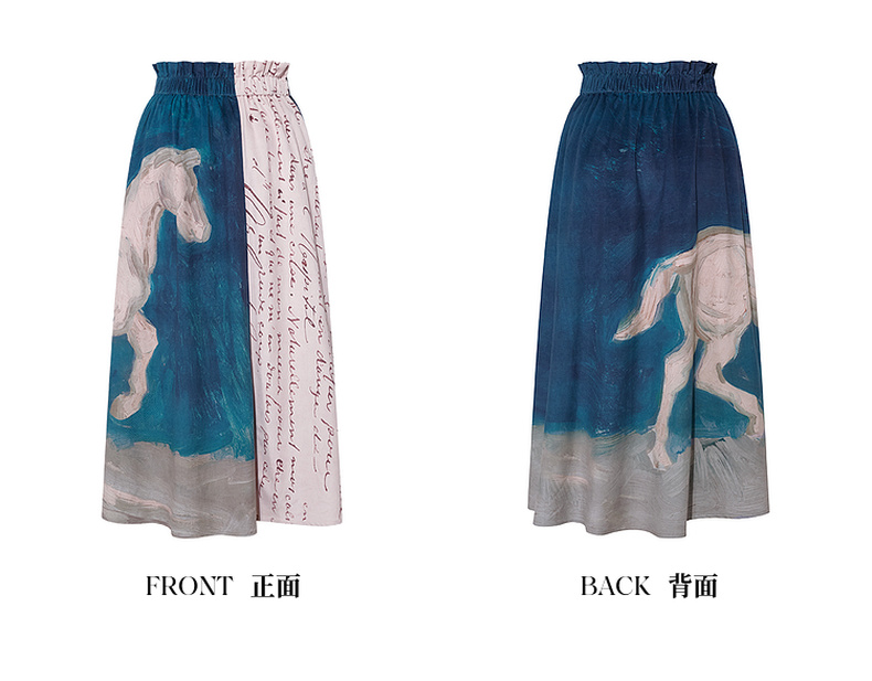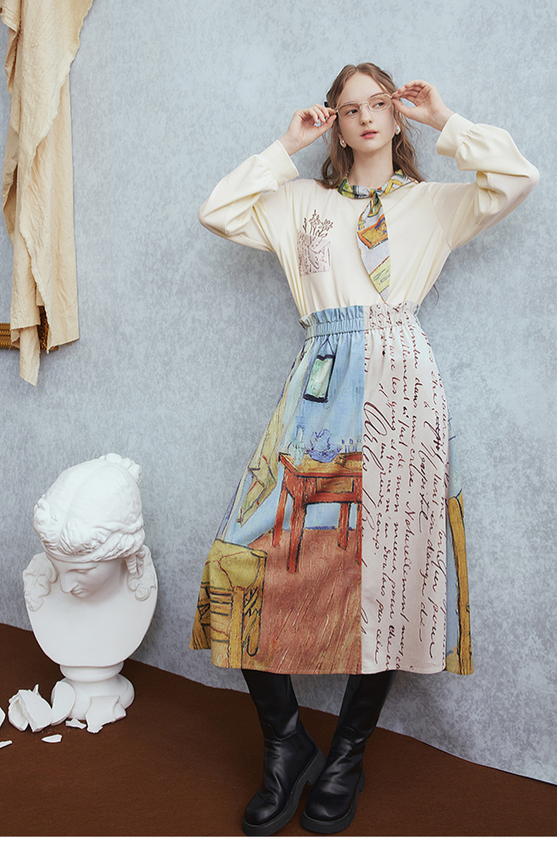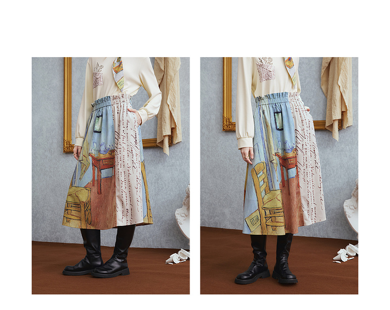 两三事梵高文艺 幻想彼岸 2025秋季新款法式印花木耳边拼接半身裙