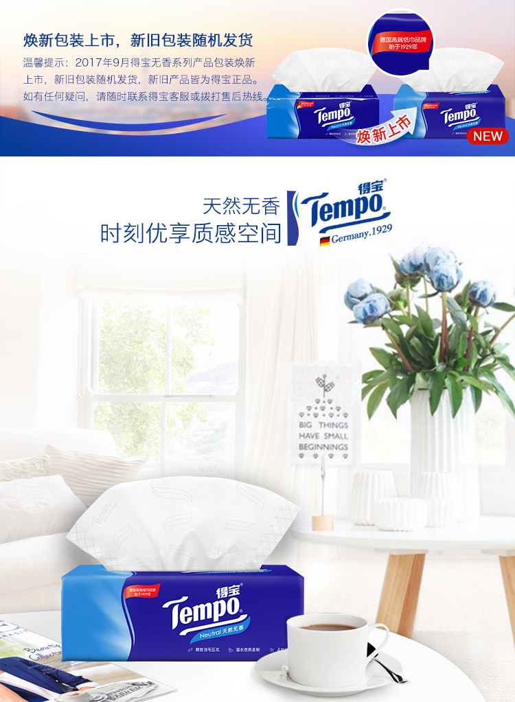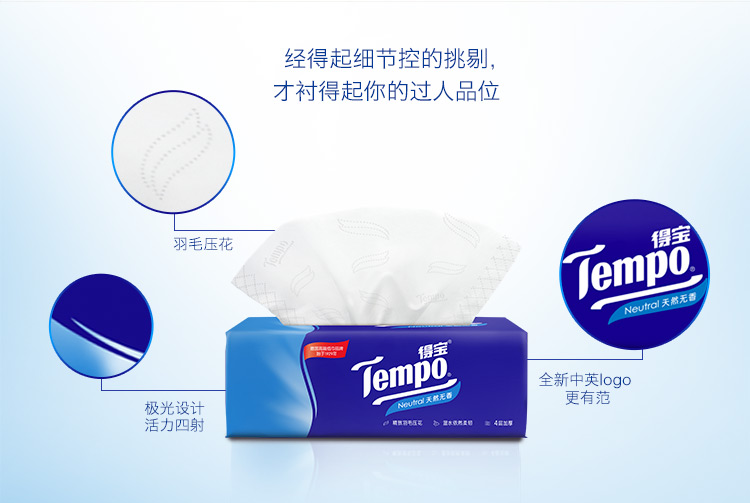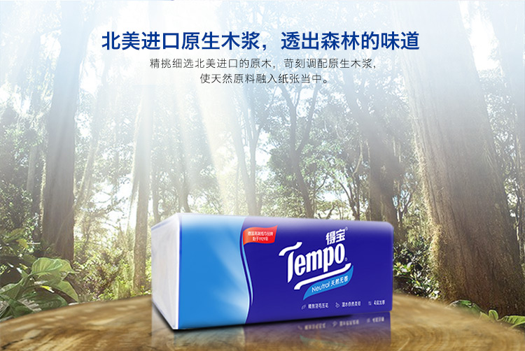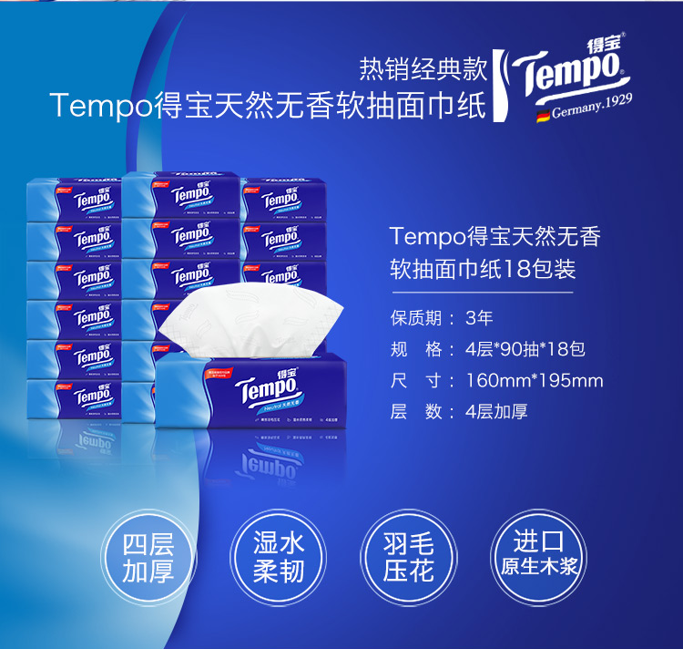 得宝(TEMPO) 抽纸 M码 无香4层90抽*18包 湿水不易破 纸巾餐巾纸