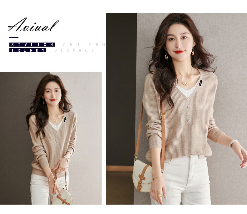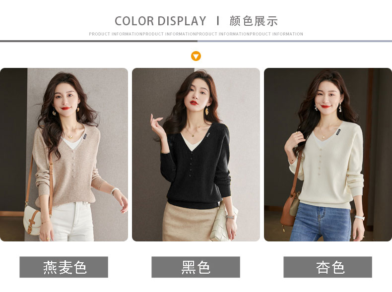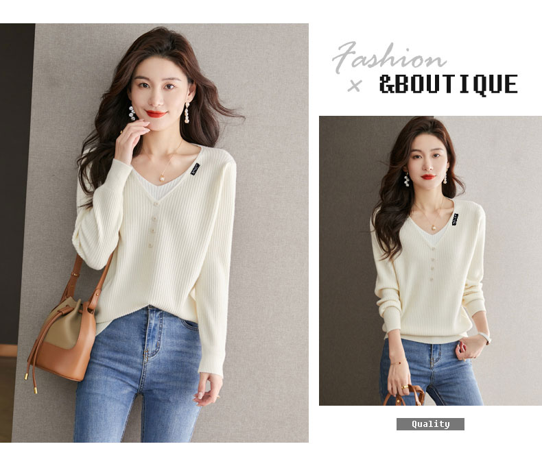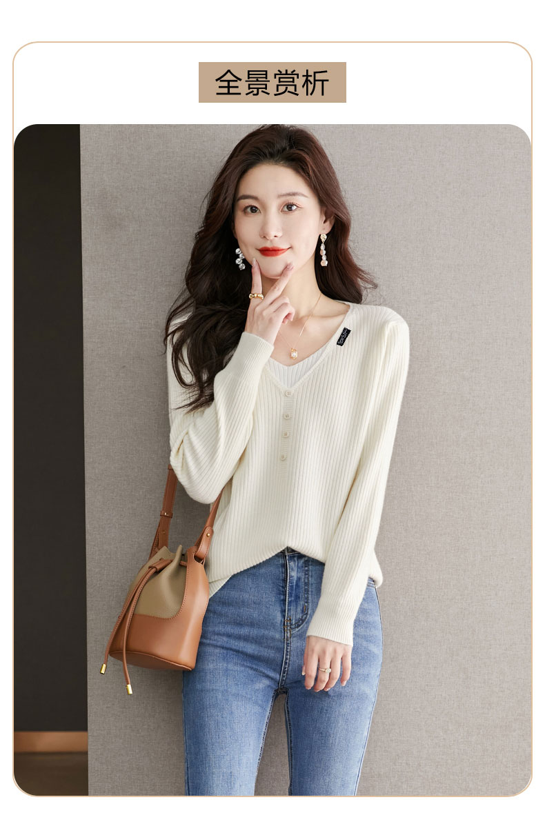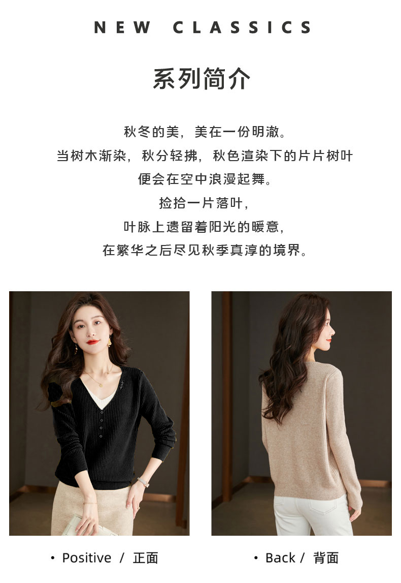 半身缘女装 秋季V领假两件装饰内搭针织打底衫毛衣JL002
