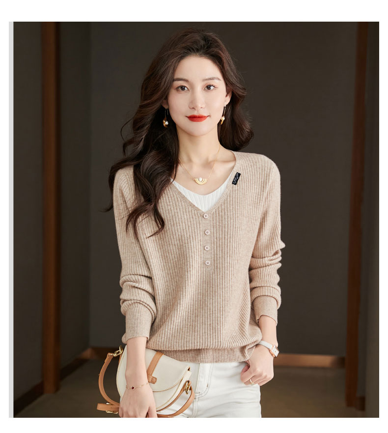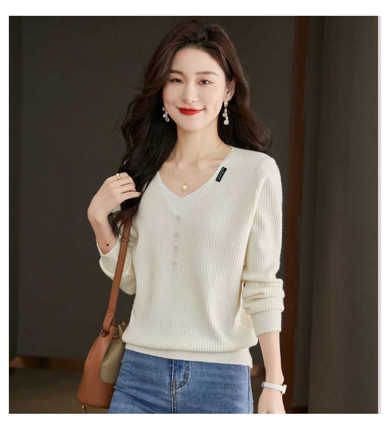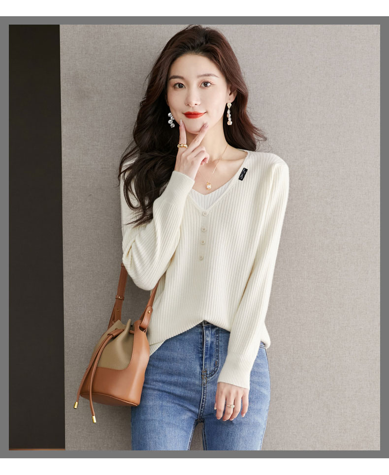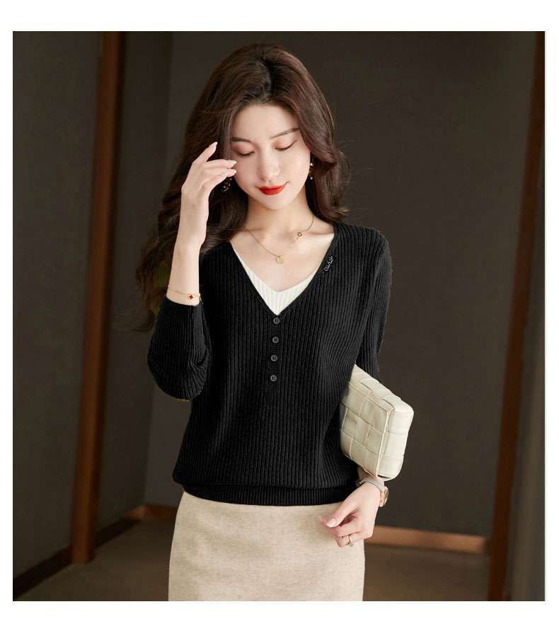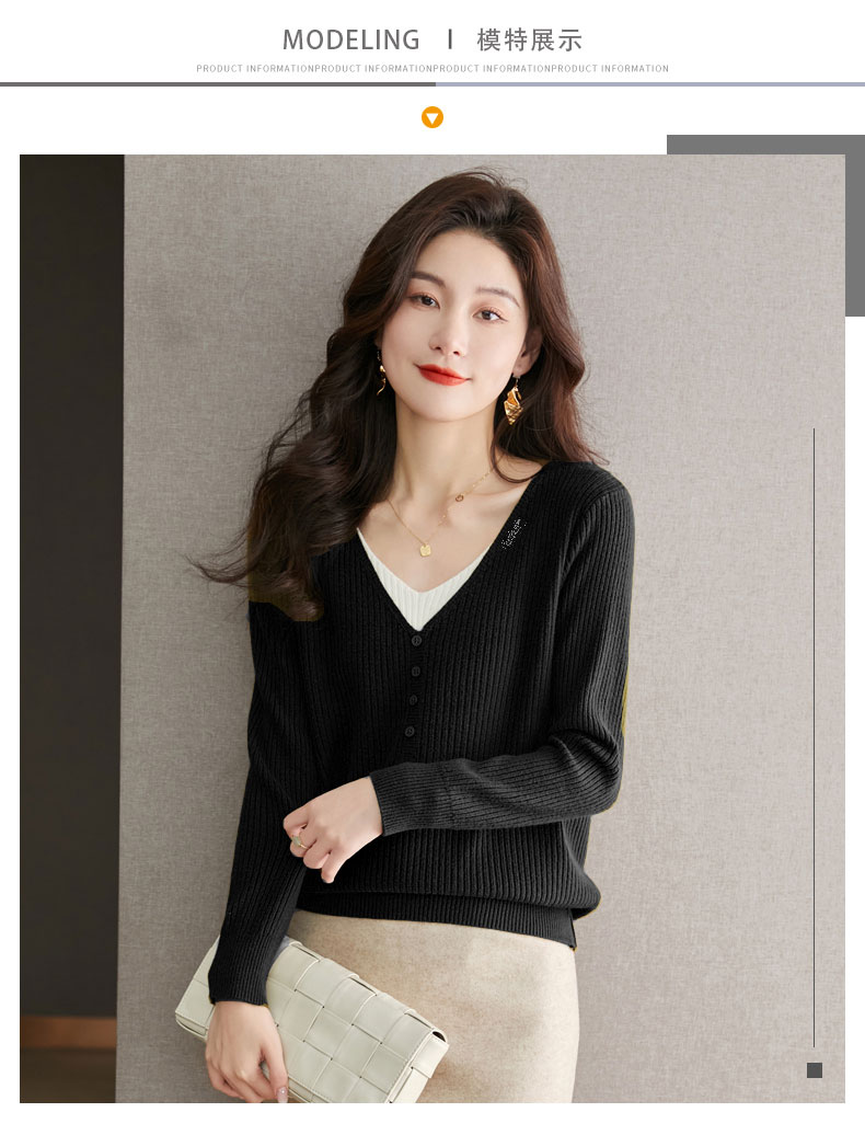 半身缘女装 秋季V领假两件装饰内搭针织打底衫毛衣JL002