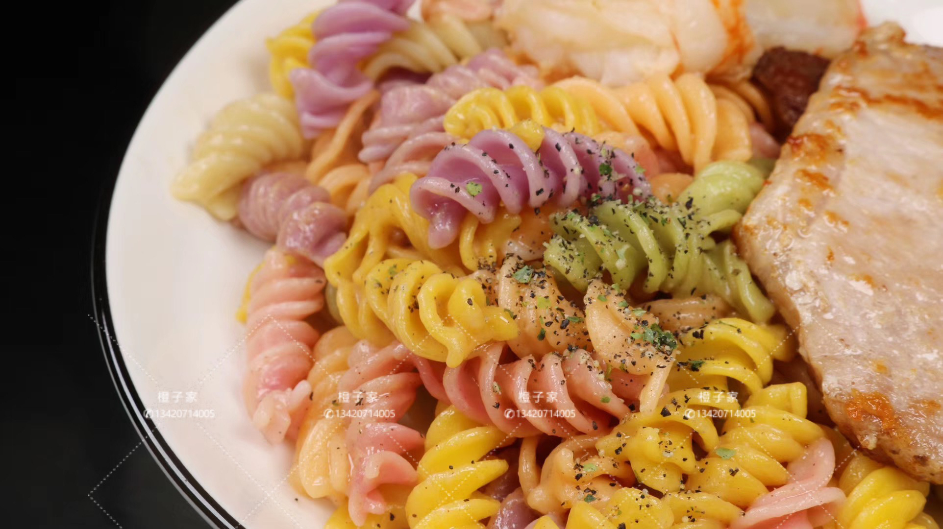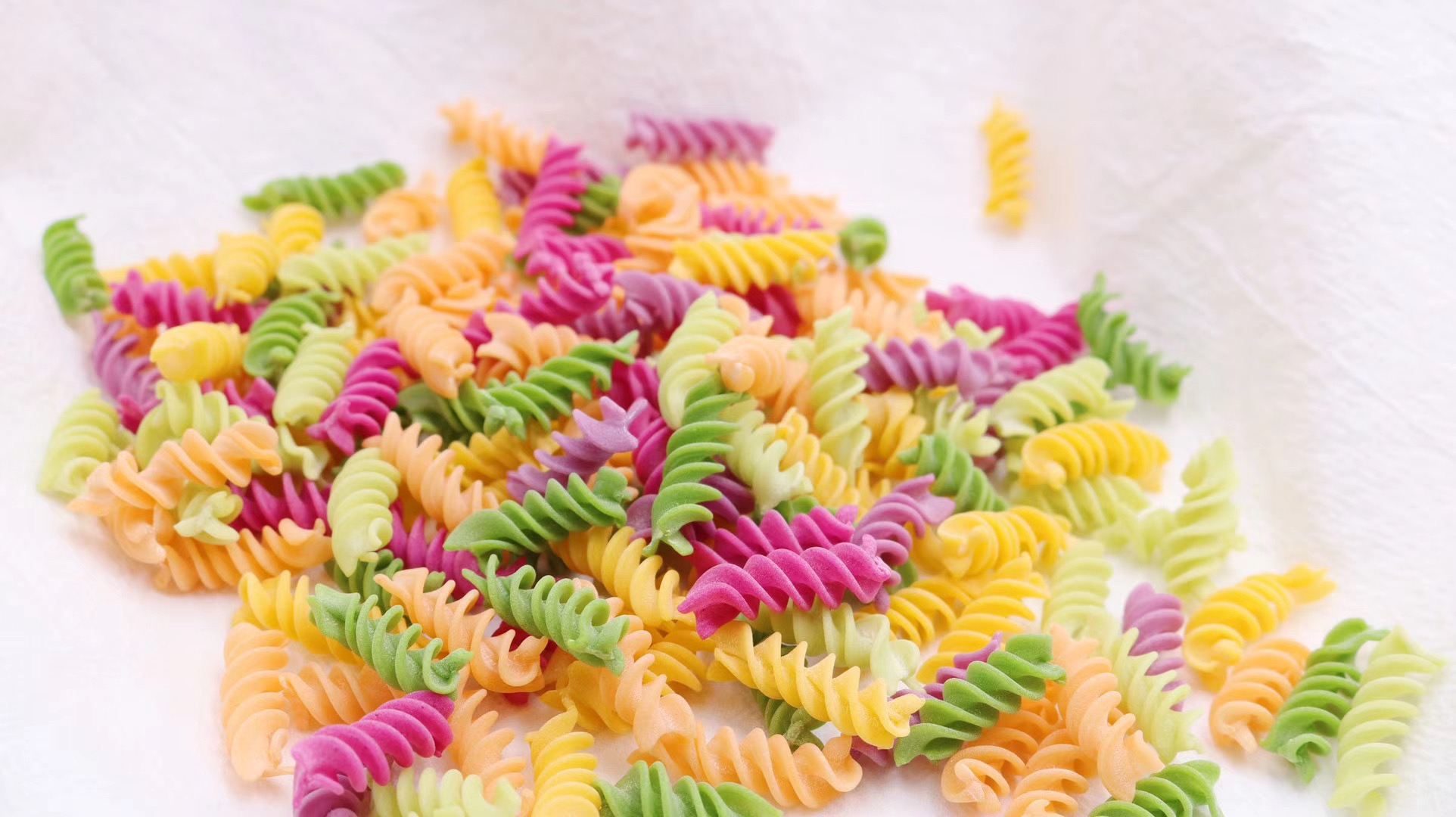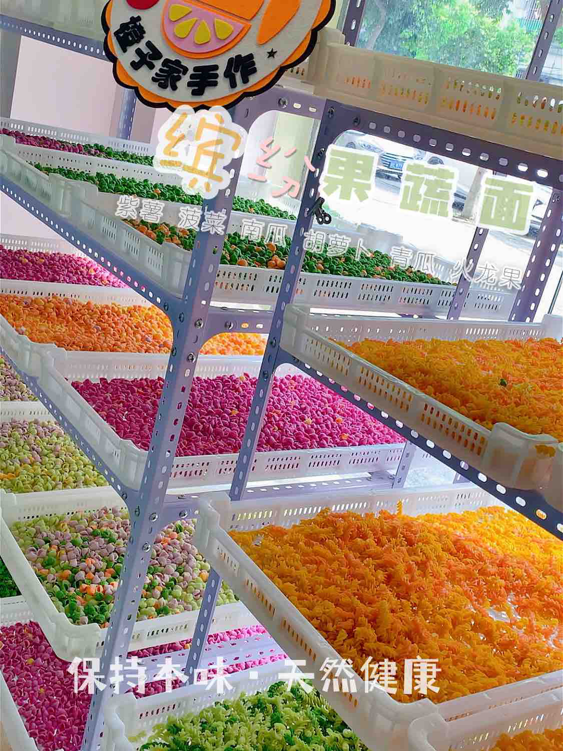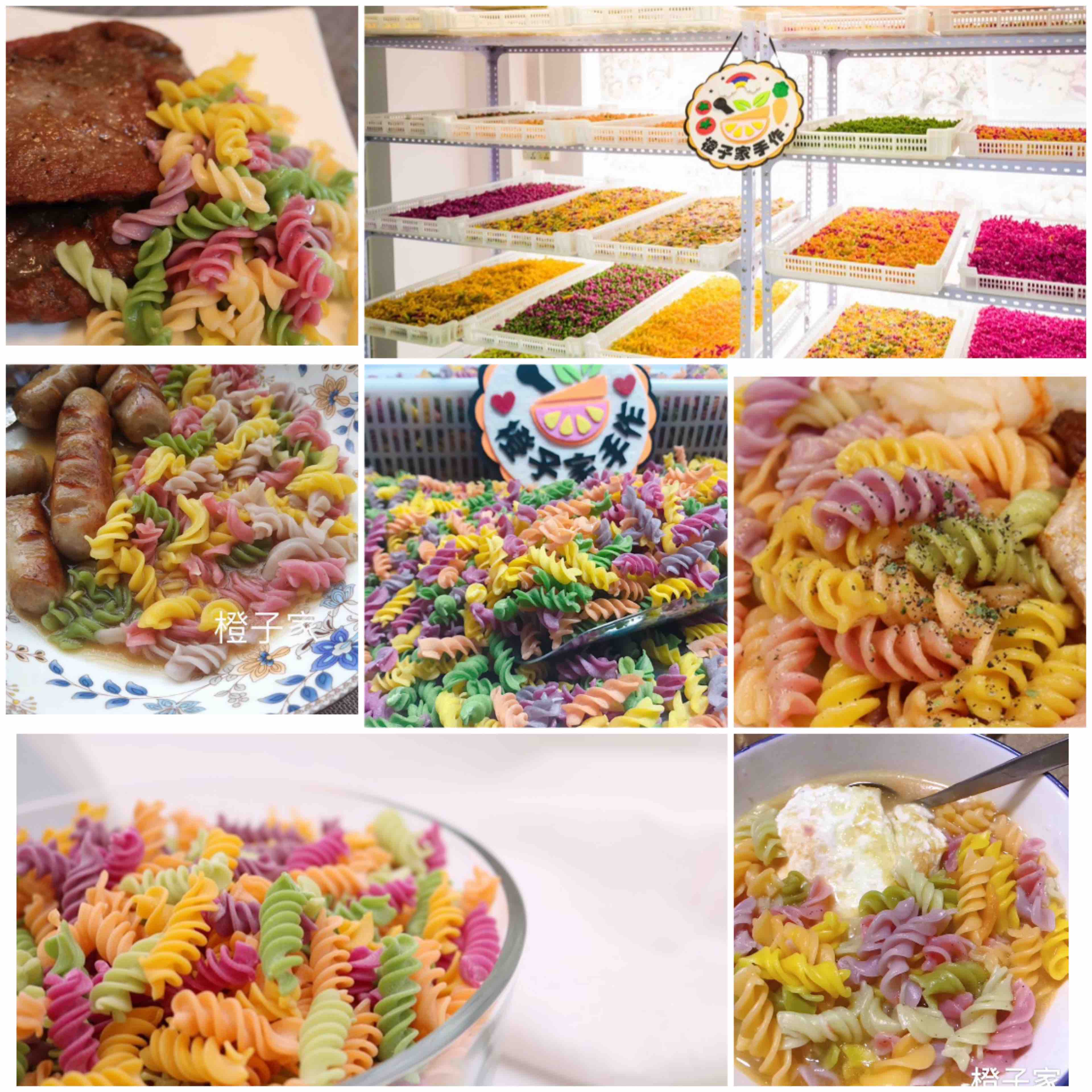 【原材料】优质小麦粉、新鲜果蔬泥。其中红色(红心火龙果/甜菜根),绿色(菠菜/黄瓜),紫色(紫薯),橙色(胡萝卜),黄色(南瓜),黑色(黑芝麻)。