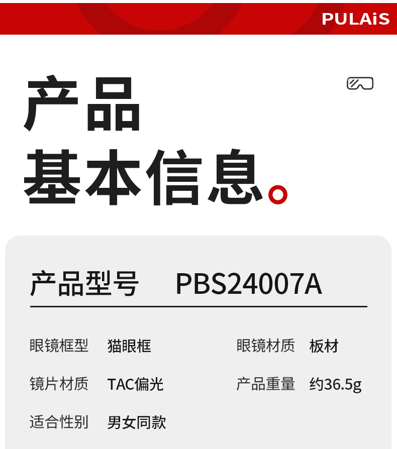 普莱斯新款太阳镜PBS24007A 新潮猫眼素颜神器 优质板材镜框 TAC偏光镜片 修颜宽边镜腿 男女同款 四色可选