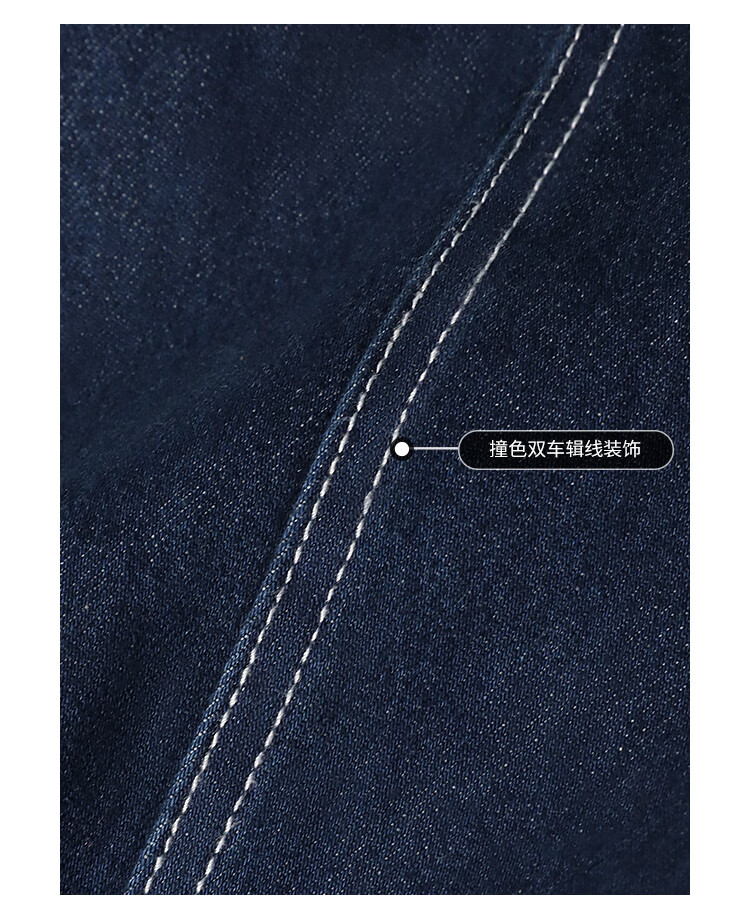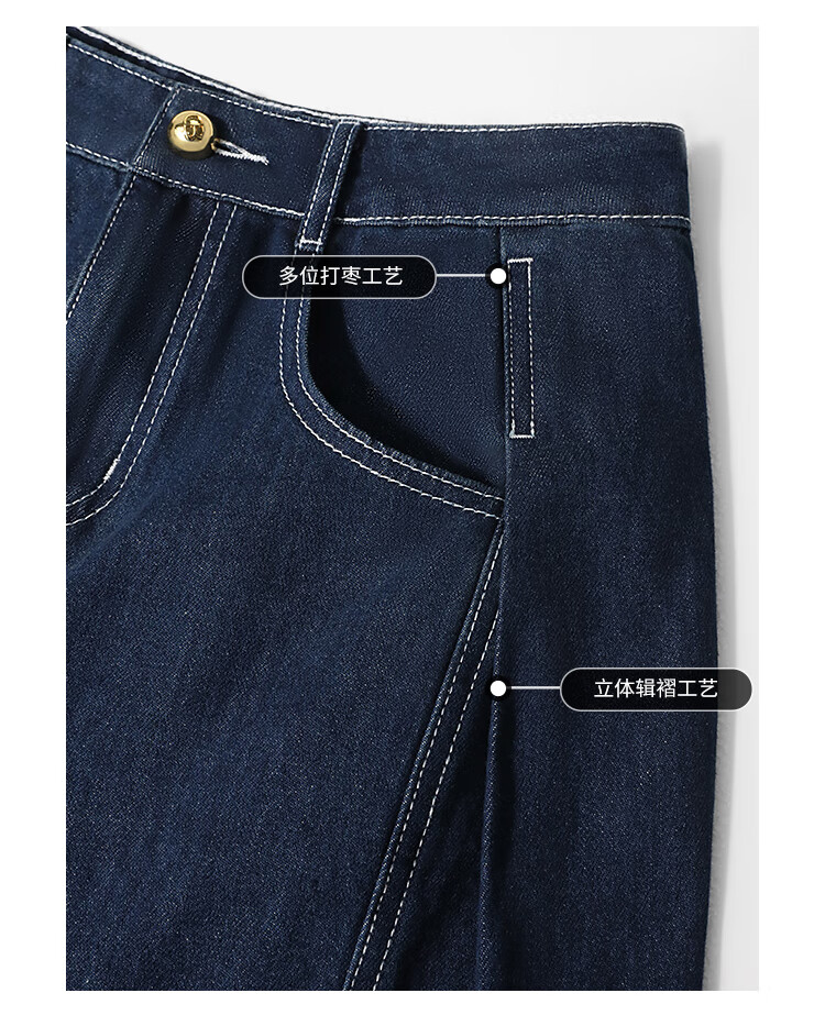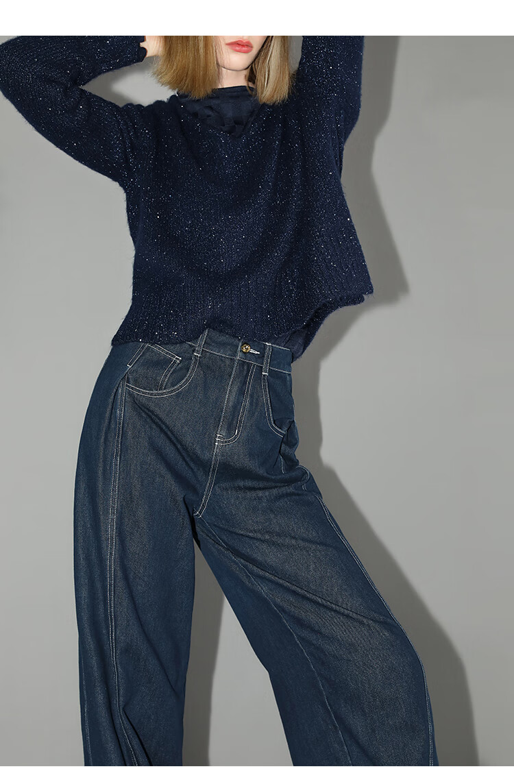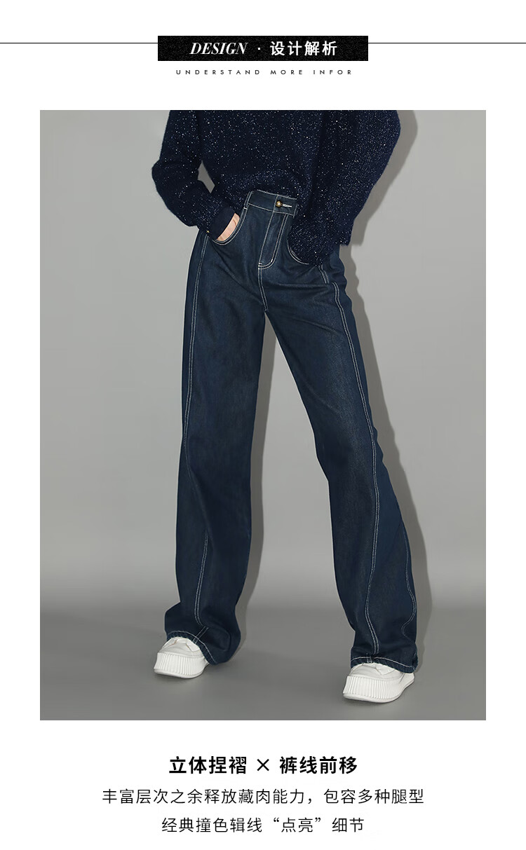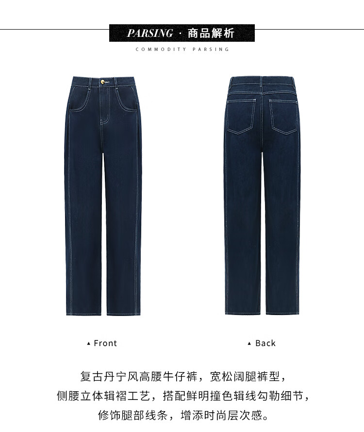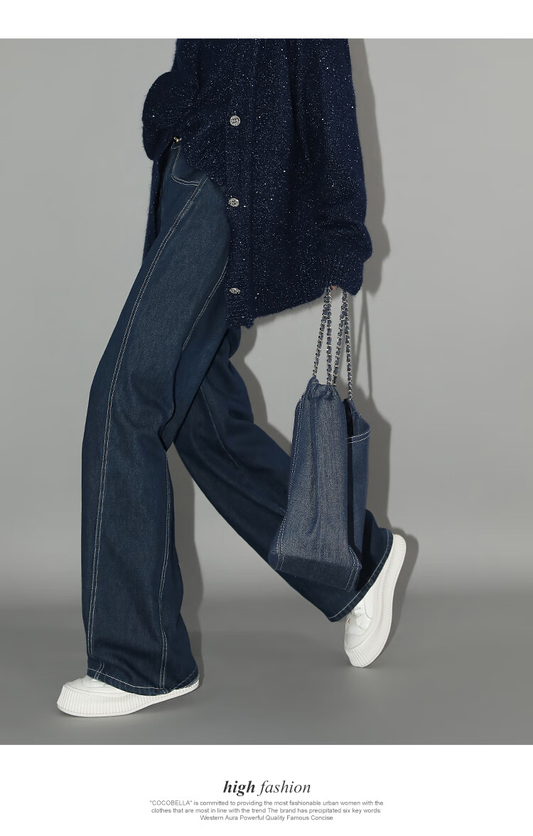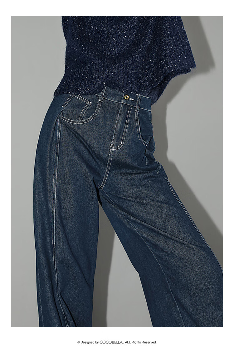 【秒杀】COCOBELLA复古撞色线高腰捏褶牛仔裤女磨毛加厚阔腿裤DN3002