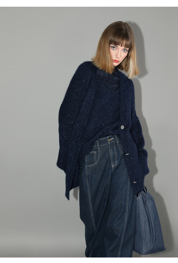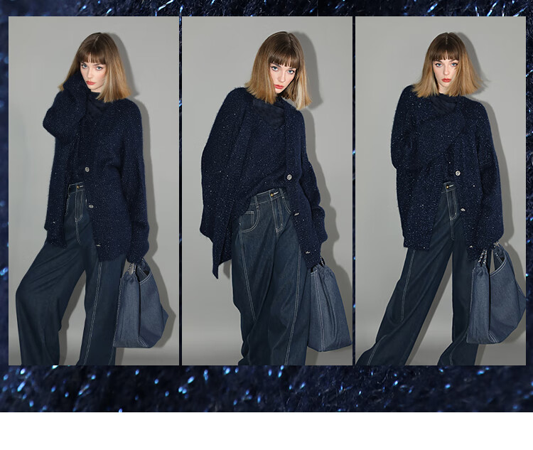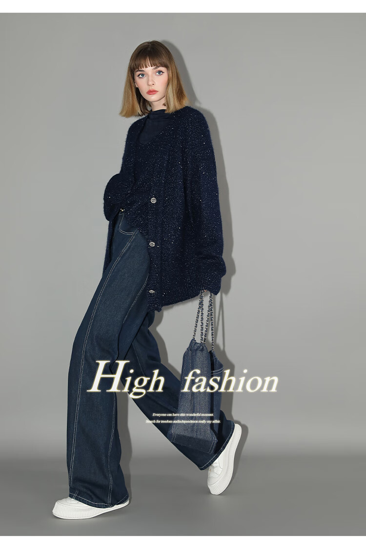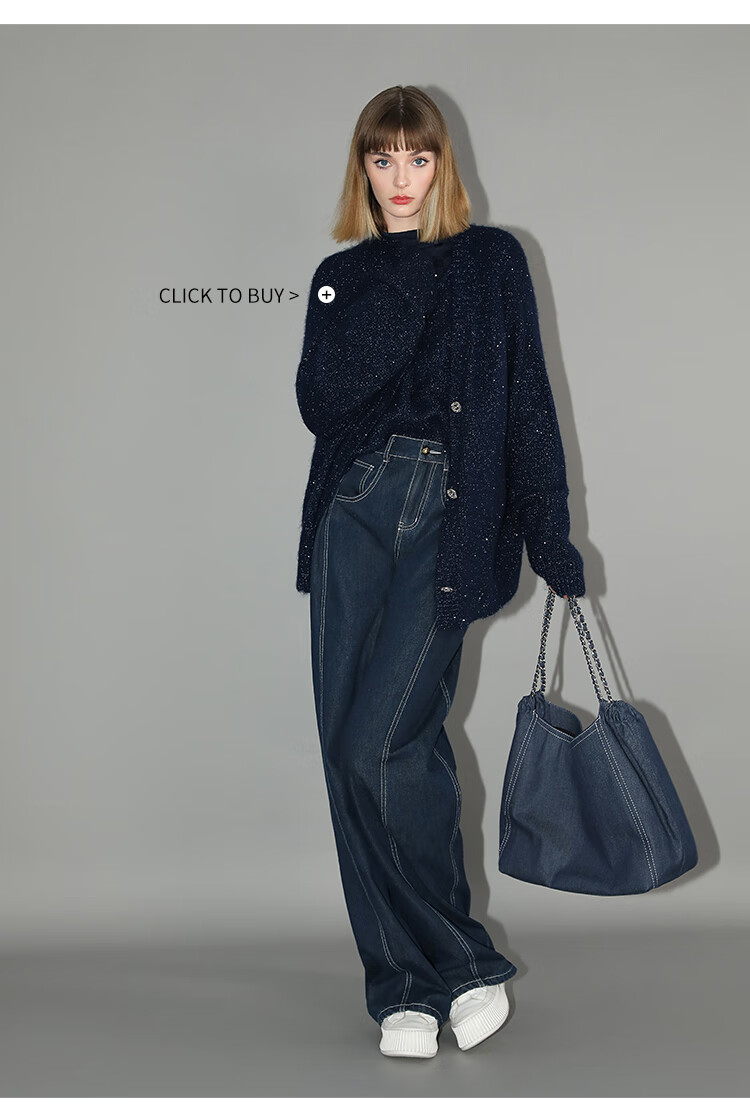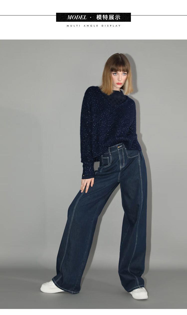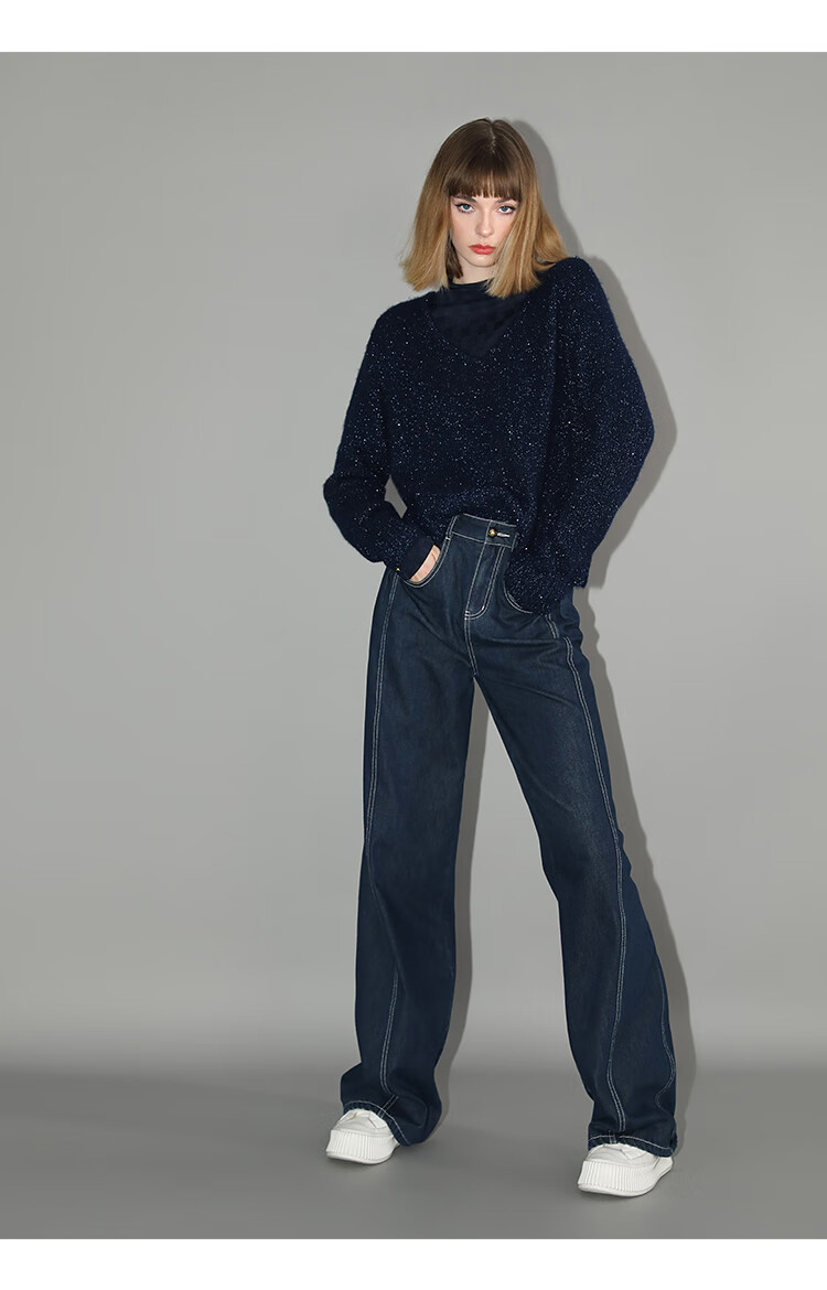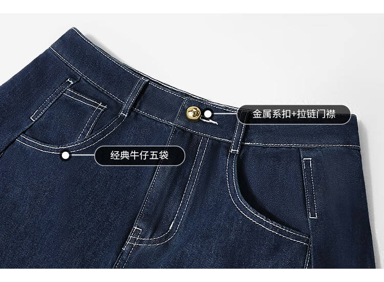【秒杀】COCOBELLA复古撞色线高腰捏褶牛仔裤女磨毛加厚阔腿裤DN3002