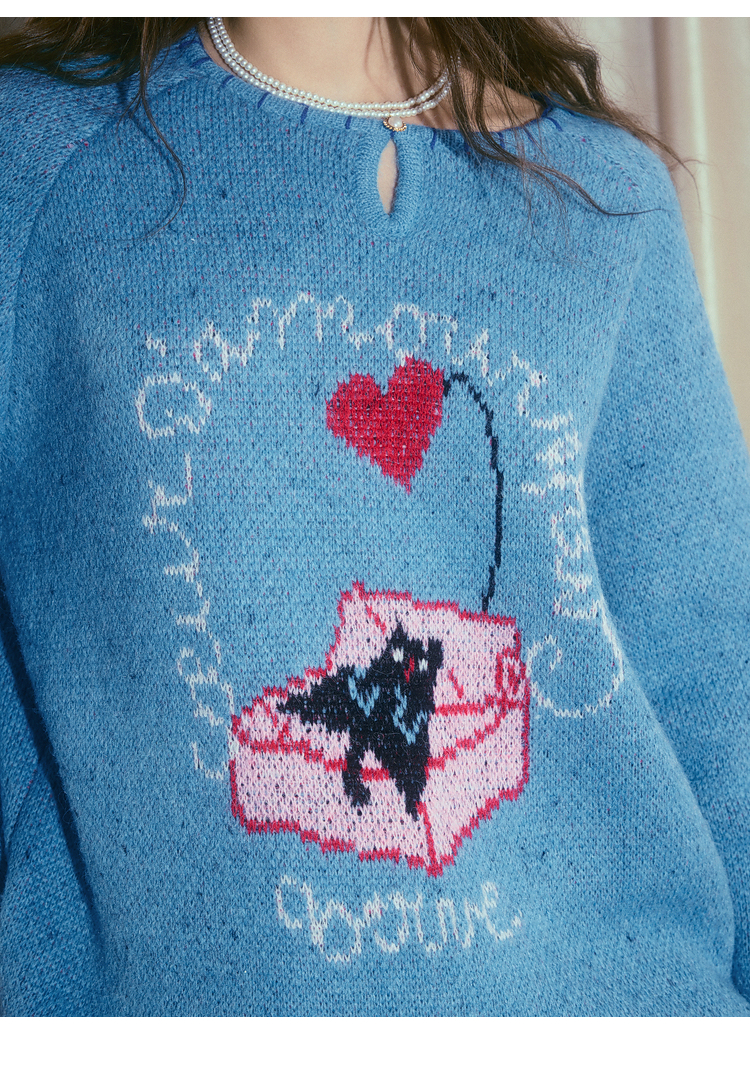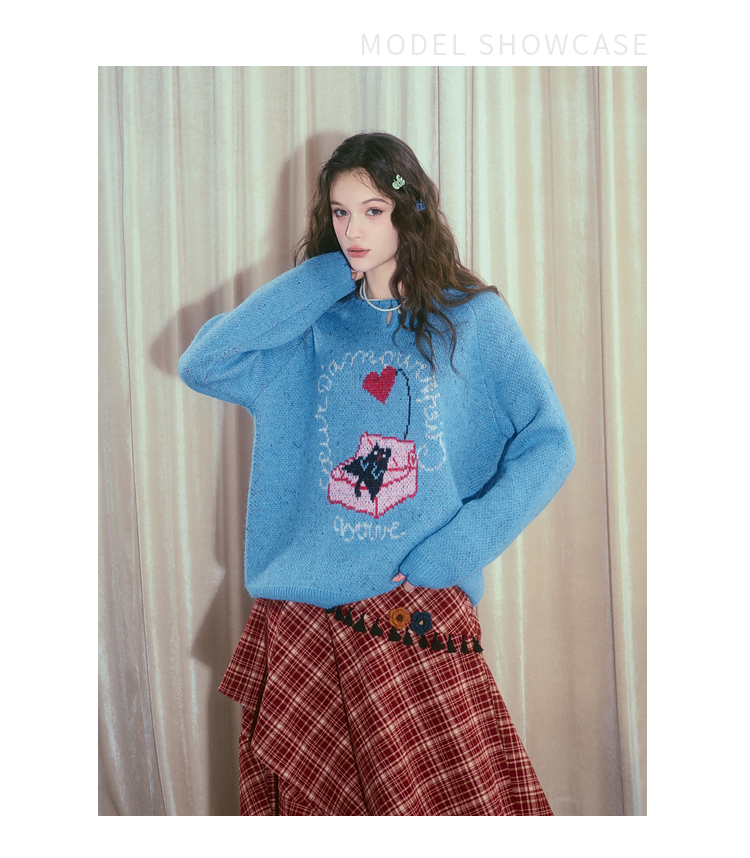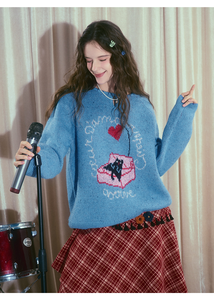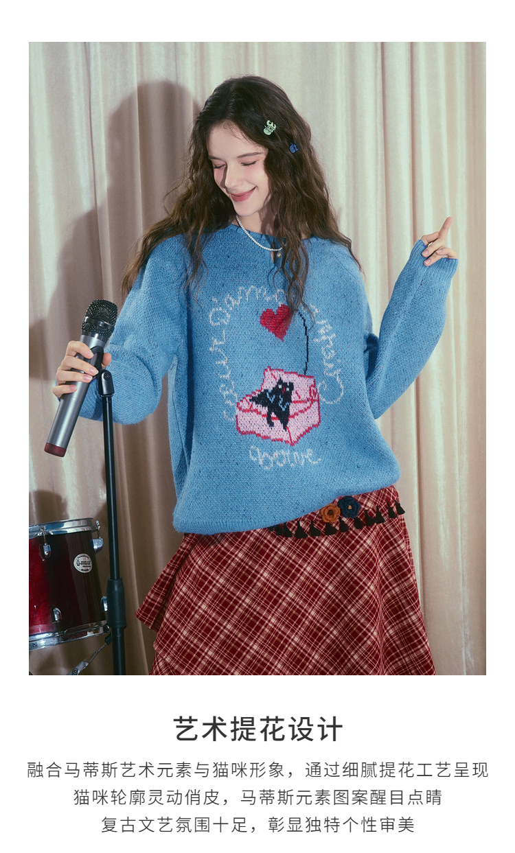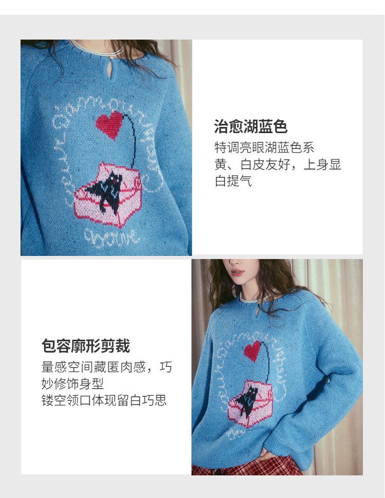 两三事 晴空絮语 2025冬季新款猫咪爱心图案镂空圆领套头毛衣女