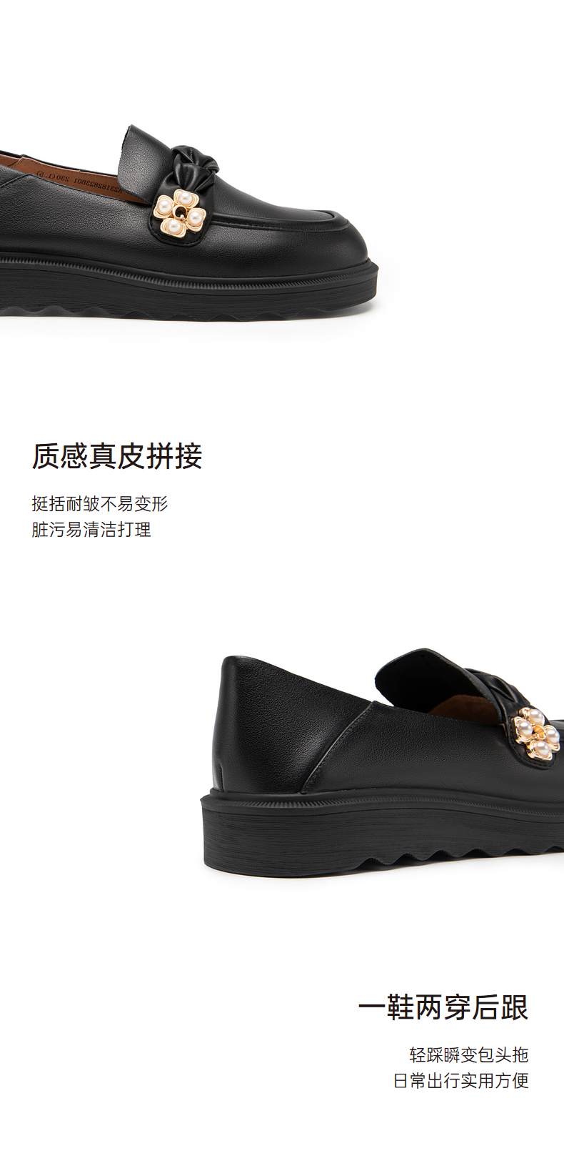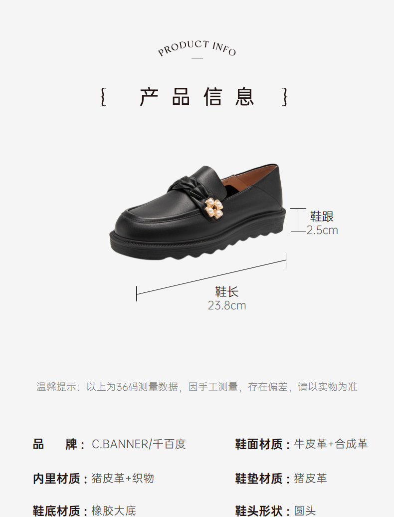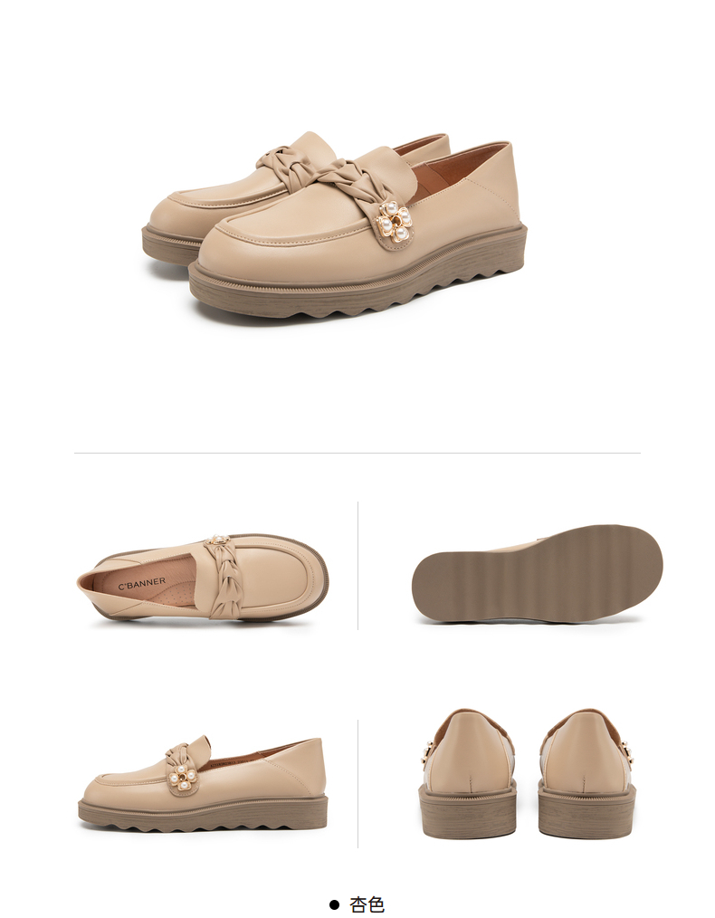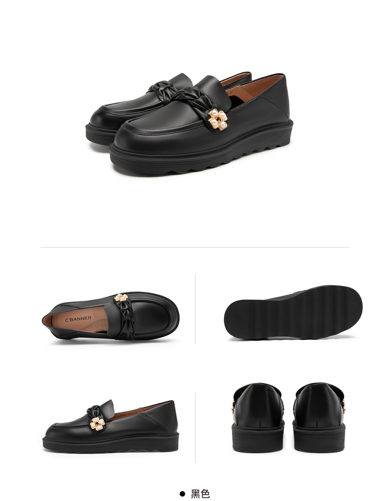 千百度女鞋春秋珍珠扣饰乐福鞋豆豆鞋平底小皮鞋通勤舒适 A23182823