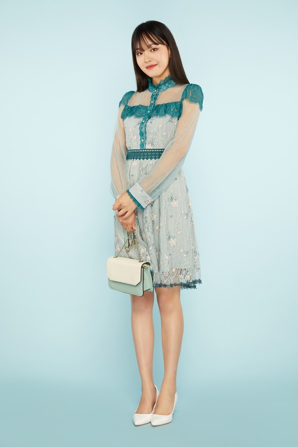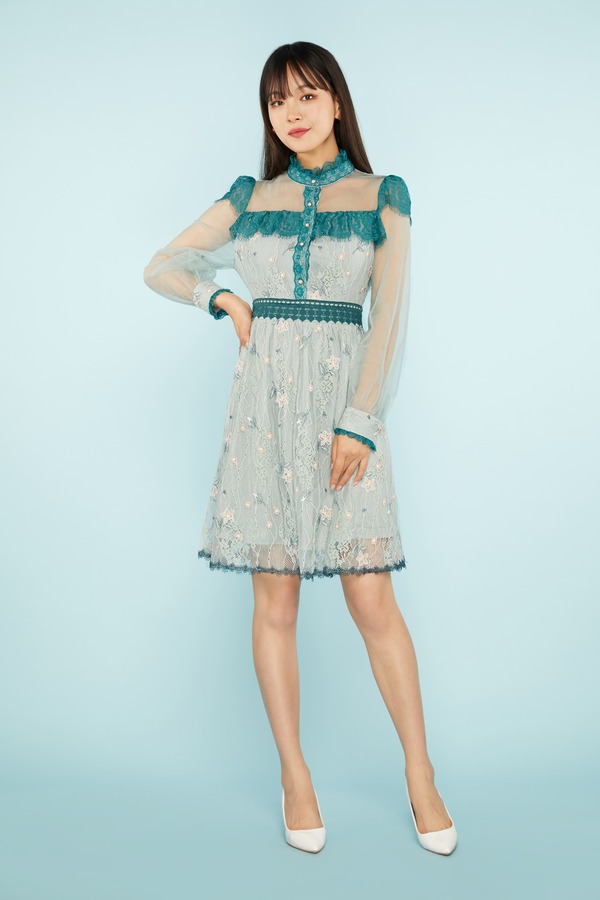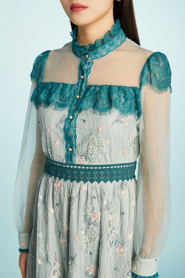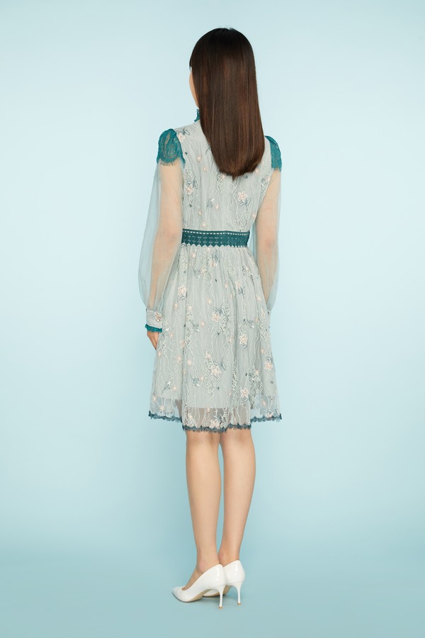 ELLA JADE 绿色花边刺绣蕾丝收腰连衣裙 11424