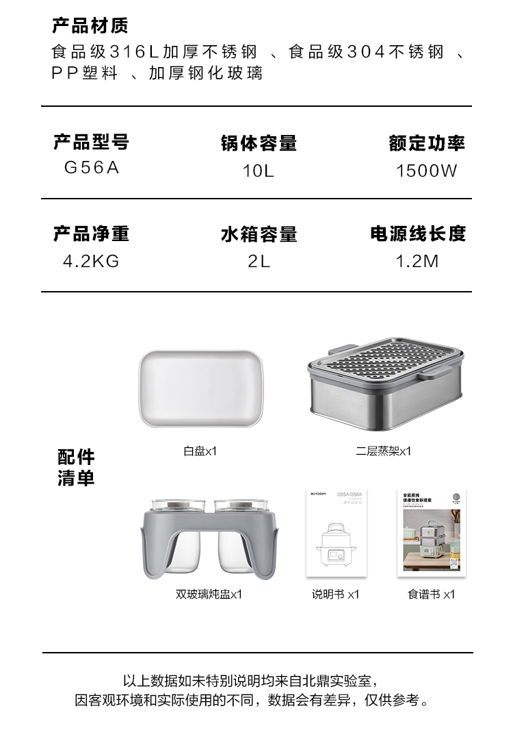 【专柜-北鼎】北鼎双层蒸炖锅电蒸锅多功能家用电炖锅10L隔水炖盅全自动预约蒸煮锅G56A