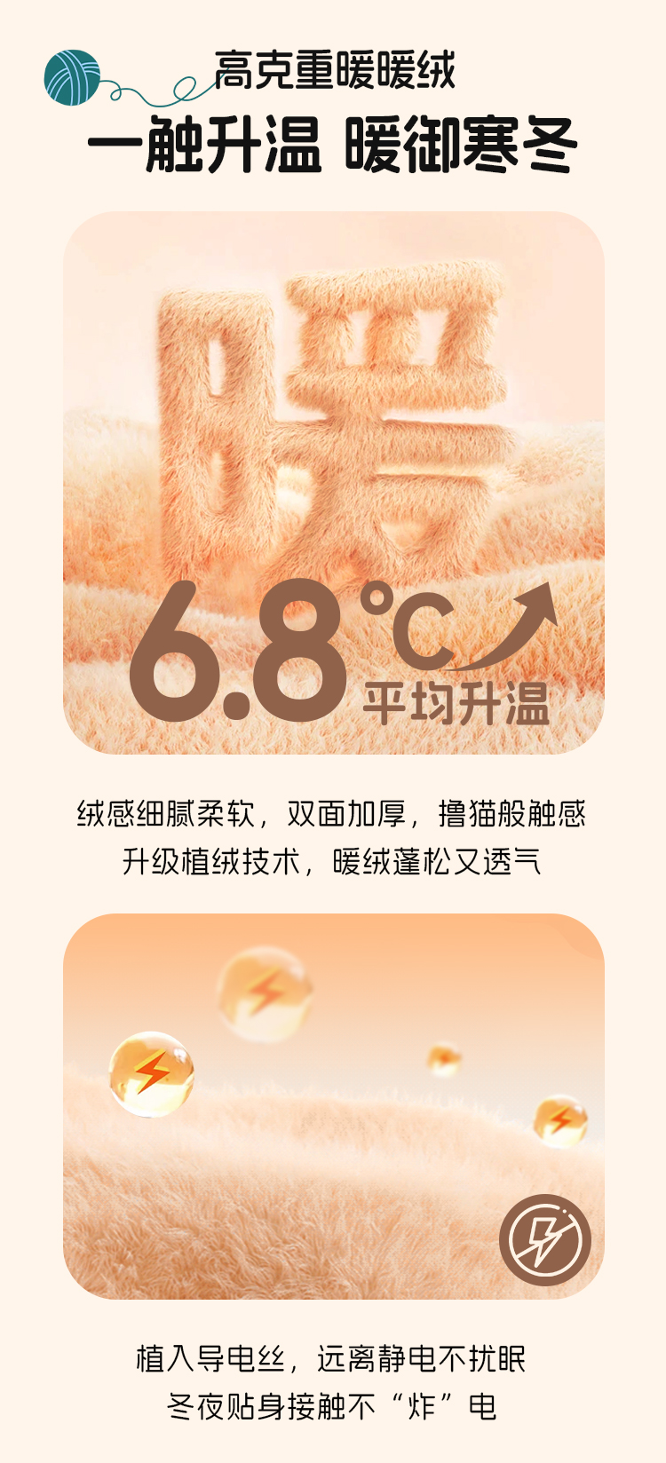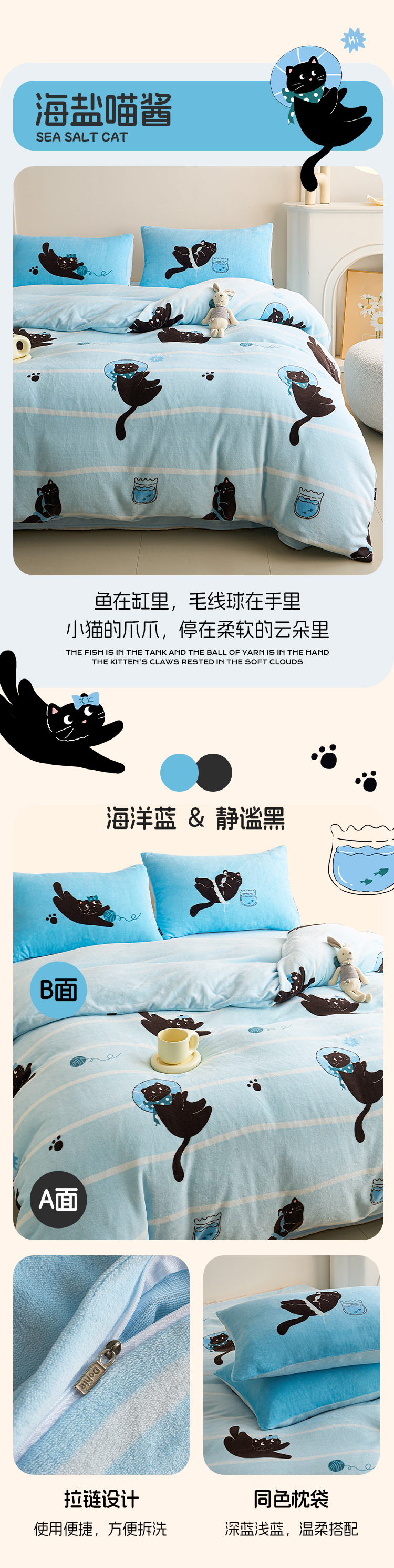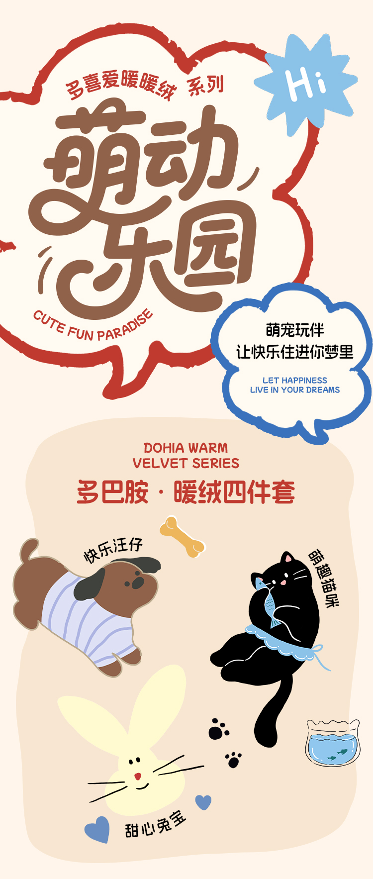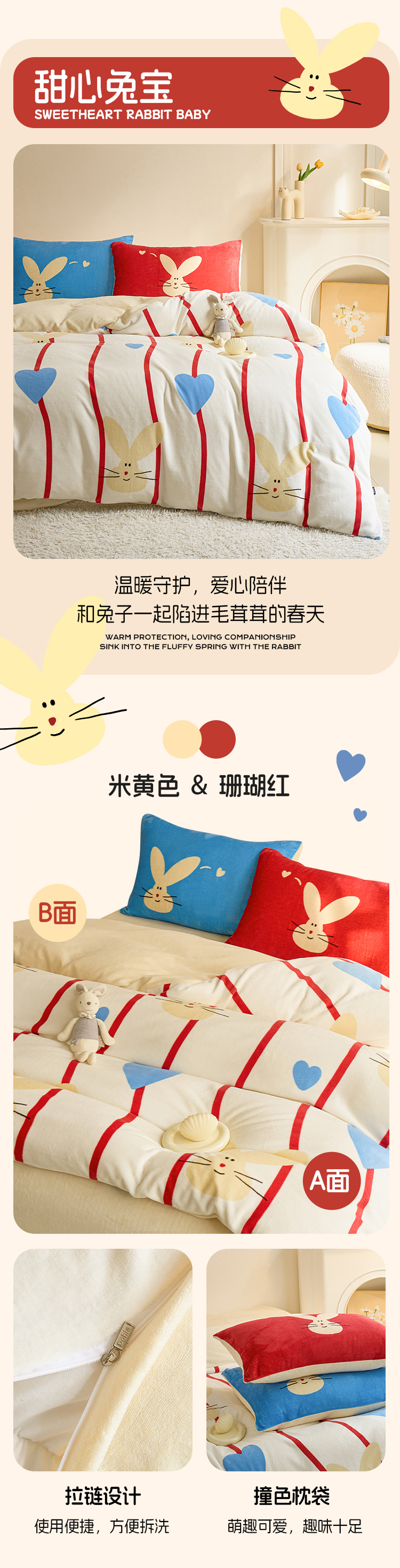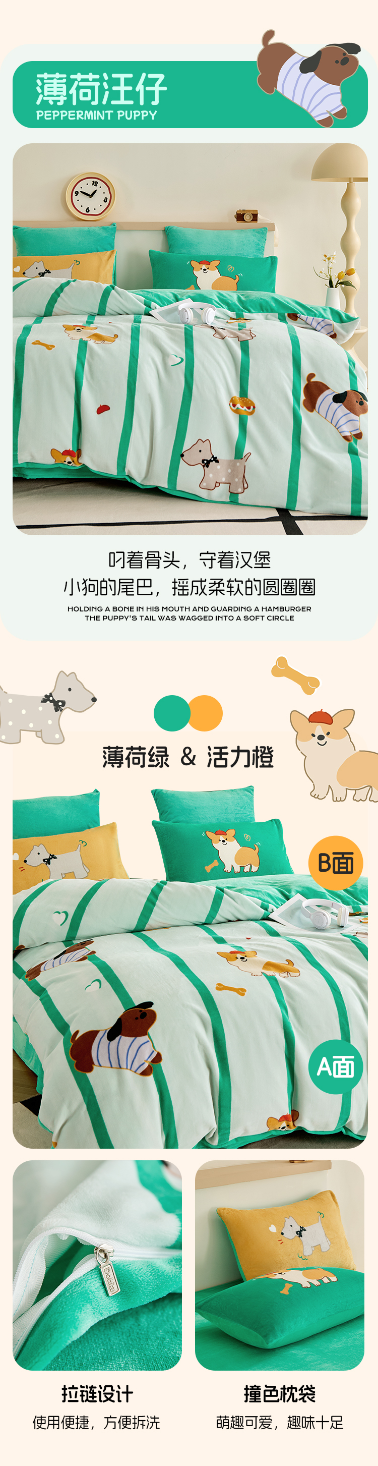 多喜爱 暖暖绒保暖三/四件套海盐喵酱/甜心兔宝/薄荷汪仔hl【高克重暖绒】【6.8度升温】【双面加厚】萌趣卡通 防静电 三款可选 拉链设计/FX