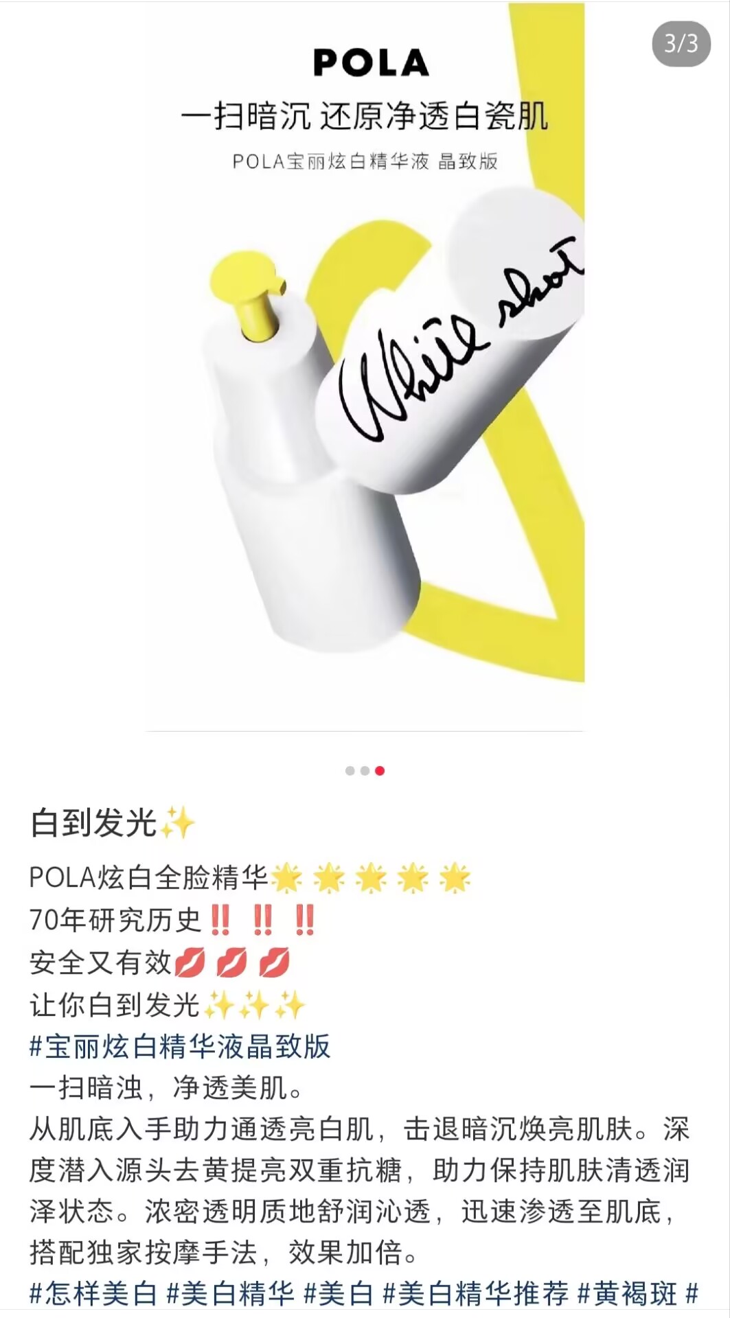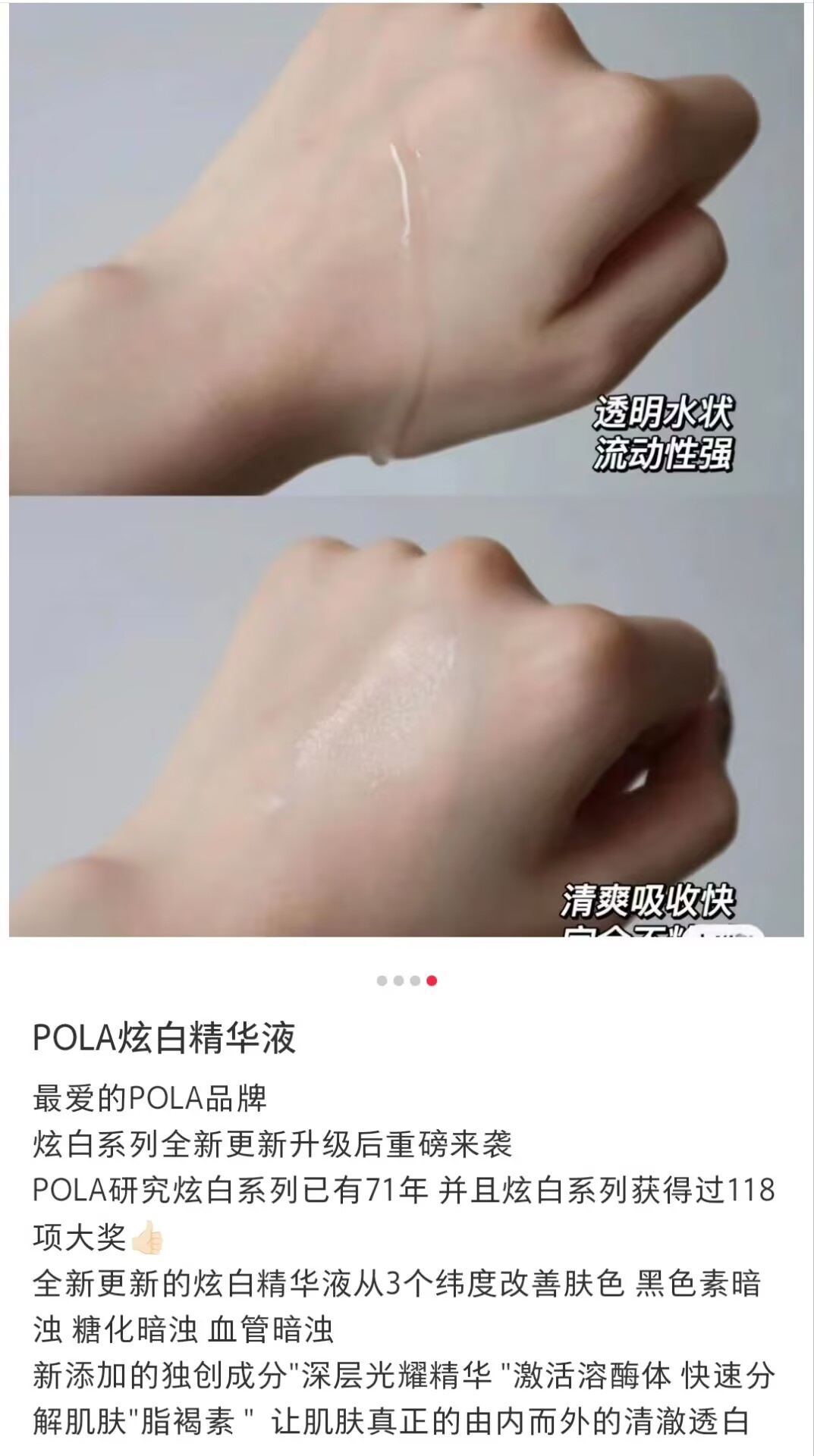 【使用方法】早晚化妆水後、取少量(米粒一颗左右)在手心,在脸部轻轻的涂匀。pola美白精华非常温润不刺激,强烈推荐,配合局部淡斑精华,美白丸内外搭配效果最佳