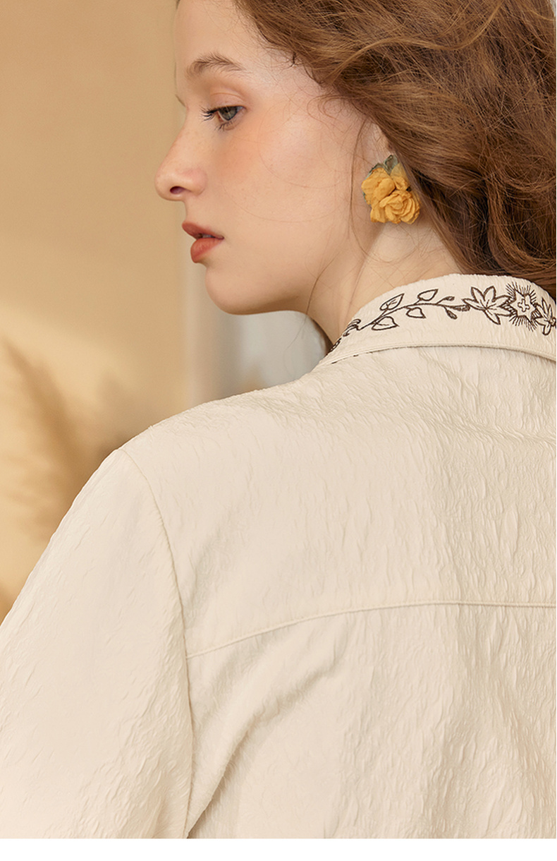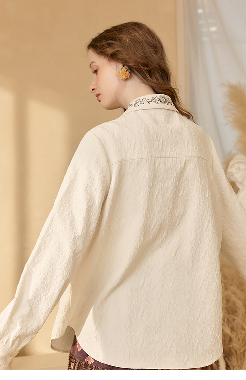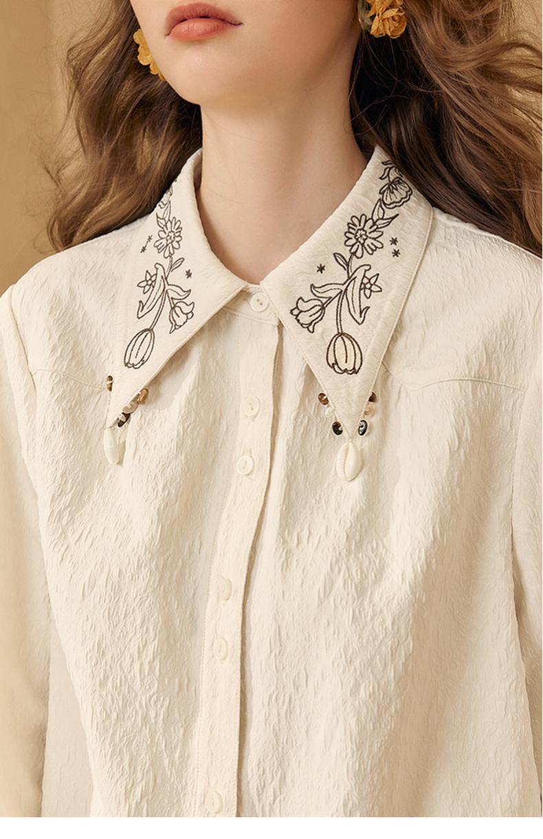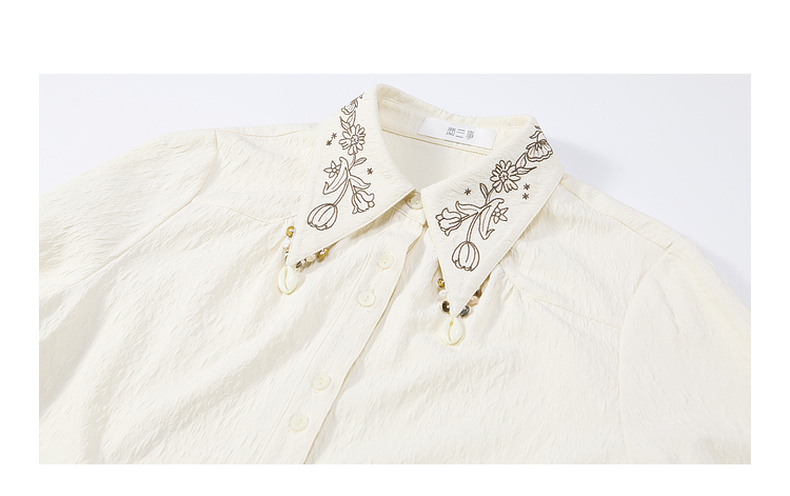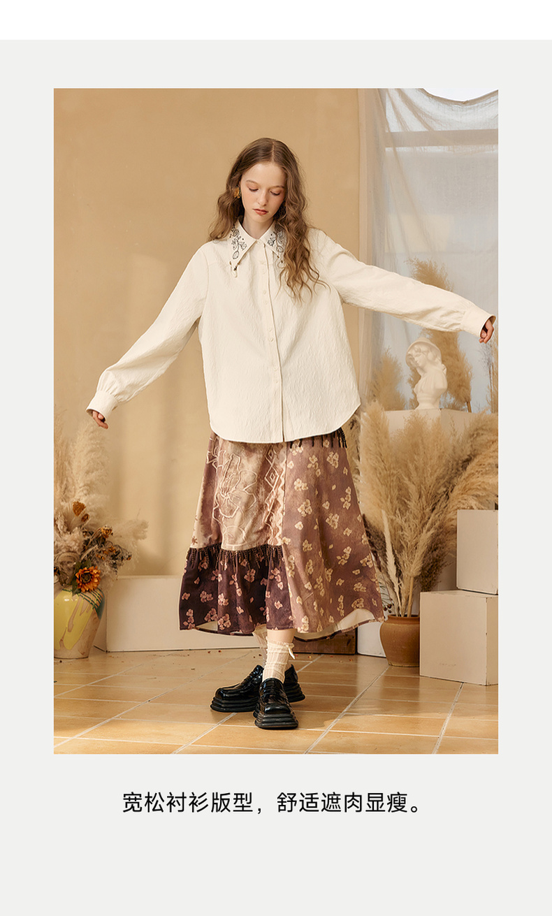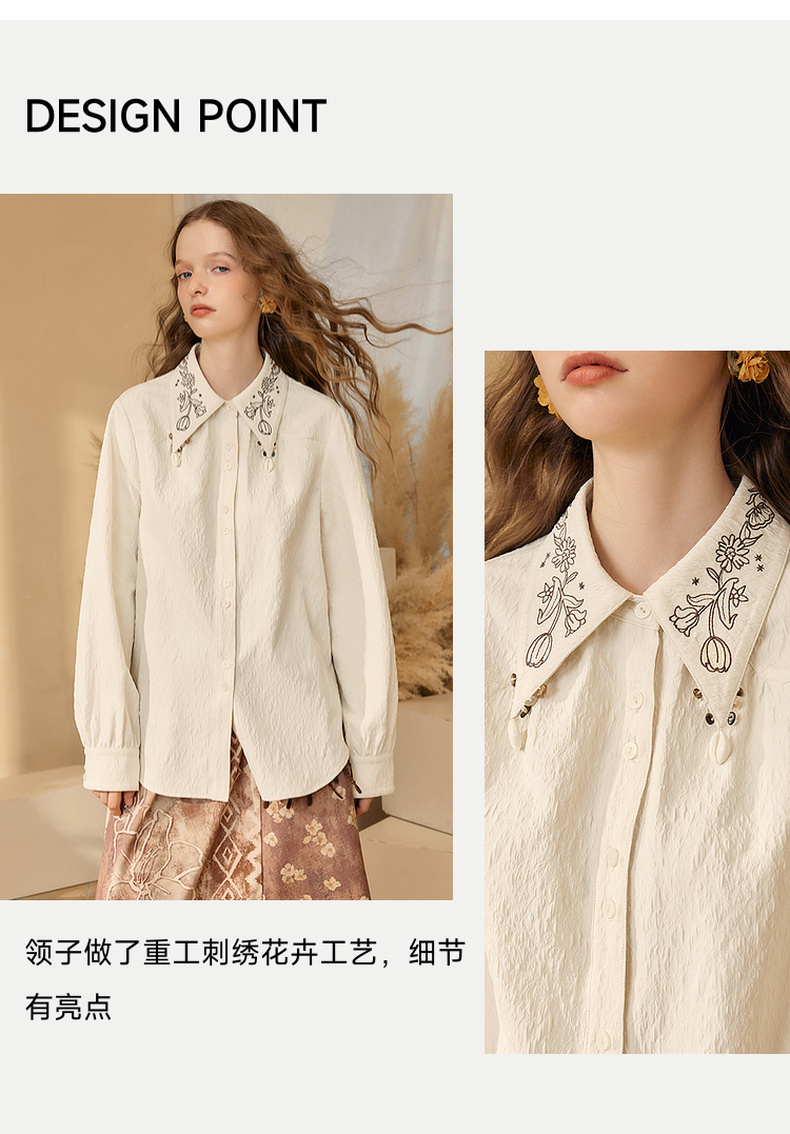 两三事 风花光尘 2024冬季新款文艺风绣花翻领纽扣装饰长袖衬衫女